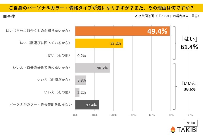 全国の10代~60代の男女を対象とした「ご自身のパーソナルカラー・骨格タイプが気になりますか?また、その理由は何ですか?」というアンケートを行ったところ、「はい」と回答された方が61.4%という結果になりました。その理由として最も多かったのが「自分に似合うものを知りたいから」で49.4%、次いで「服選びに困っているから」で25.2%という結果になりました。また、その他の理由として「小柄だから」という回答が得られています。