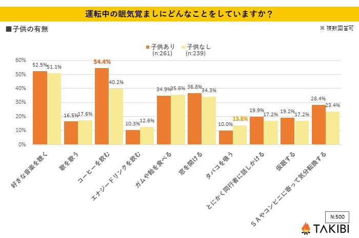 男性の回答が上回った項目を見てみると、コーヒーやエナジードリンクを飲む、タバコを吸う、など何かを摂取して眠気対策を取っているのに対し、女性では、とにかく同行者に話しかける、窓を開けるなど、環境を変えて対策を取る傾向にあるようです。