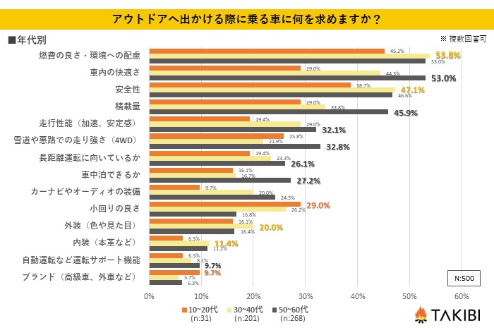 キャンプやグランピングを中心としたアウトドア総合情報サイト「TAKIBI」の運営をおこなう株式会社フォーイットは、全国の10代~60代までの男女500人を対象に車に関するアンケートを実施し、男女別・年代別等の特徴についてまとめました。