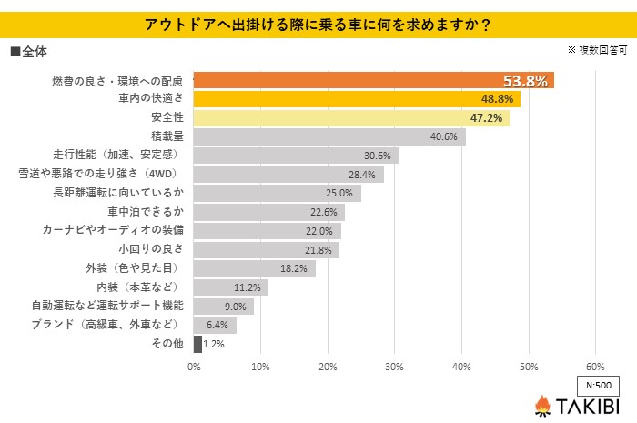 全国の10代~60代の男女を対象とした「アウトドアへ出掛ける際に乗る車に何を求めますか?」というアンケートを行ったところ、最も多かった回答は「燃費の良さ・環境への配慮」で53.8%という結果になりました。次いで「車内の快適さ」が48.8%、「安全性」が47.2%となっております。また、「その他」として「AC1000Vコンセントがあること」という回答が得られています。