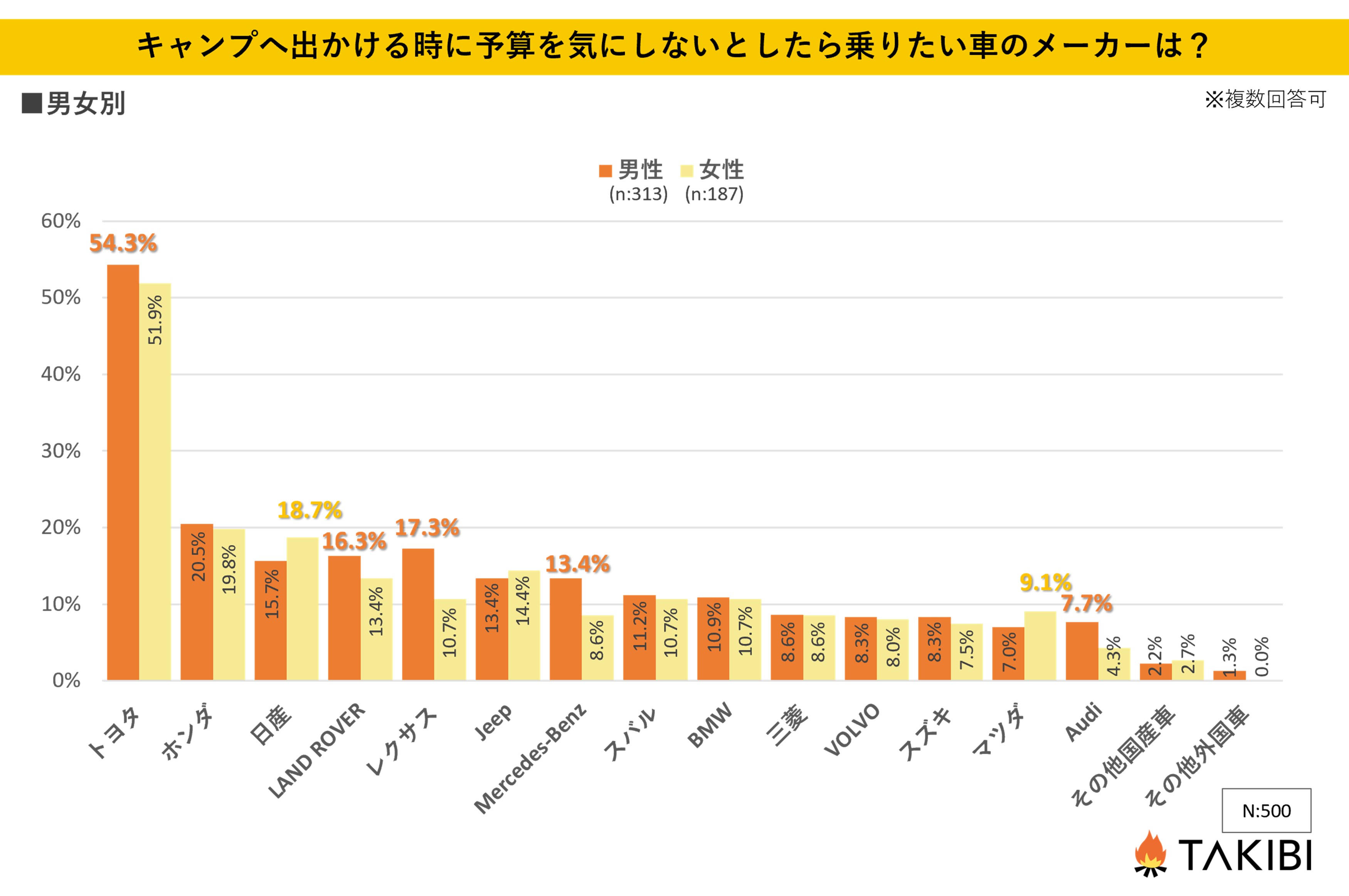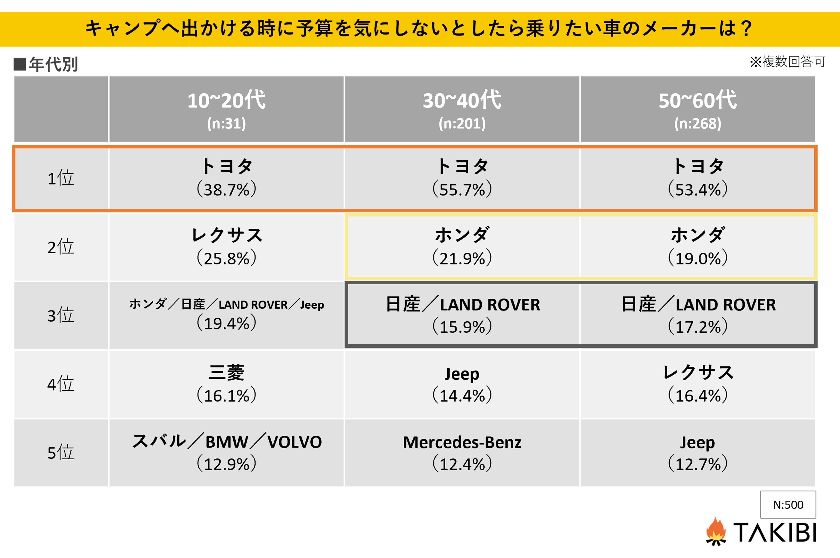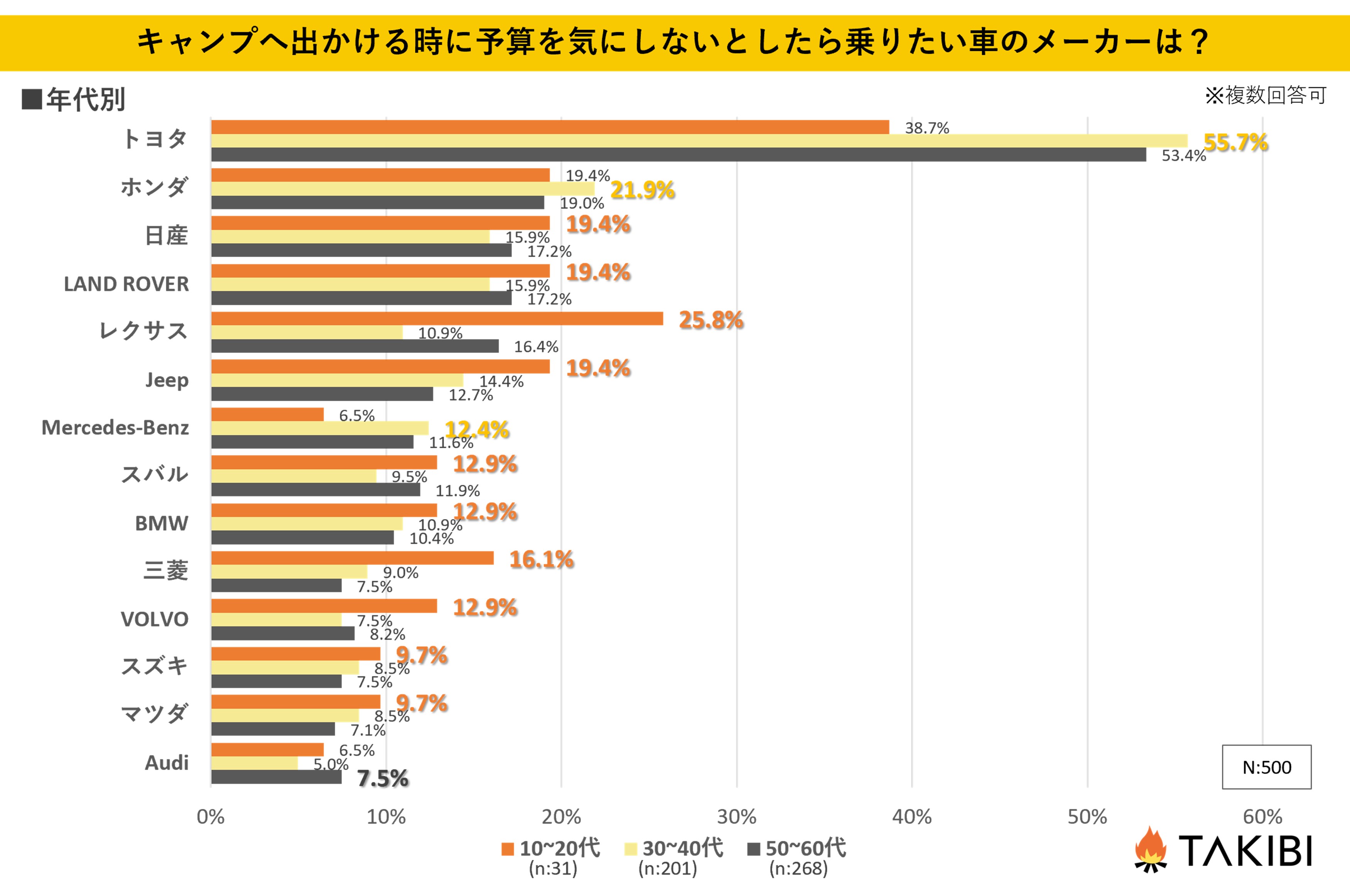 【質問:キャンプへ出かける時に予算を気にしないとしたら乗りたい車のメーカーは何ですか?】