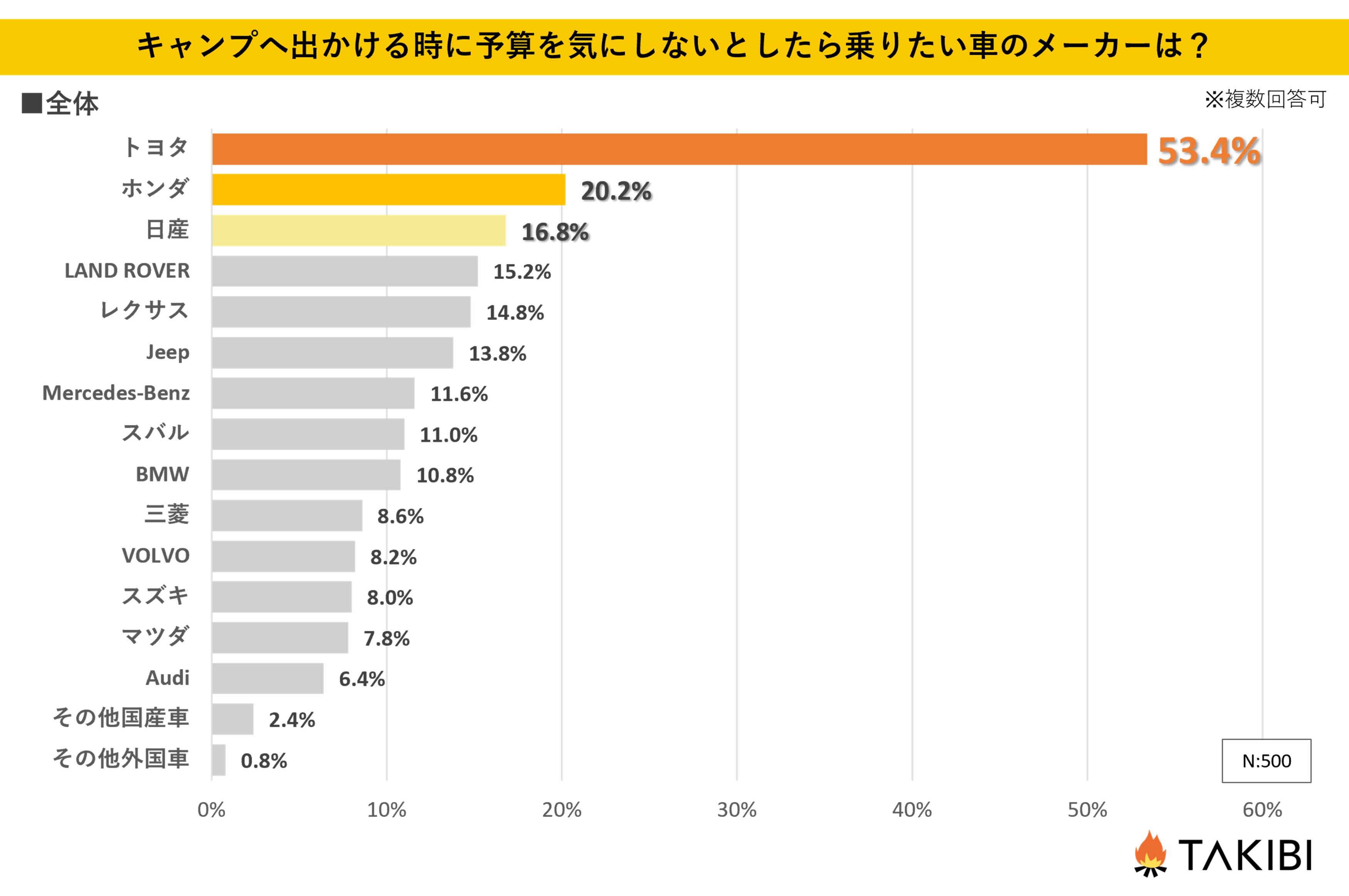 全国の10代~60代の男女を対象とした「キャンプへ出かける時に予算を気にしないとしたら乗りたい車のメーカーは何ですか?」というアンケートを行ったところ、最も多かった回答は「トヨタ」で53.4%という結果になりました。次いで、「ホンダ」が20.2%、「日産」が16.8%となっております。また、「その他」の回答として、国産車では「いすゞ」「ダイハツ」、外国車では「キャデラックエスカレード」「アルファロメオ」「ポルシェ」「フォルクスワーゲン」などの回答が得られています。