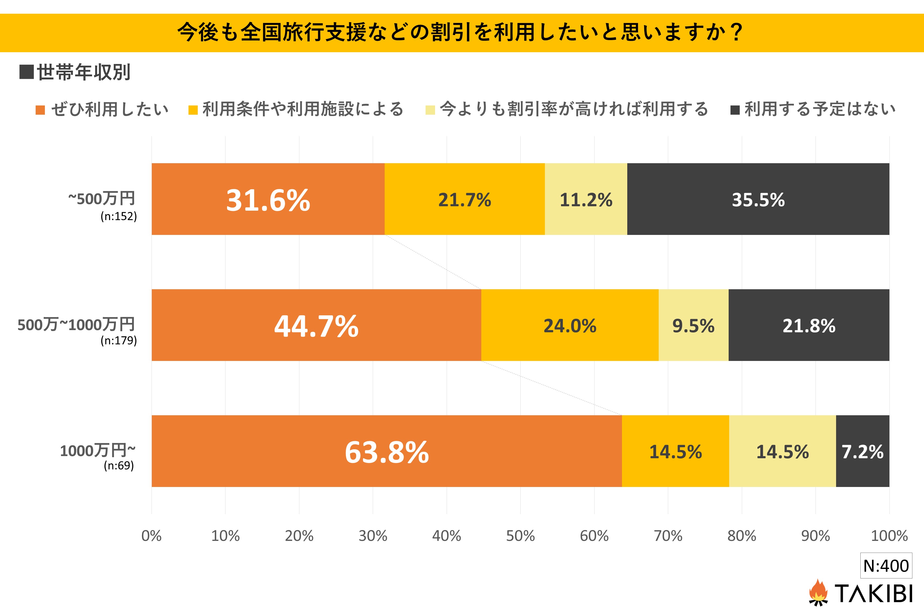 以前実施した、2022年の全国旅行支援の利用回数に関する調査https://www.takibi-reservation.style/media/questionnaire/100827/では、世帯年収1000万円以上の方の「3回以上利用した」という回答率が最も多く、実際に利用した結果そのお得さに気付きリピート利用に繋がっていることが推察されます。