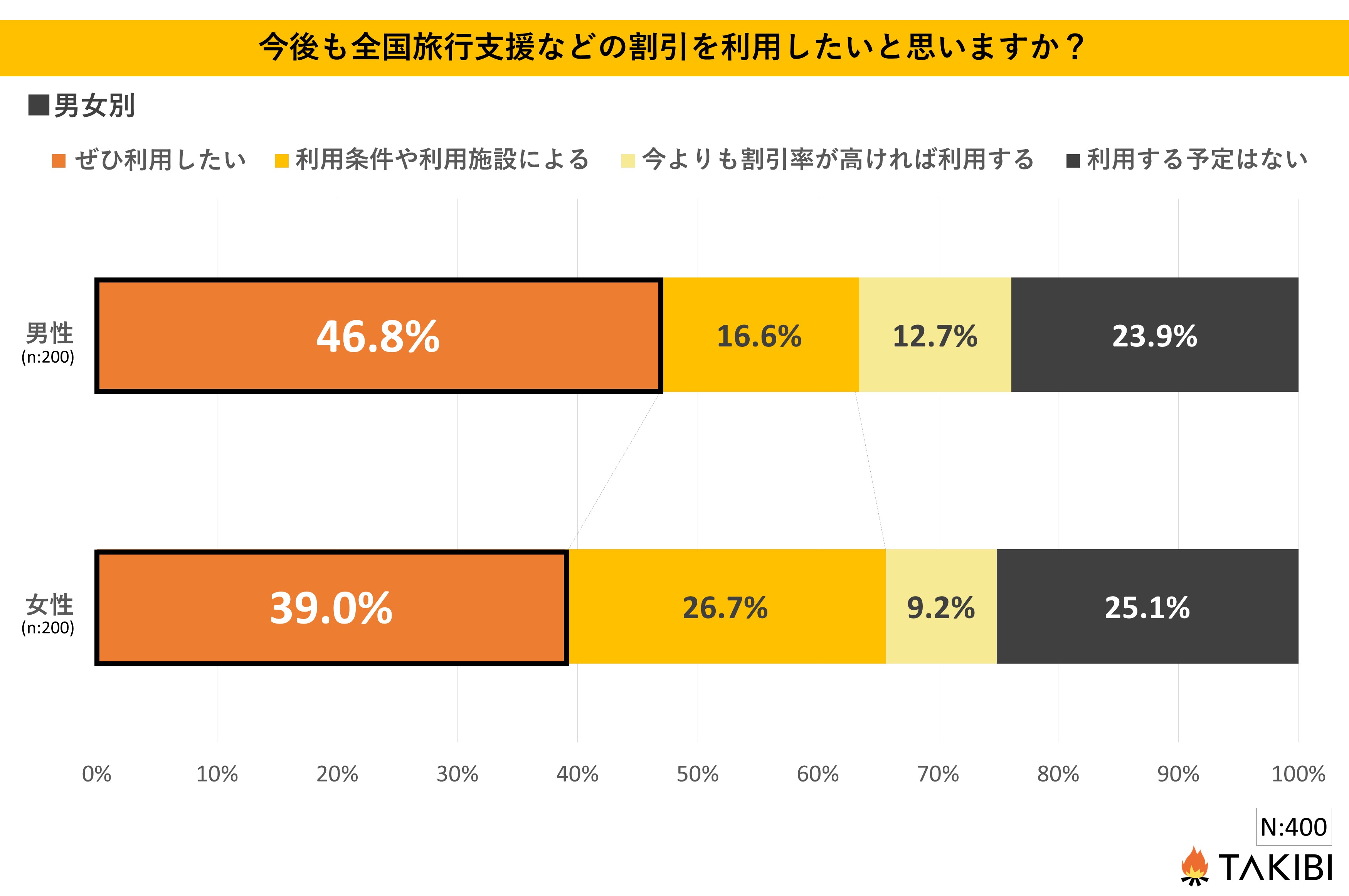 キャンプやグランピングを中心としたアウトドア総合情報サイト「TAKIBI」の運営をおこなう株式会社フォーイットは、全国の10代~60代までの男女400人を対象に全国旅行支援の利用に関するアンケートを実施し、男女別・世帯年収別等の特徴についてまとめました。