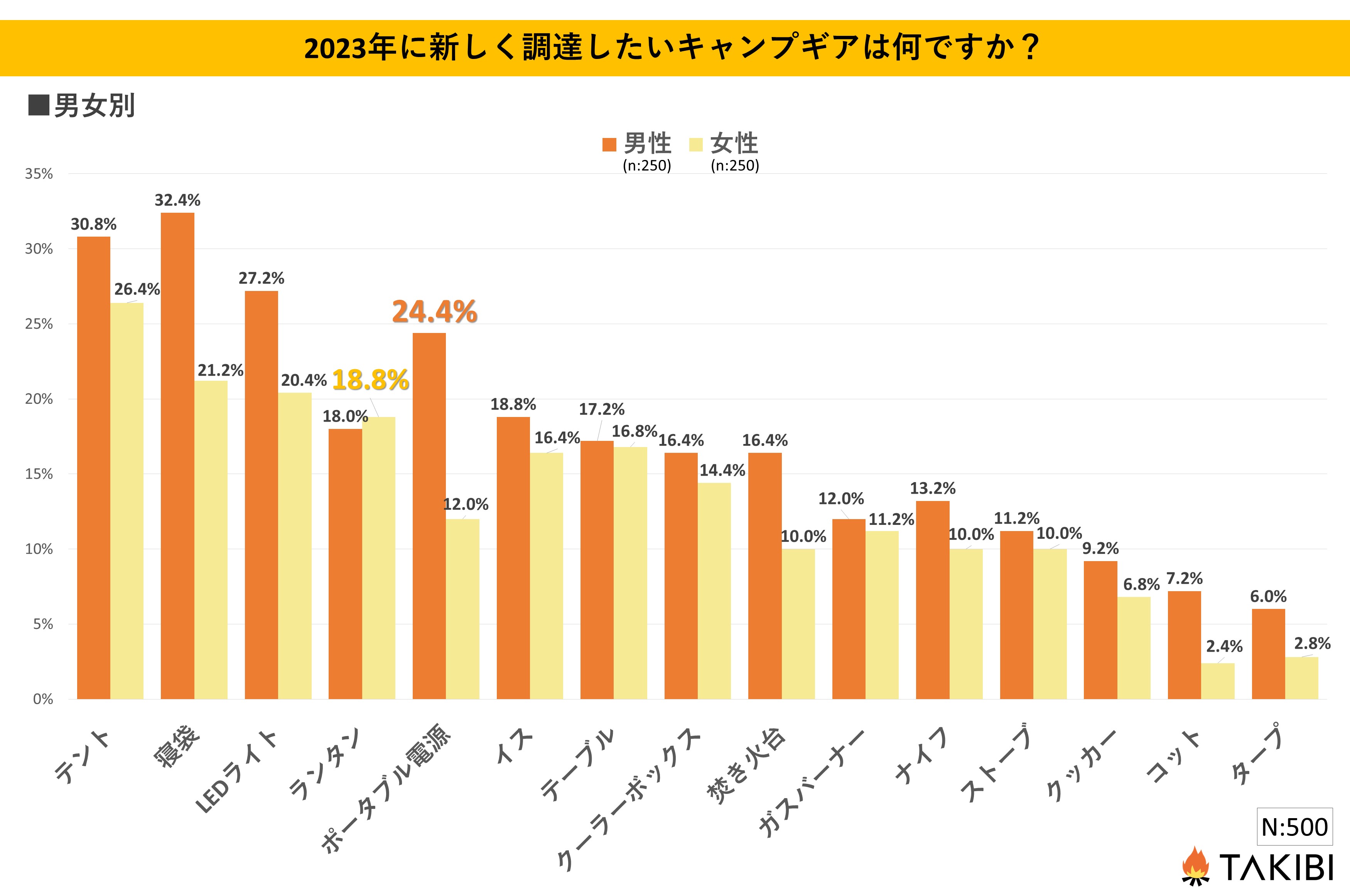 全体的に男性の回答数が多く、ギアのほとんどを新調したいと考えているようですが、多くの男性キャンパーが”キャンプギアの沼”にハマりつつあることが伺えます。特に、「ポータブル電源」に関しては女性の約2倍の票が集まっており、人気の高さが伺えました。