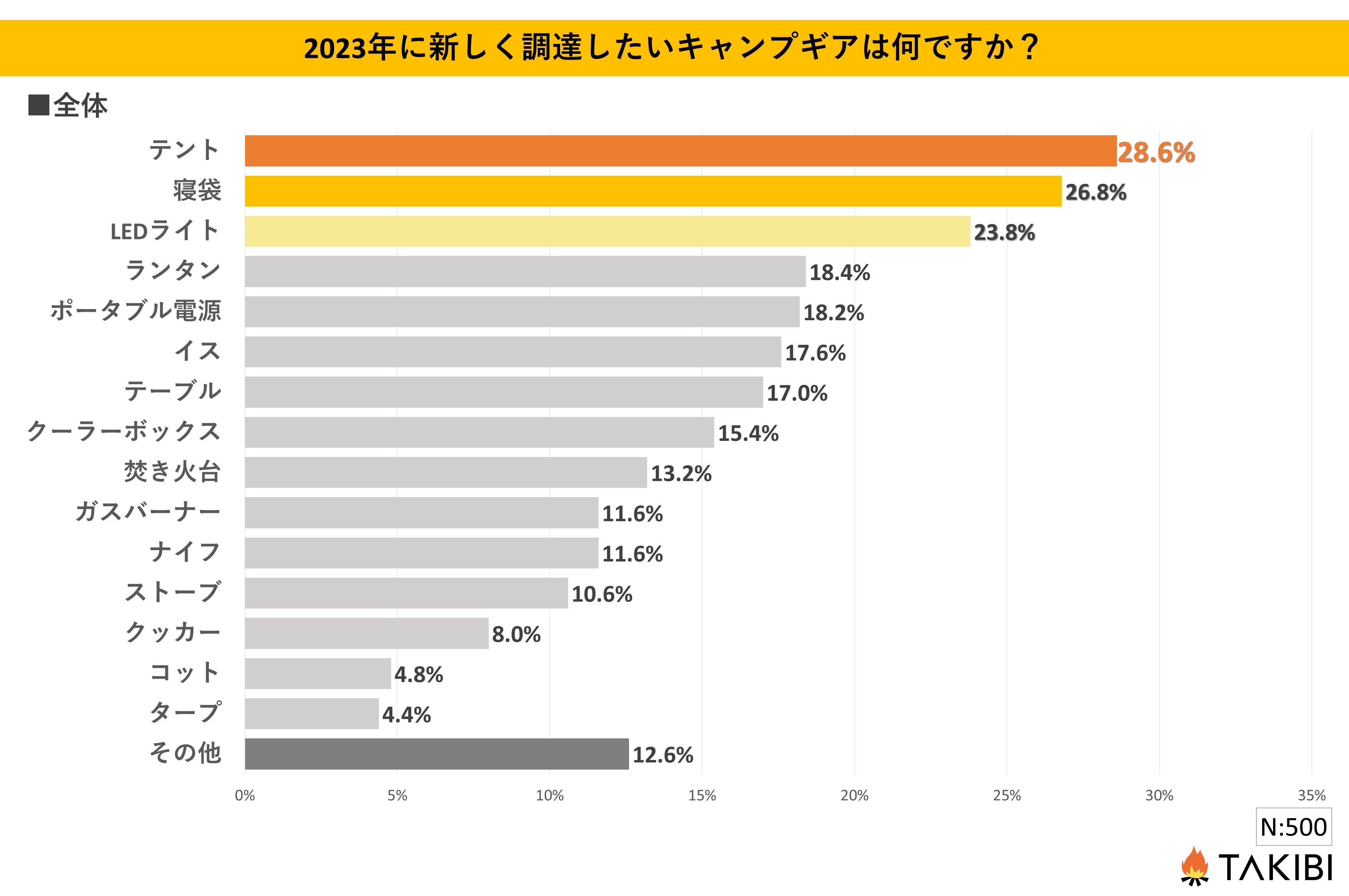 全国の10代~60代の男女を対象とした「2023年に新しく調達したいキャンプギアは何ですか?」というアンケートを行ったところ、最も多かった回答は「テント」で28.6%という結果になりました。次いで、「寝袋」が26.8%、「LEDライト」が23.8%となっております。