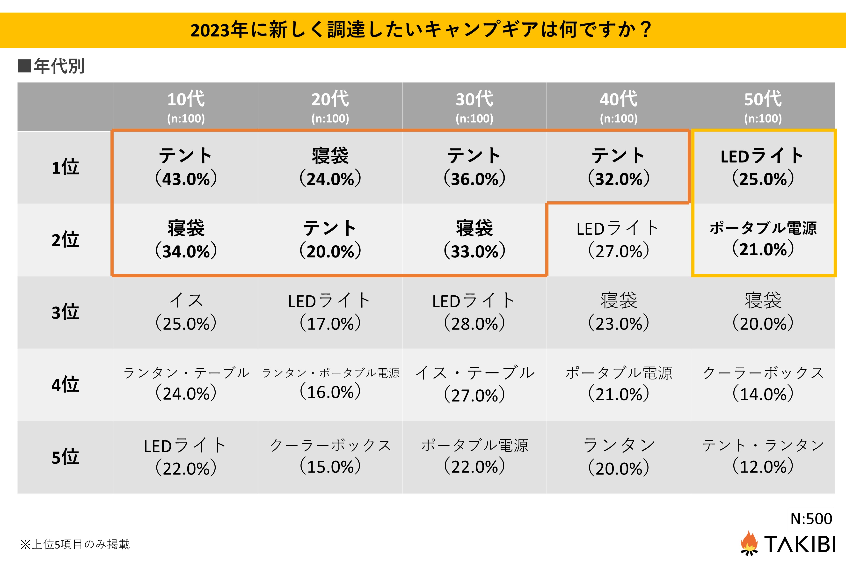 年代別に見ると、10代~40代では上位2項目に「テント」と「寝袋」がランクインする形となりました。