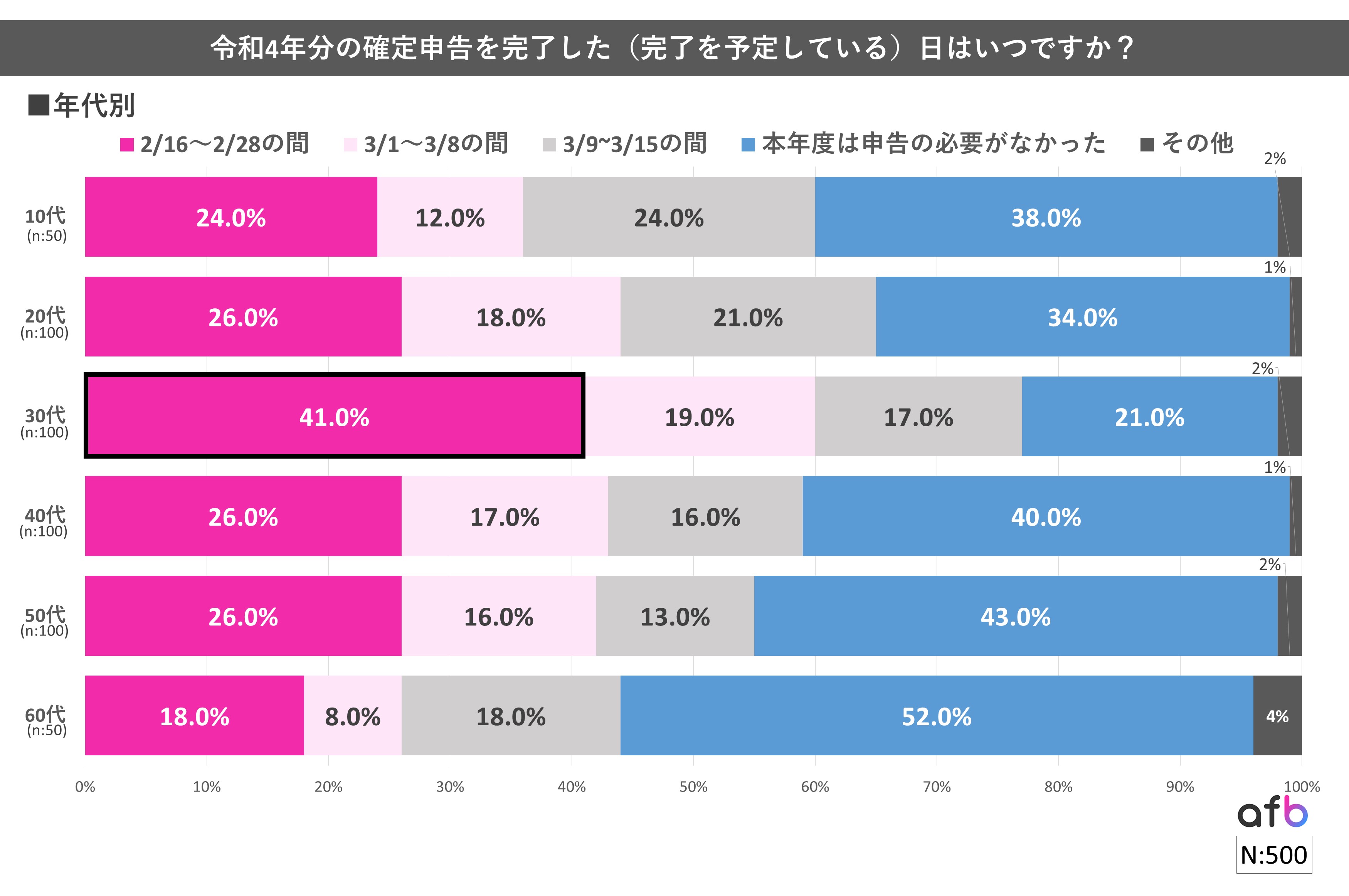 また、その他の年代では、3月に入ってから確定申告を行った方の割合が上回りましたが、30代においては、実際に確定申告を行った方の内53.2%が2月中に確定申告を完了させており、受付期間の早い段階で実施していることが分かりました。