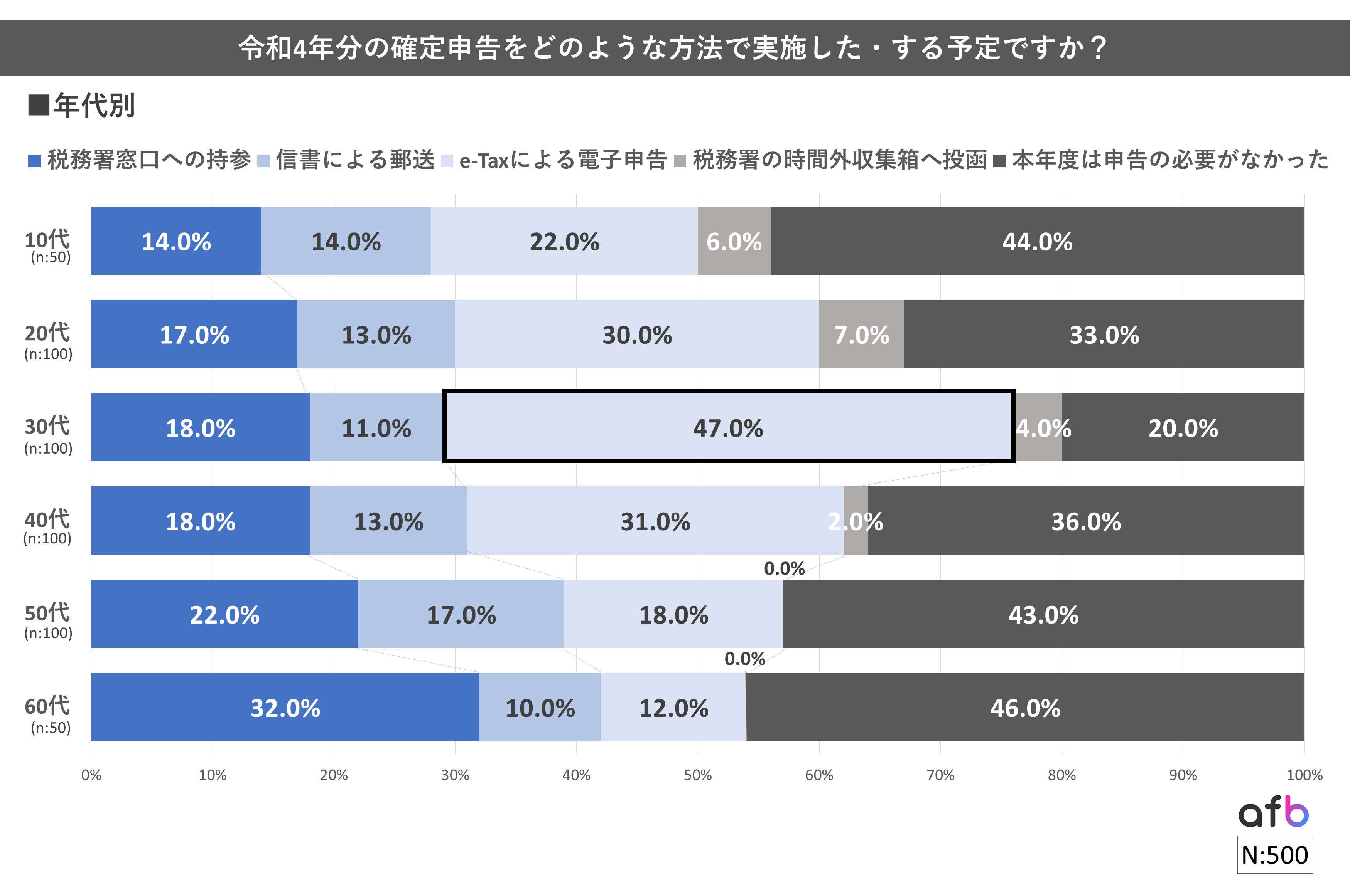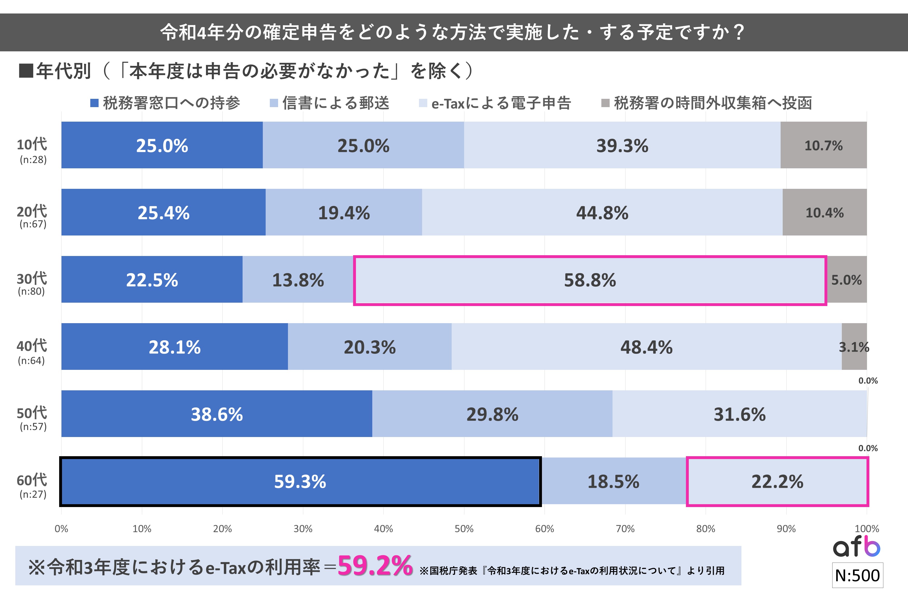 年代別に見ると、「税務署窓口への持参」の回答は、年代が上がるにつれ増加する結果となりました。