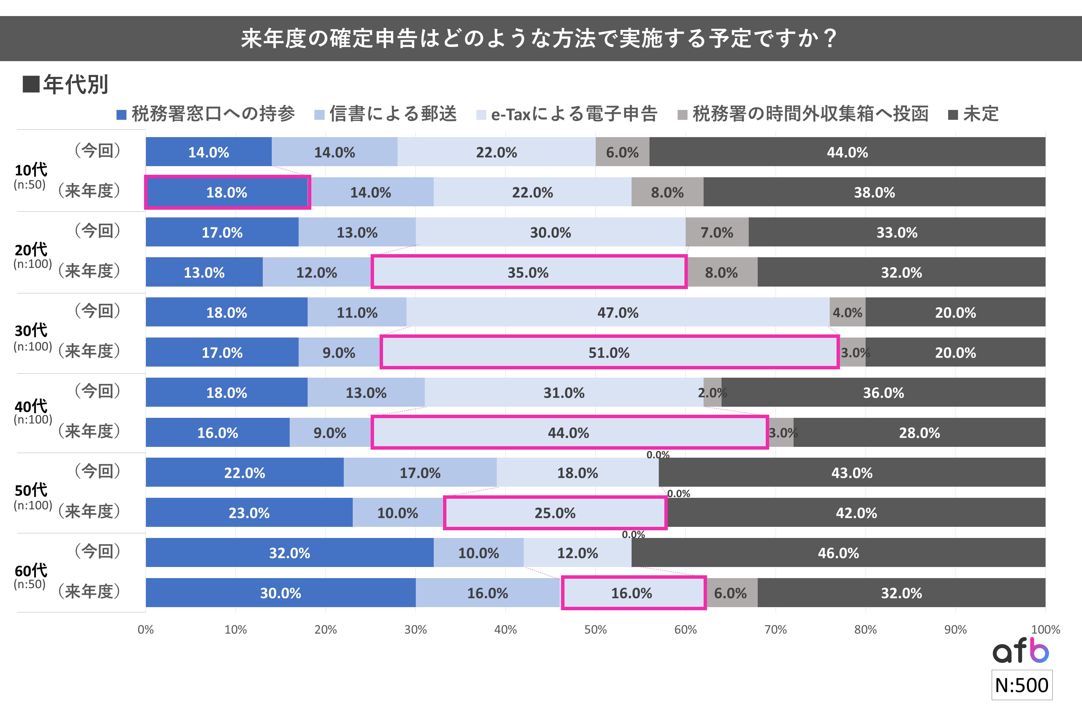 ■年代別内訳を年代別に見てみると、10代のみ「税務署窓口への持参」が増加する形となり、社会人としての経験が浅く税務知識や申請方法などに不安を感じていることが見受けられます。