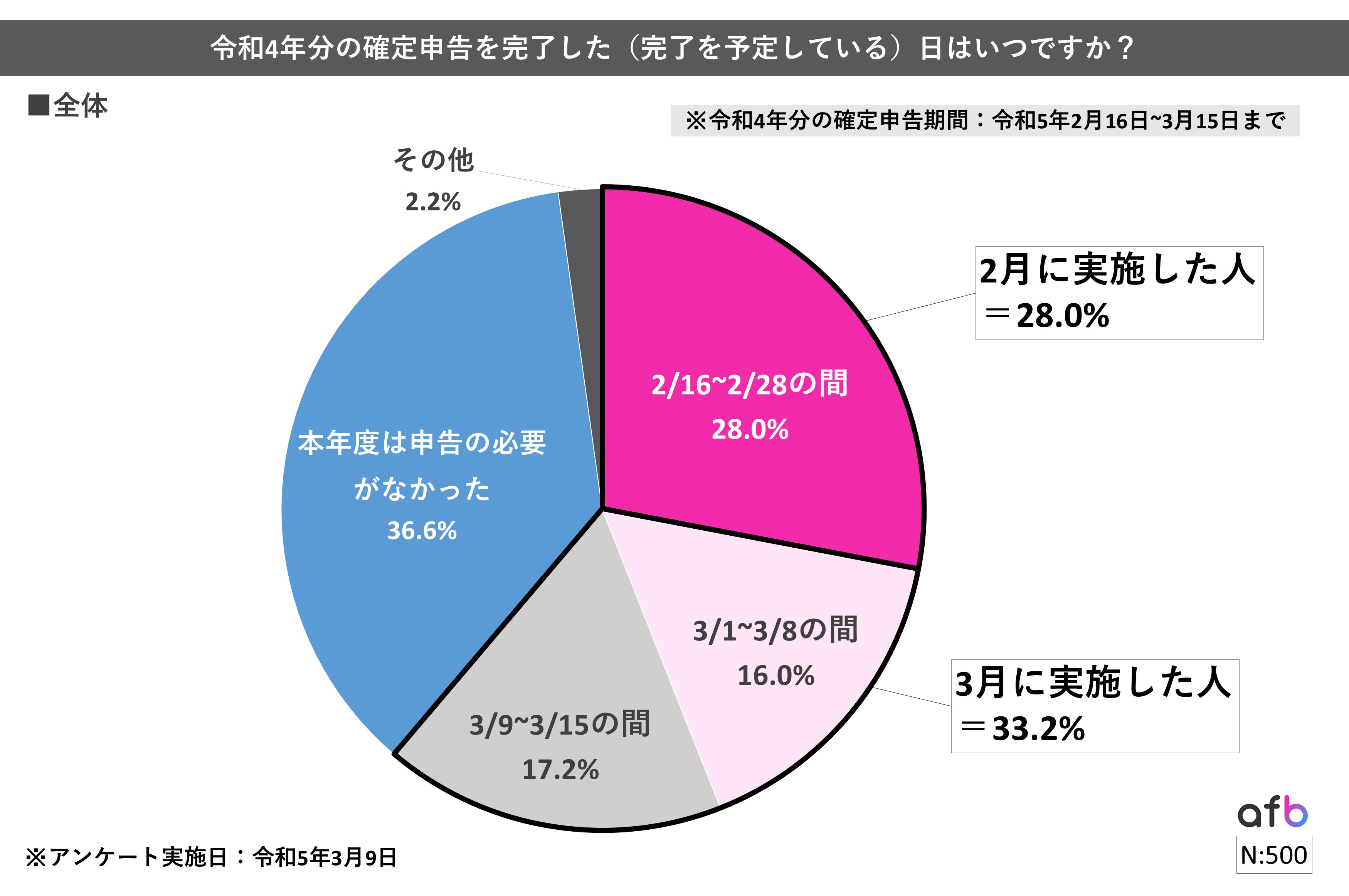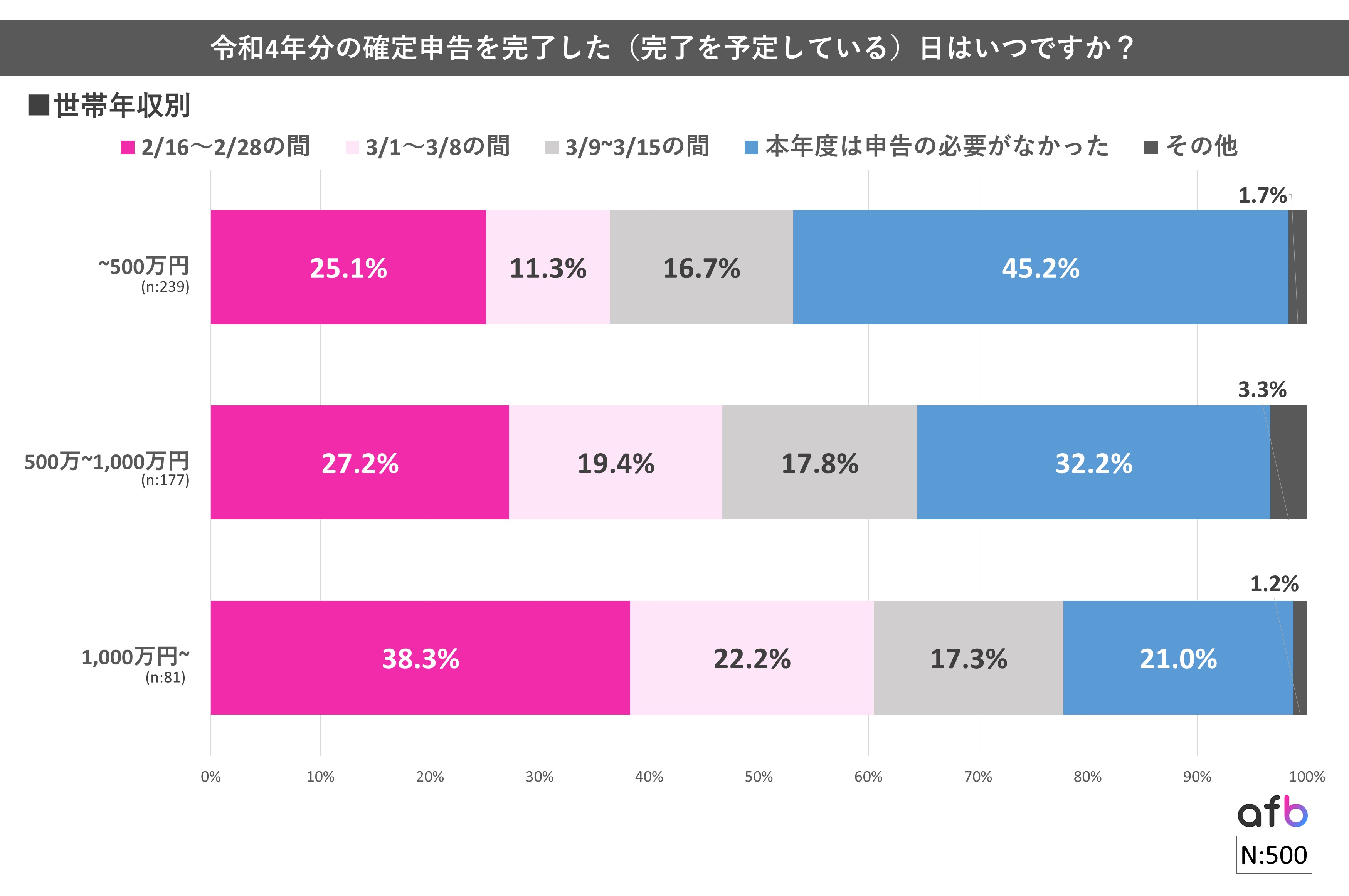 先日行った「あなたは副業をしたことがありますか?」というアンケートhttps://www.afi-b.com/beginner/archives/tsushin/13645/では、副業経験者は世帯年収が上がるにつれ増加するという結果になっております。これまで何度も確定申告を経験した結果手続きに慣れ、申告をスムーズに行えていること、所得が多いと納税額が多くなり、確定申告の重要性を実感しているなどの理由から、早めに確定申告を完了させる方が多かったのではないでしょうか。