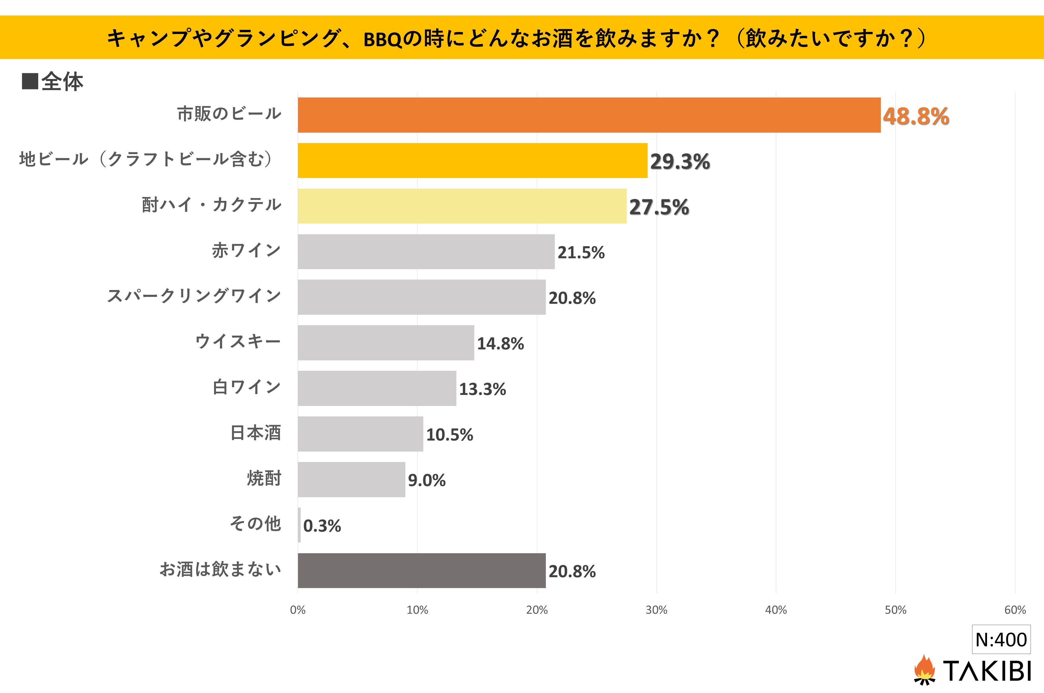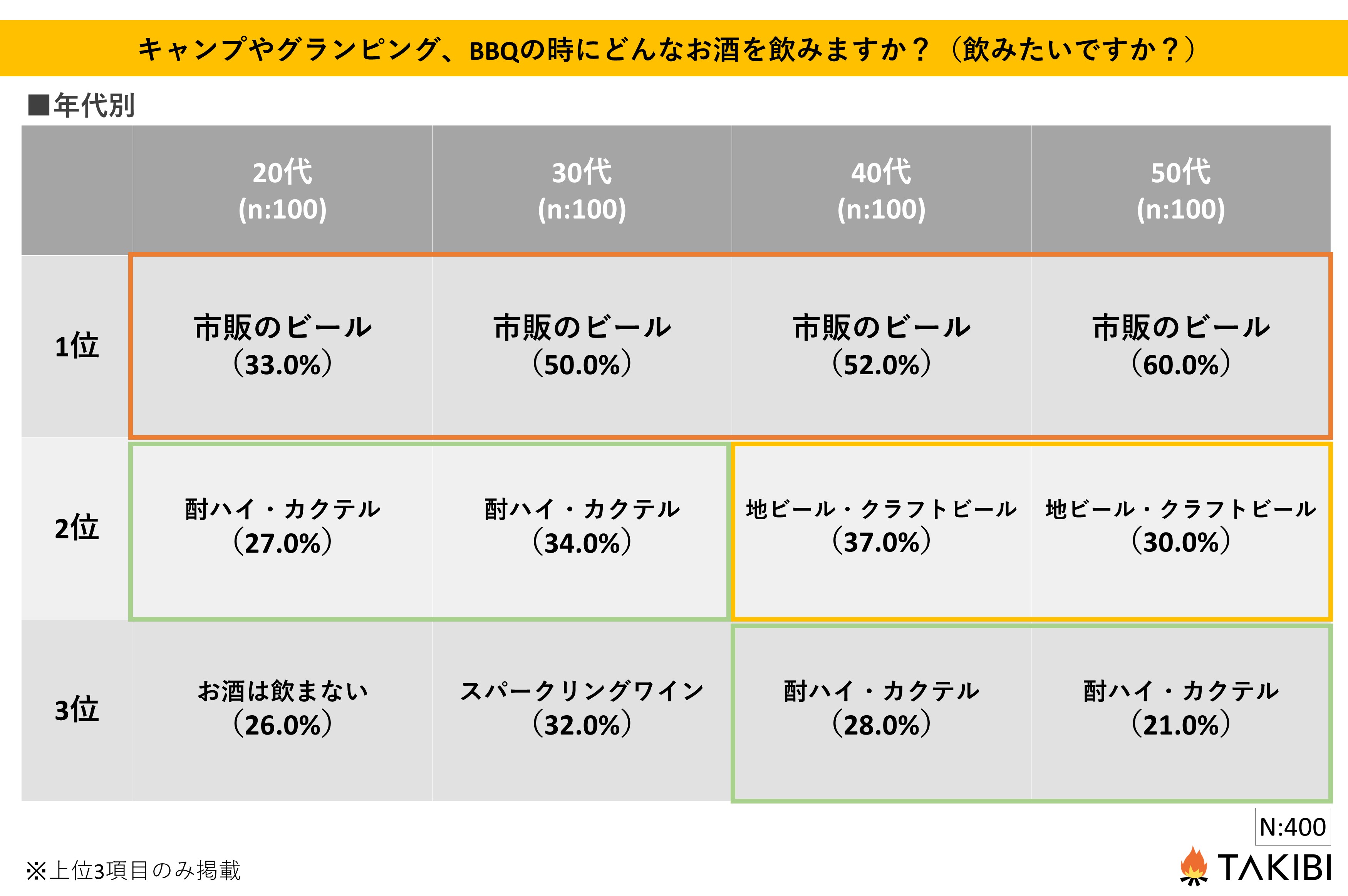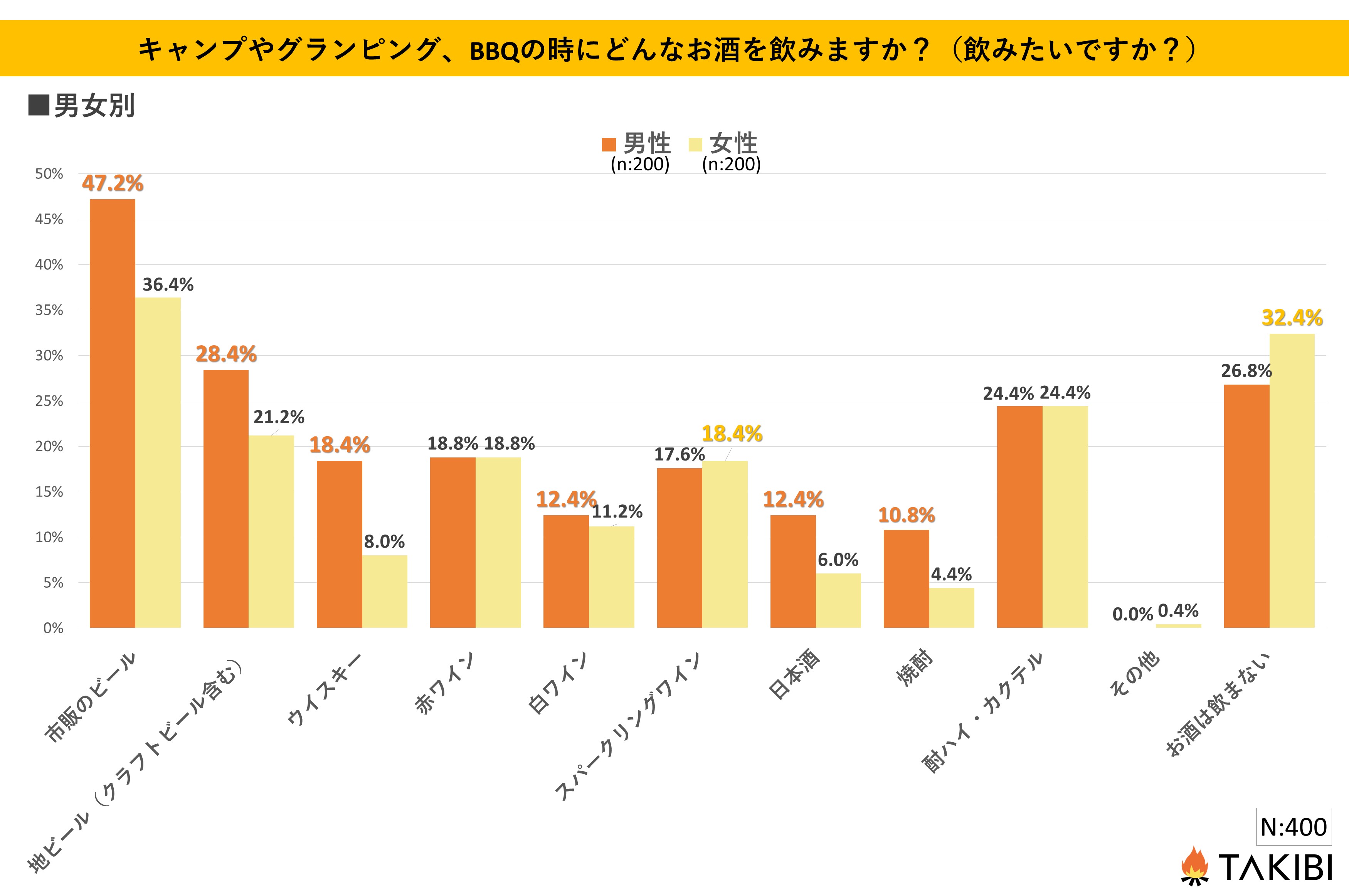 キャンプやグランピングを中心としたアウトドア総合情報サイト「TAKIBI」の運営をおこなう株式会社フォーイットは、全国の20代~50代までの男女400人を対象にキャンプやBBQの時に飲みたいお酒に関するアンケートを実施し、男女別・年代別等の特徴についてまとめました。