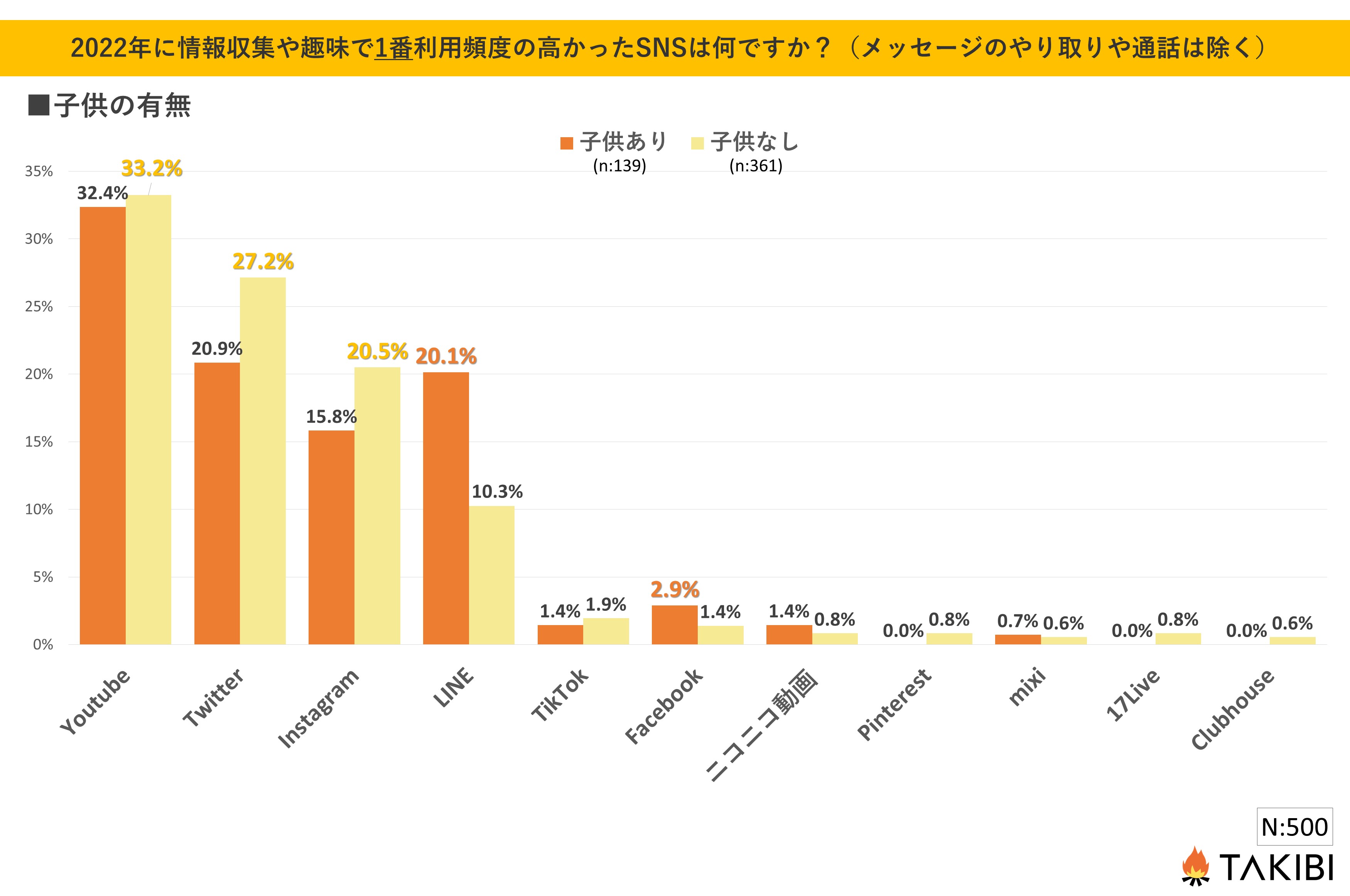 子供の有無で最も差があった項目として「LINE」が挙げられ、「子供あり」の方の回答が約10%上回る形となりました。