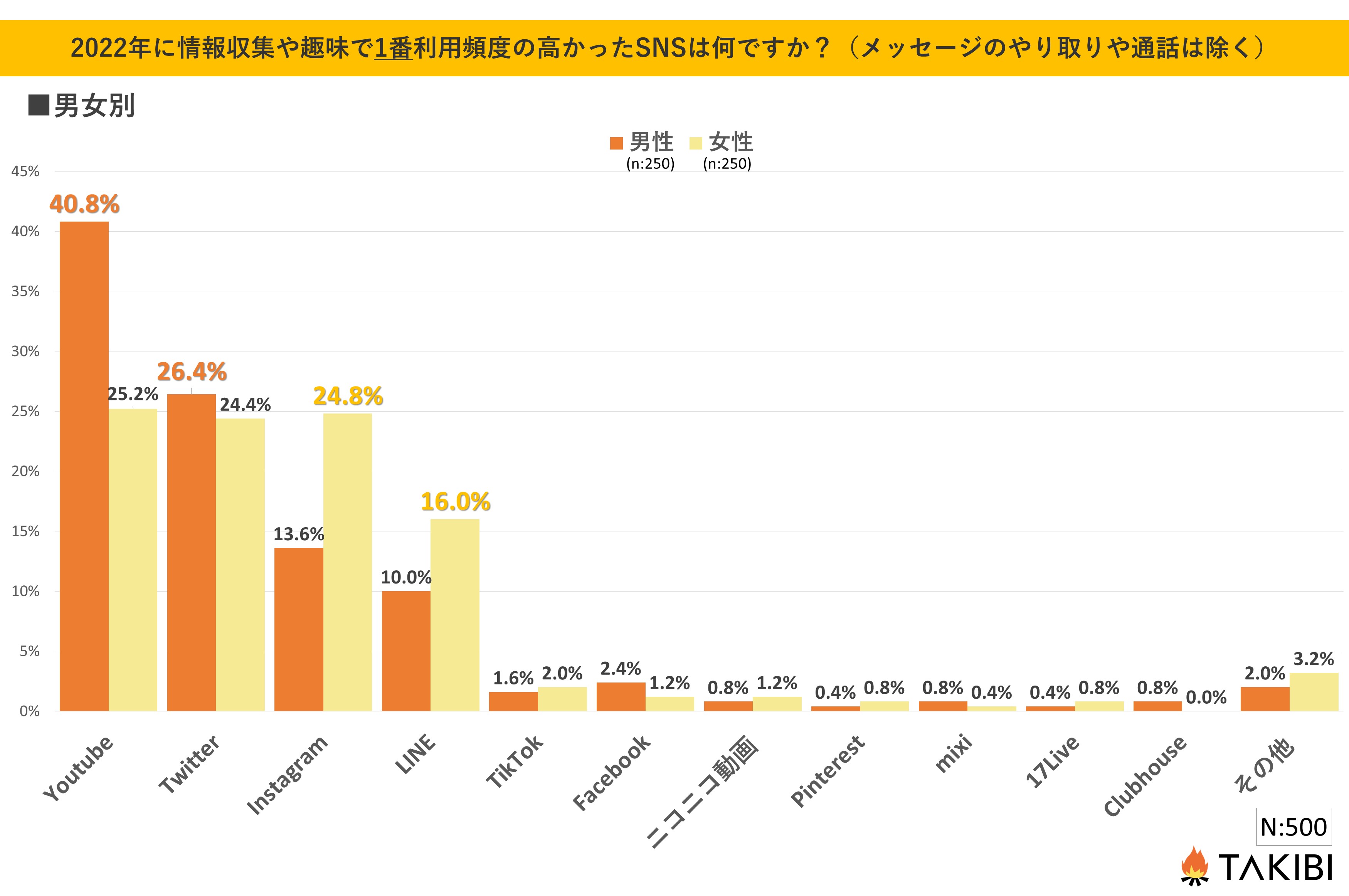 キャンプやグランピングを中心としたアウトドア総合情報サイト「TAKIBI」の運営をおこなう株式会社フォーイットは、全国の10代~50代までの男女500人を対象に情報収集で利用頻度の高かったSNSに関するアンケートを実施し、男女別・年代別等の特徴についてまとめました。