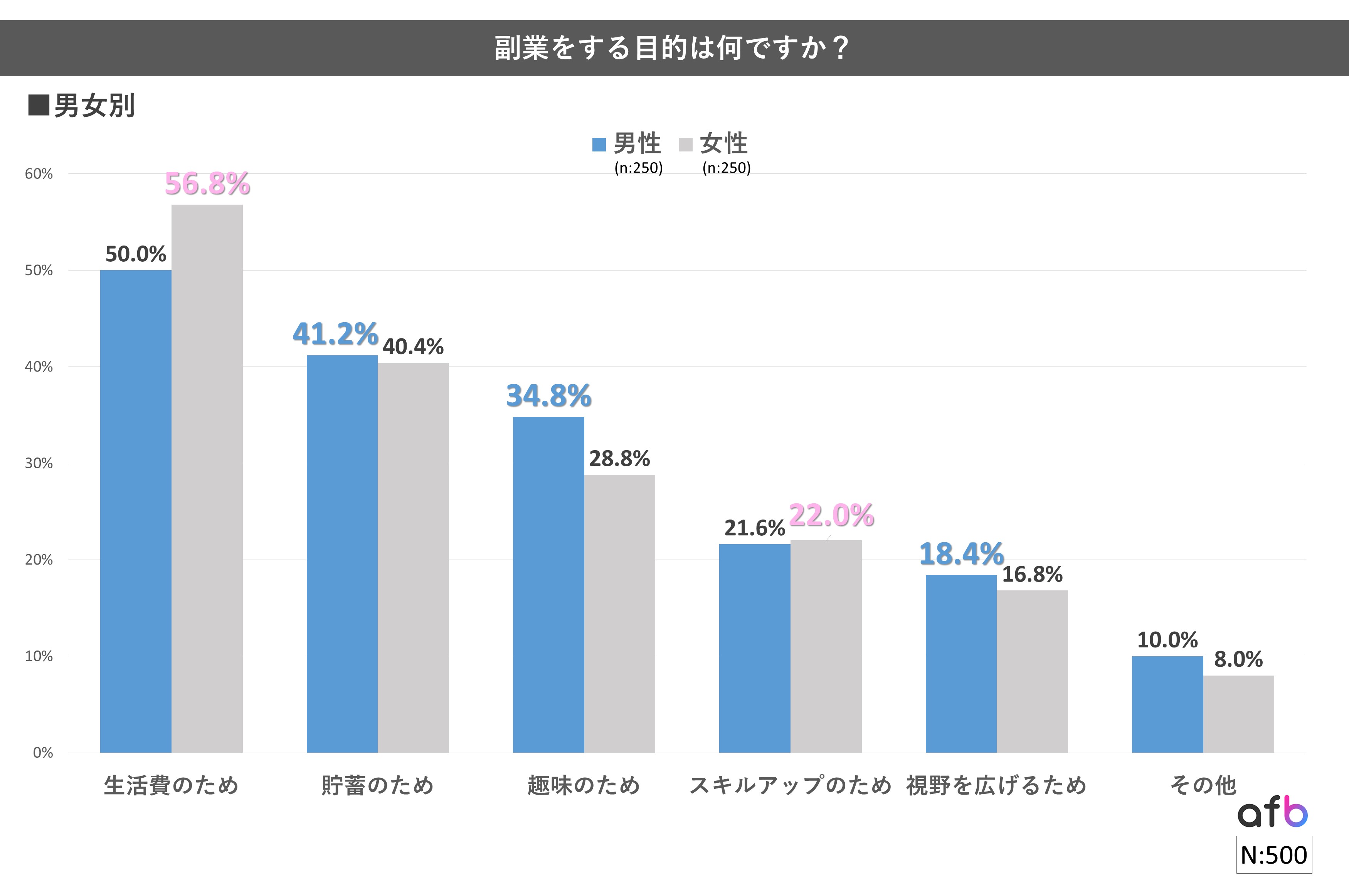 以前実施した「副業をしたことはありますか?」https://www.afi-b.com/beginner/archives/tsushin/13645/というアンケートでは、「ある」と回答した方は男性:20.4%、女性:19.0%と、副業の”実施率”に男女で大きな差はないという結果になりましたが、副業に取り組む副業”目的”には回答率に差が出る結果となりました。