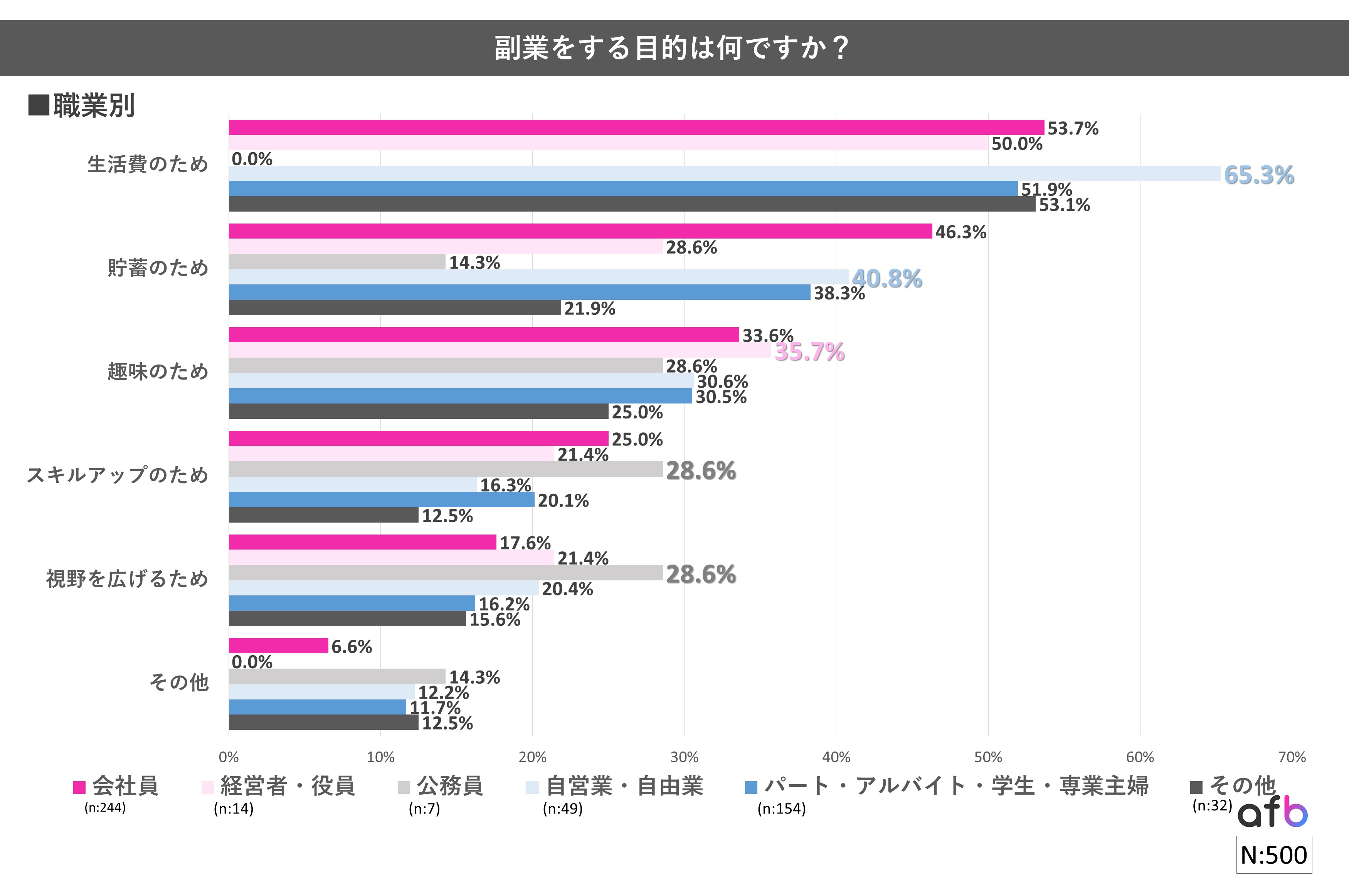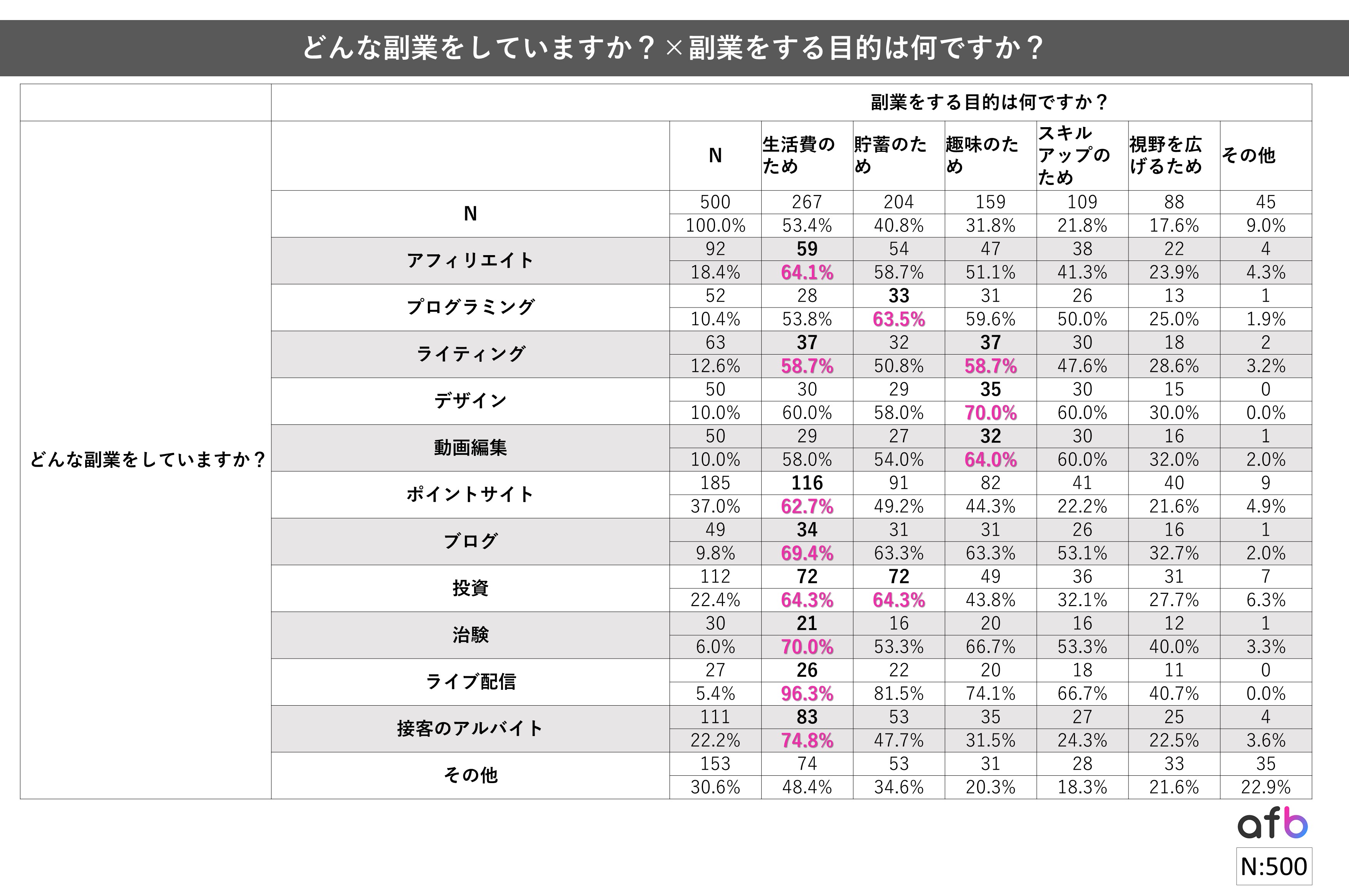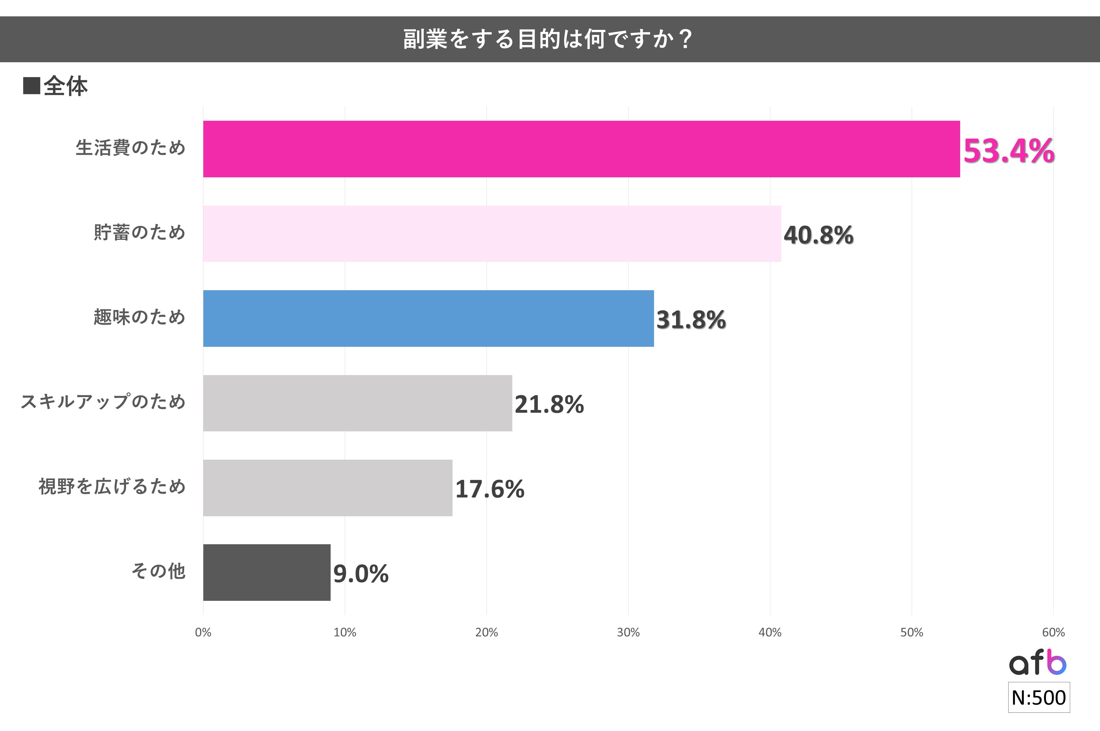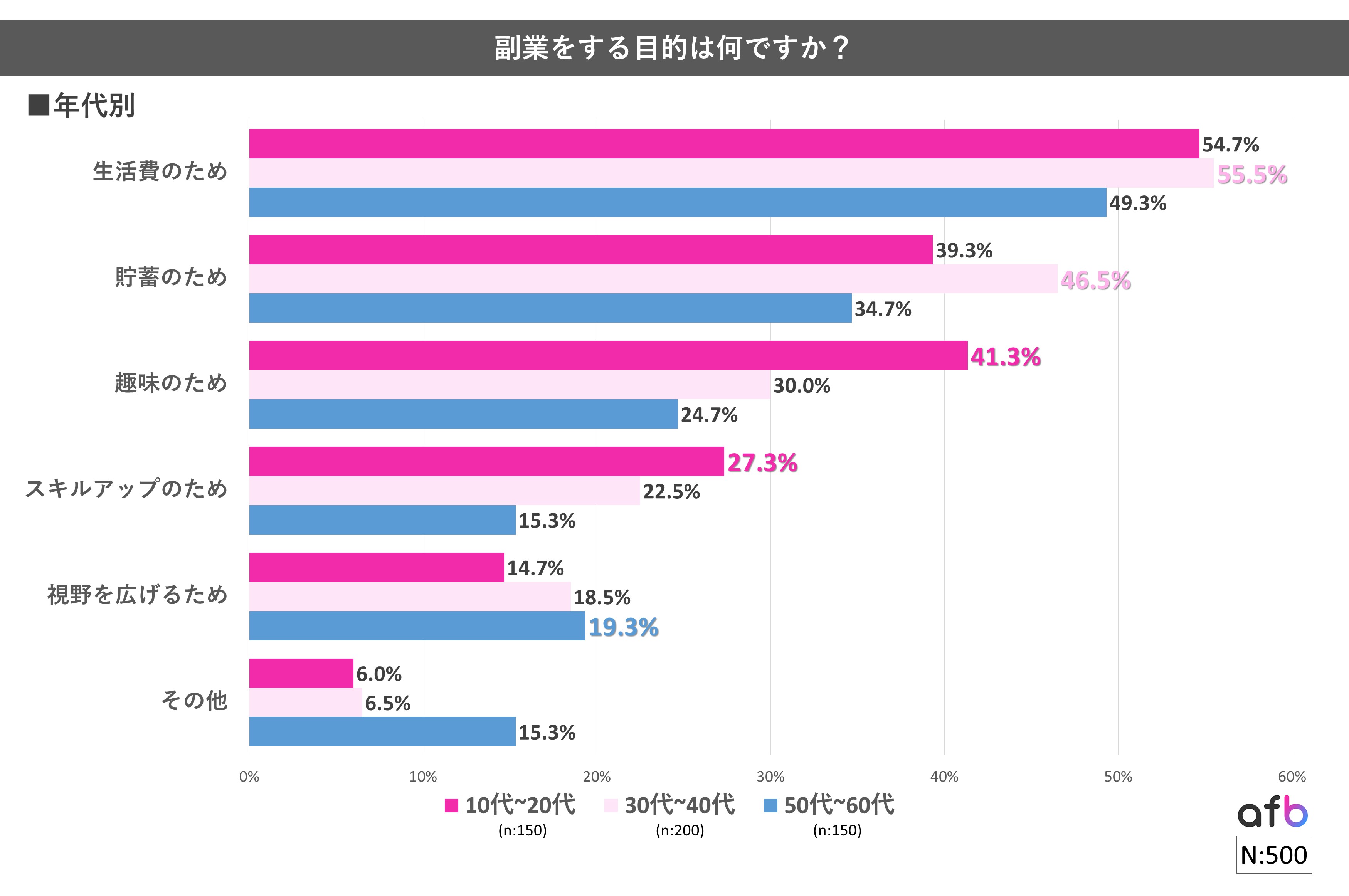 パフォーマンステクノロジーネットワーク「afb(アフィビー)」の開発運用をおこなう株式会社フォーイットは、全国の10代~60代までの男女500人を対象に副業に関するアンケートを実施し、年代別・世帯年収別等の特徴についてまとめました。