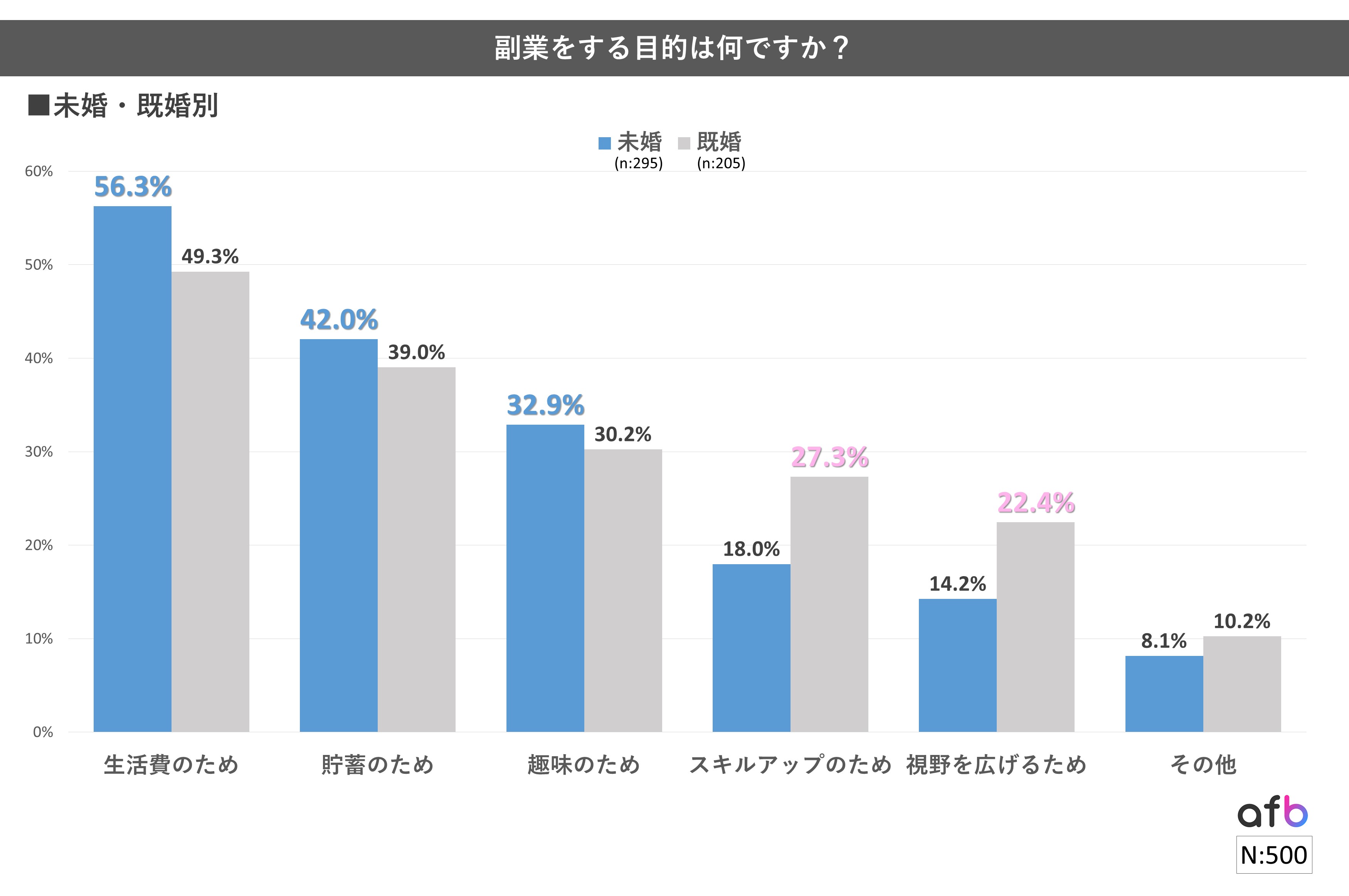 未婚・既婚別で見ると、未婚者では「生活費のため」「貯蓄のため」「趣味のため」などお金のために副業に取り組む項目が上回りましたが、既婚者では「スキルアップのため」や「視野を広げるため」など自身の能力向上のために取り組む人が上回る結果となりました。