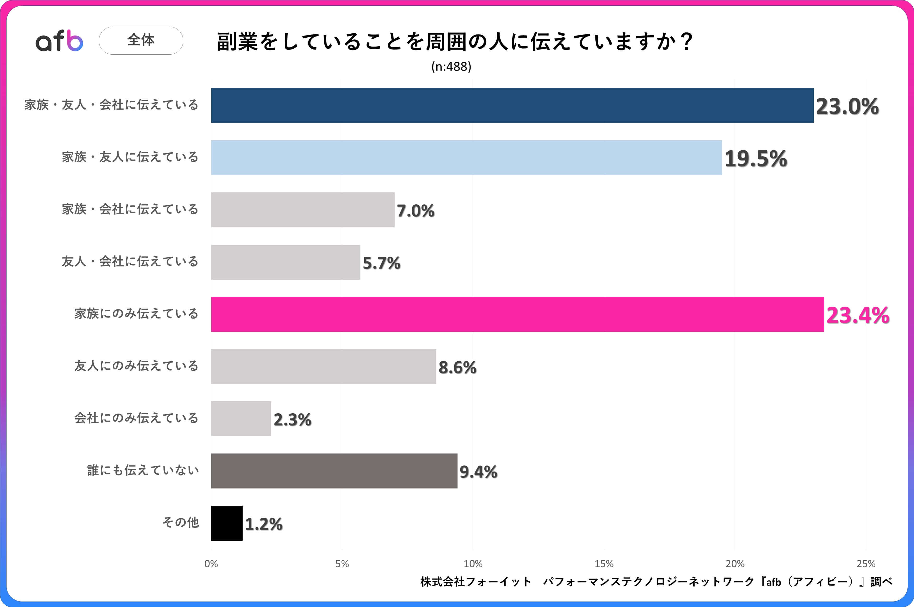 事前調査で「副業をしたことがある」と回答した全国の10代~60代の男女を対象とした「副業をしていことを周囲の人に伝えていますか?」というアンケートを実施したところ、最も多かった回答は「家族にのみ伝えている」で23.4%となりました。次いで、「家族・友人・会社に伝えている」が23.0%、「家族・会社に伝えている」が19.5%と続きました。
