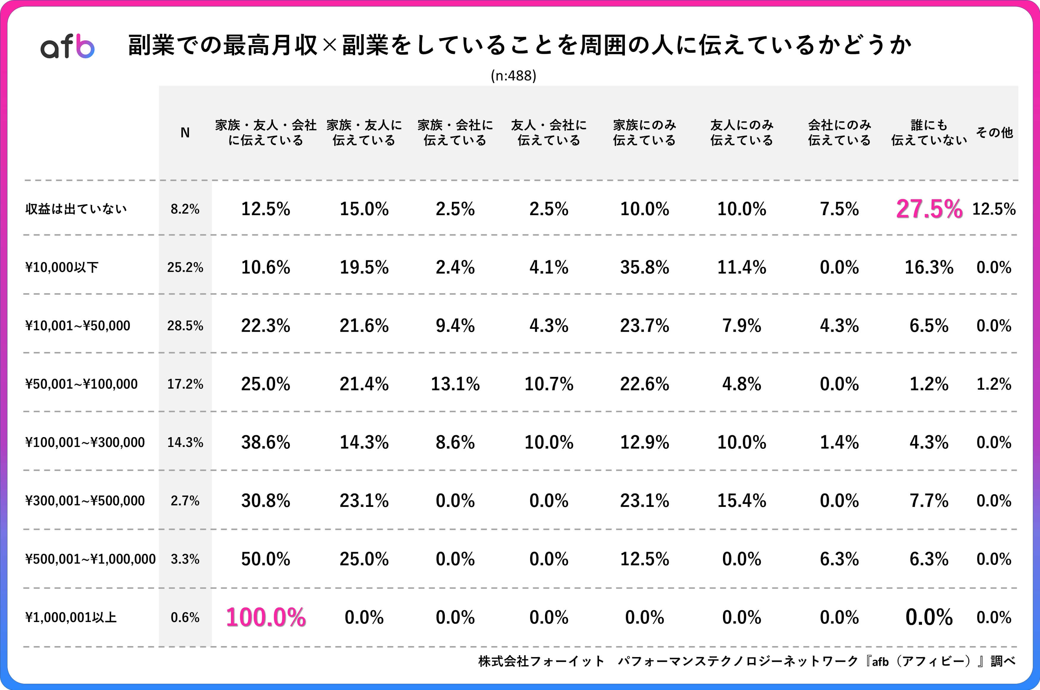 副業が許容されている環境では、副業をしていることをオープンにすることで新たなノウハウの習得やコミュニティ参加に繋がったり、案件獲得のきっかけになっていたりと、更に収益を上げられる好循環が生まれているのかもしれません。