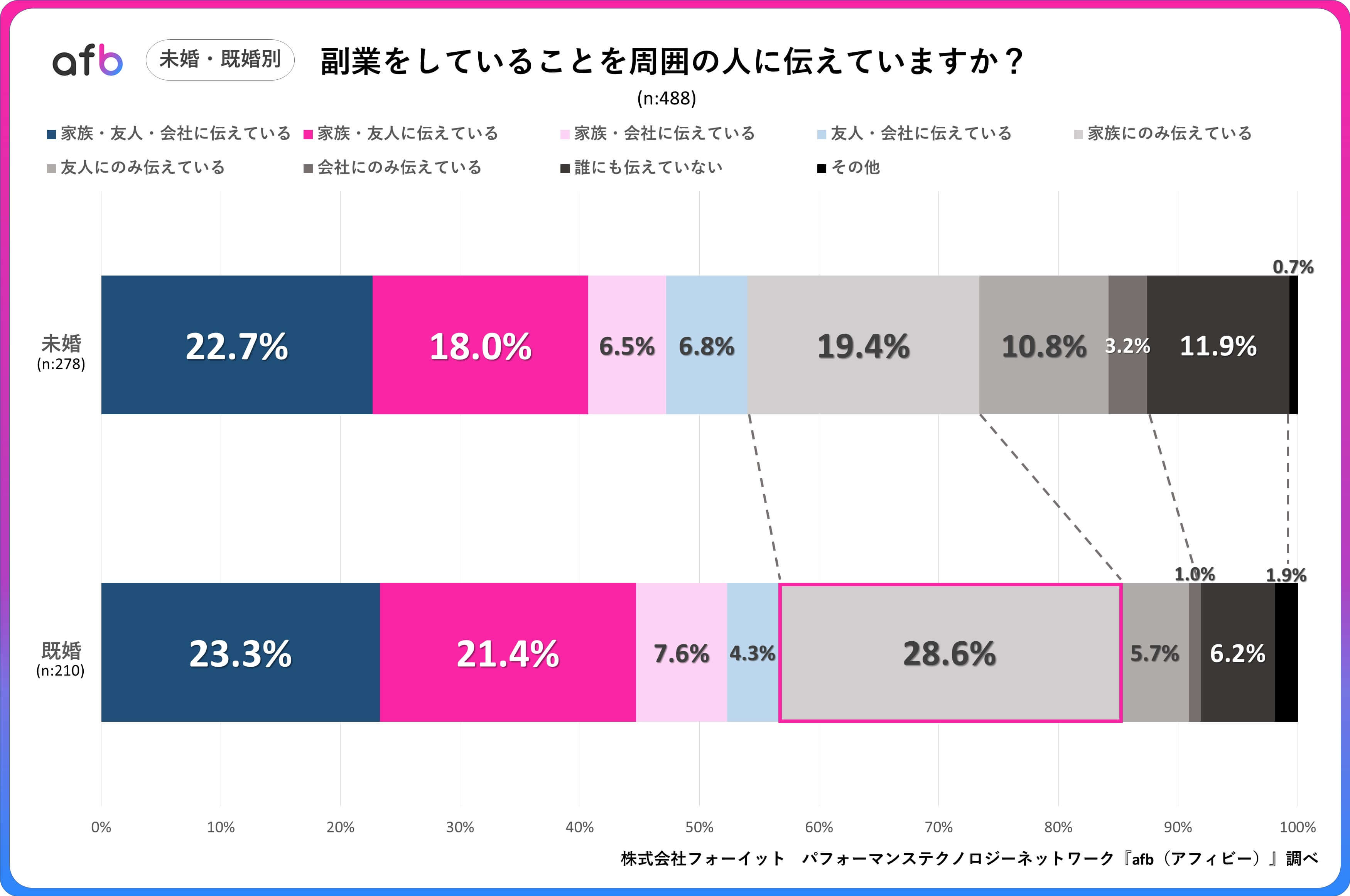 未婚・既婚別で比較すると、既婚者で「家族にのみ伝えている」割合が高くなり、28.6%となりました。
