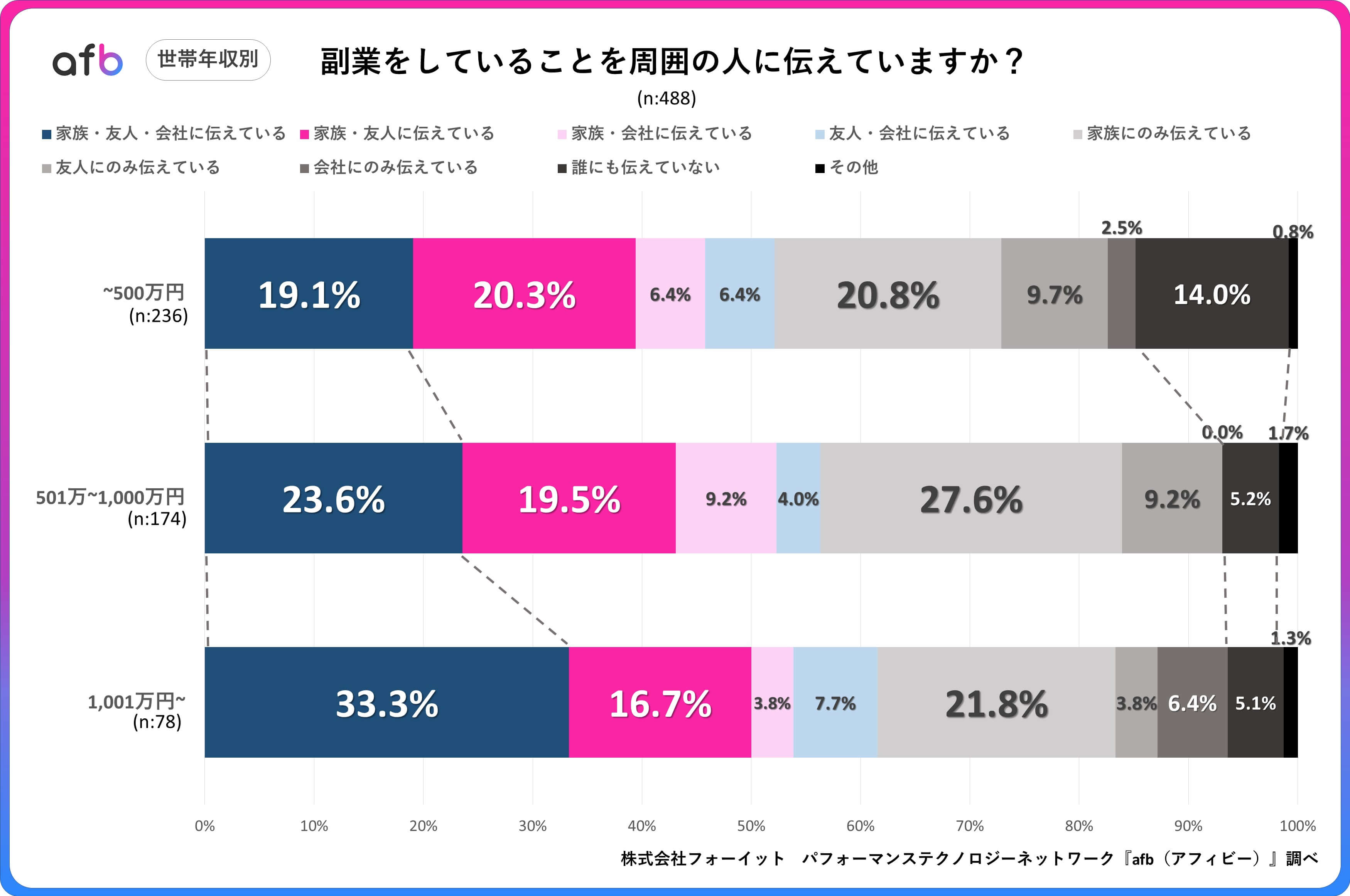 世帯年収別で見ると、「家族・友人・会社に伝えている」人は、世帯年収が上がるごとに増加する結果となりました。また、世帯年収1,001万円~では、「誰にも伝えていない」という人が最も少なく、5.1%となりました。