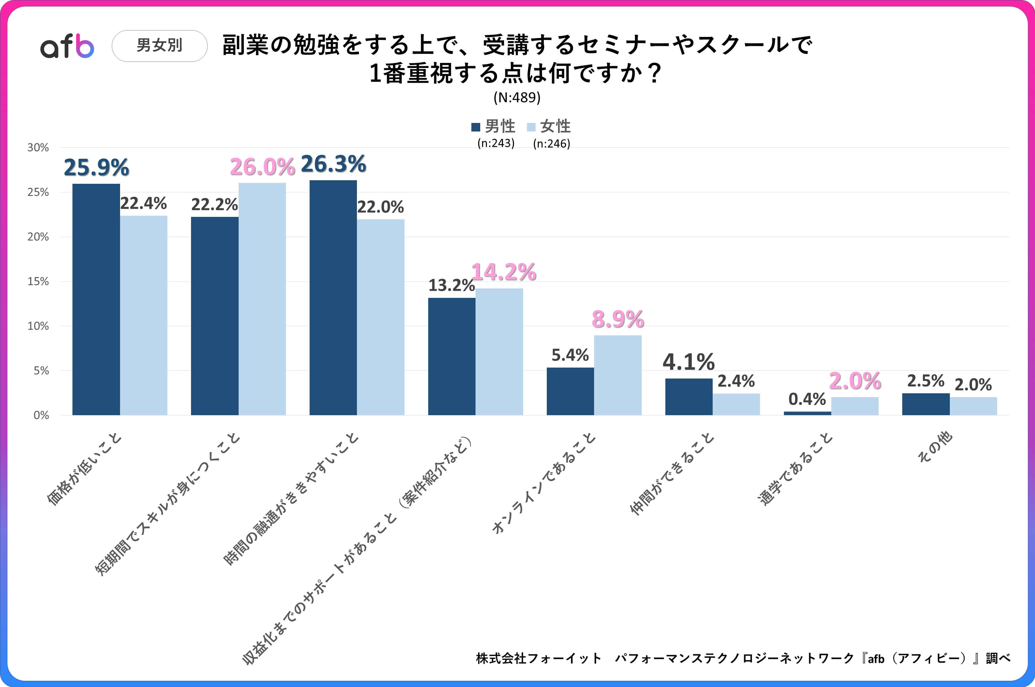 このことから、男性は副業を学ぶうえで低価格かつ自分のペースで受講できるという点を重視するのに対して、女性は短期間でスキルを身につけられ、オンラインで受講できるようなセミナーやスクールを求める傾向があるのかもしれません。