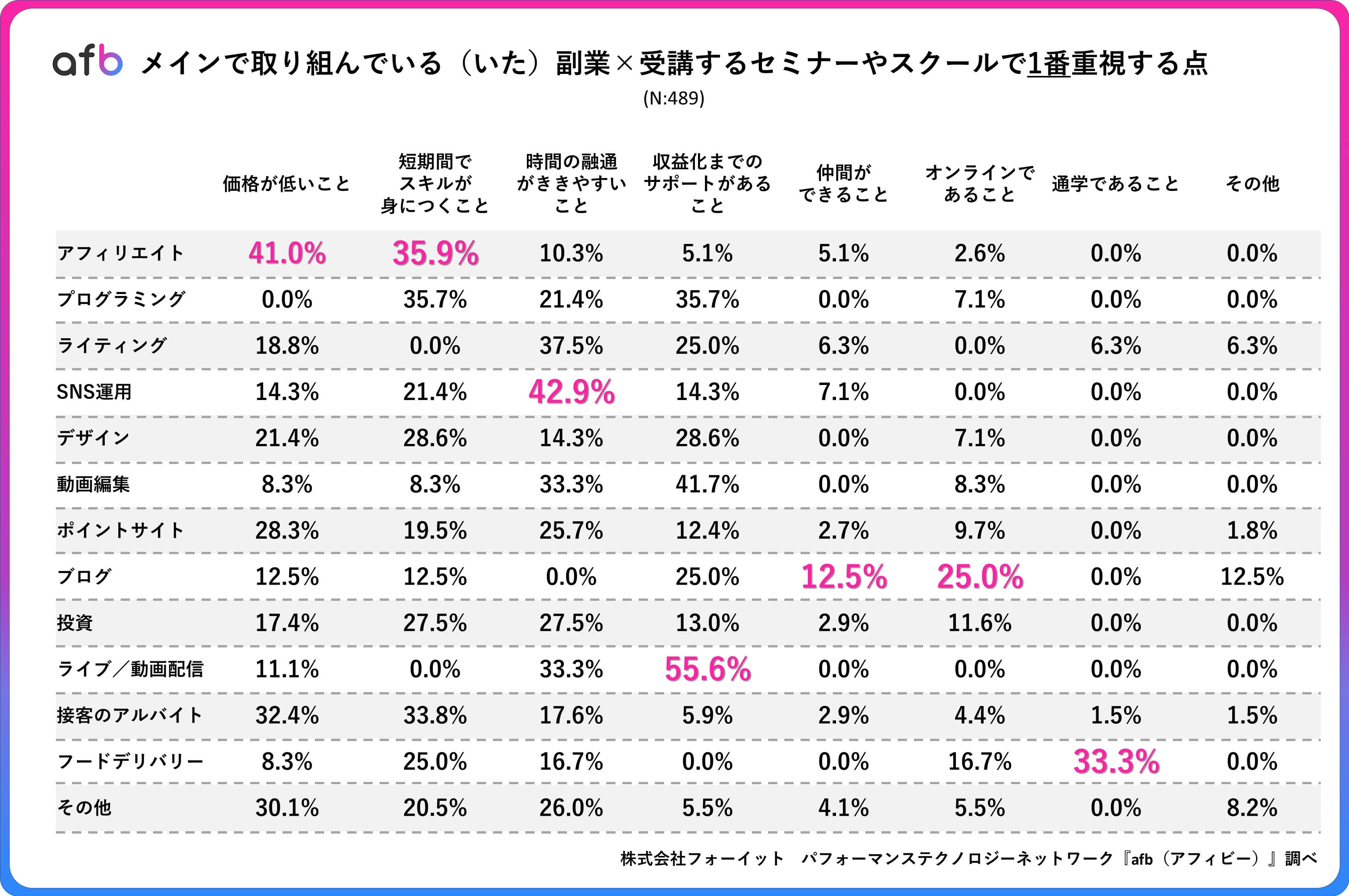 パフォーマンステクノロジーネットワーク「afb(アフィビー)」の開発運用をおこなう株式会社フォーイットは、全国の10代~60代までの男女500人を対象に副業に関するアンケートを実施し、年代別・男女別等の特徴についてまとめました。