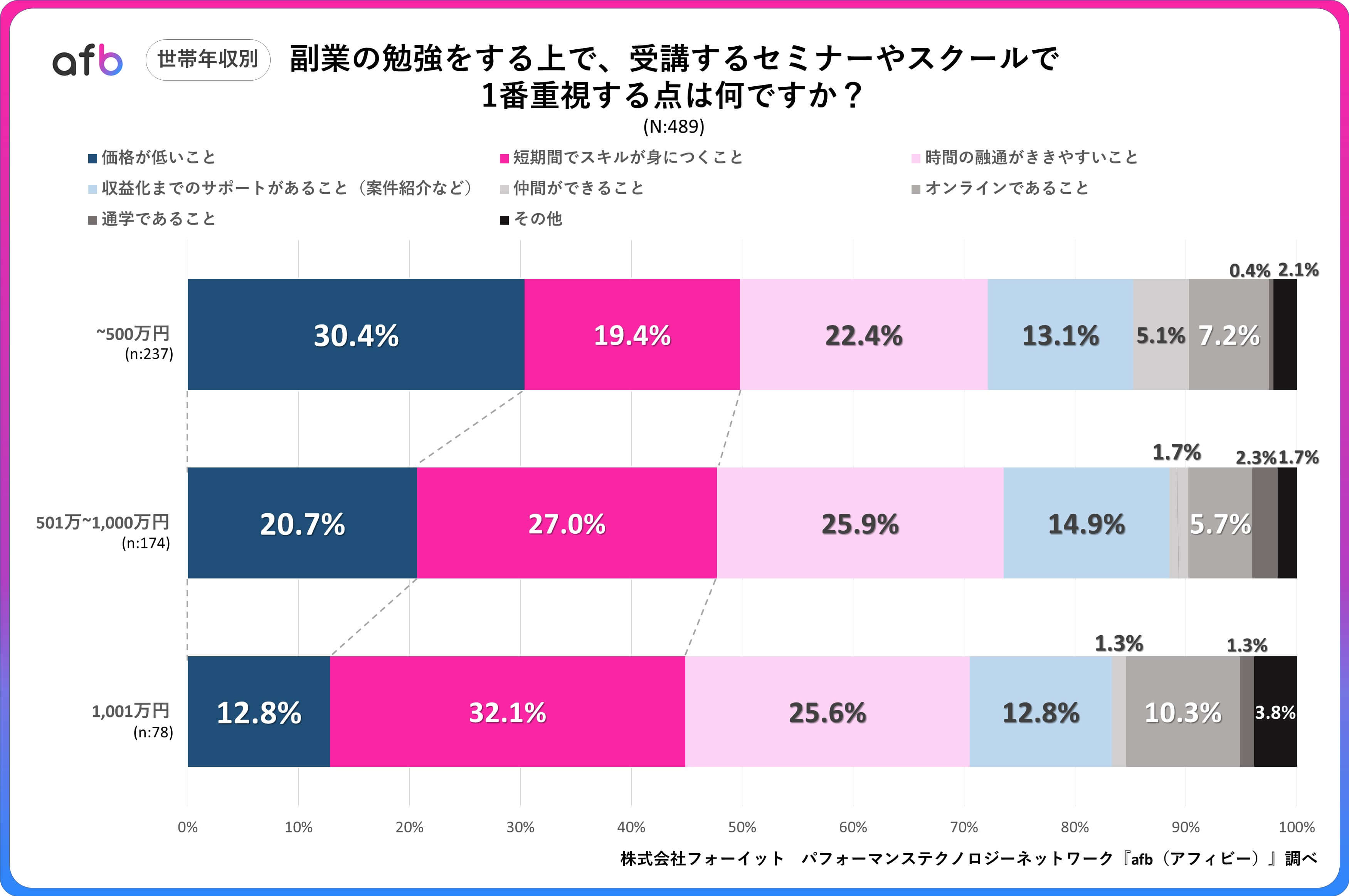 世帯年収別に見ると、収入とセミナー・スクールで重視する点には相関関係があることが分かりました。「価格が低いこと」を最も重視すると回答した方は、世帯年収が増加するにつれて少なくなっており、「~500万円」では30.4%だったのに対して「1,001万円~」では12.8%と、17.6%もの差が生まれています。反対に、「短期間でスキルが身につくこと」と回答した方は世帯年収が増加するにつれて多くなっており、「~500万円」では19.4%でしたが、「1,001万円~」では32.1%という結果になりました。