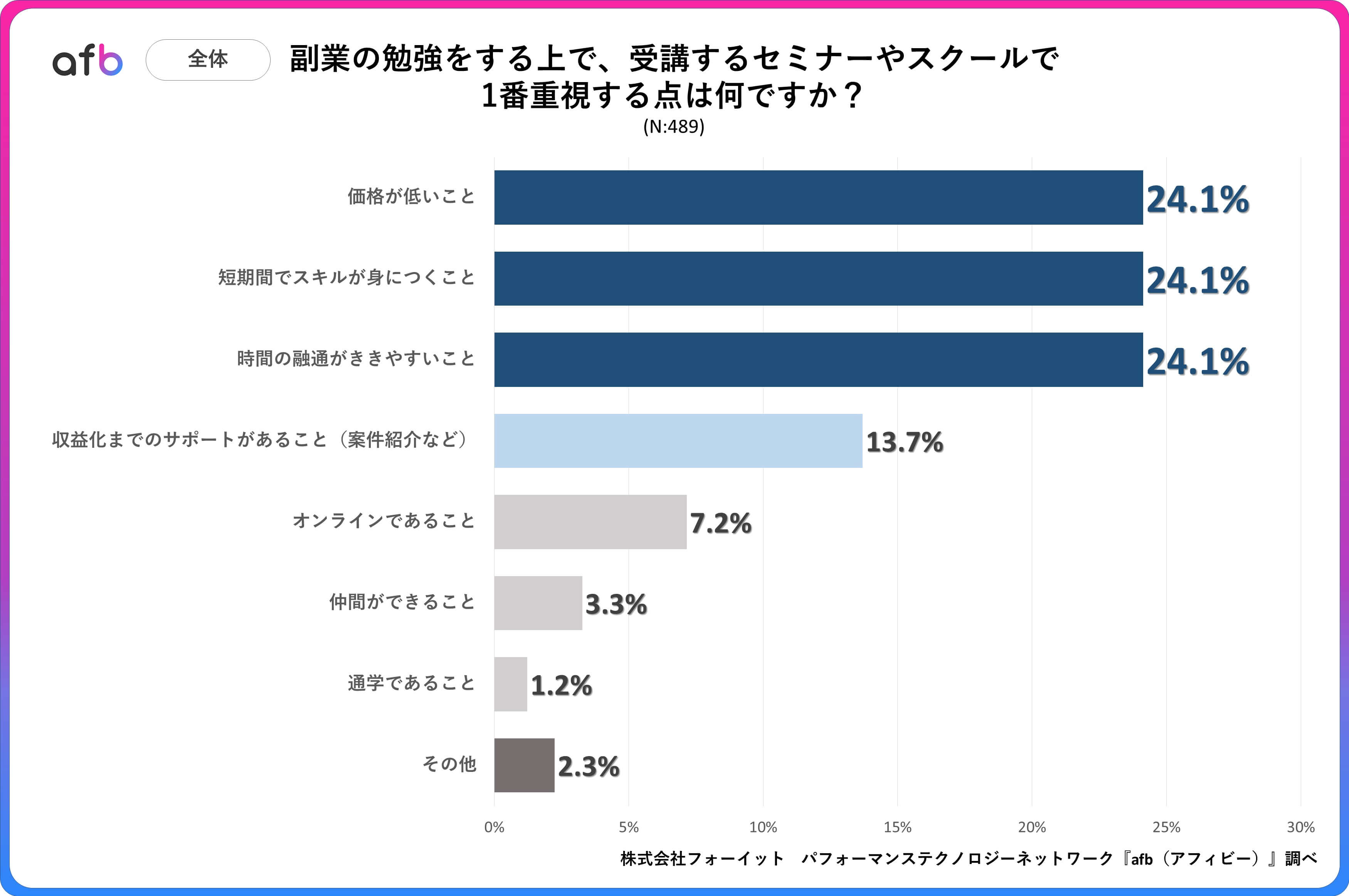 事前調査で「副業をしたことがある」と回答した10代~60代の男女を対象に、「副業の勉強をする上で、受講するセミナーやスクールで1番重視する点は何ですか?」というアンケートを実施したところ、最も多かった回答は「価格が低いこと」、「短期間でスキルが身につくこと」、「時間の融通がききやすいこと」の3つがともに24.1%という結果でした。次いで、「収益化までのサポートがあること(案件紹介など)」が13.7%、「オンラインであること」が7.2%と続きました。また、最も少なかった回答は「通学であること」で、1.2%となっています。