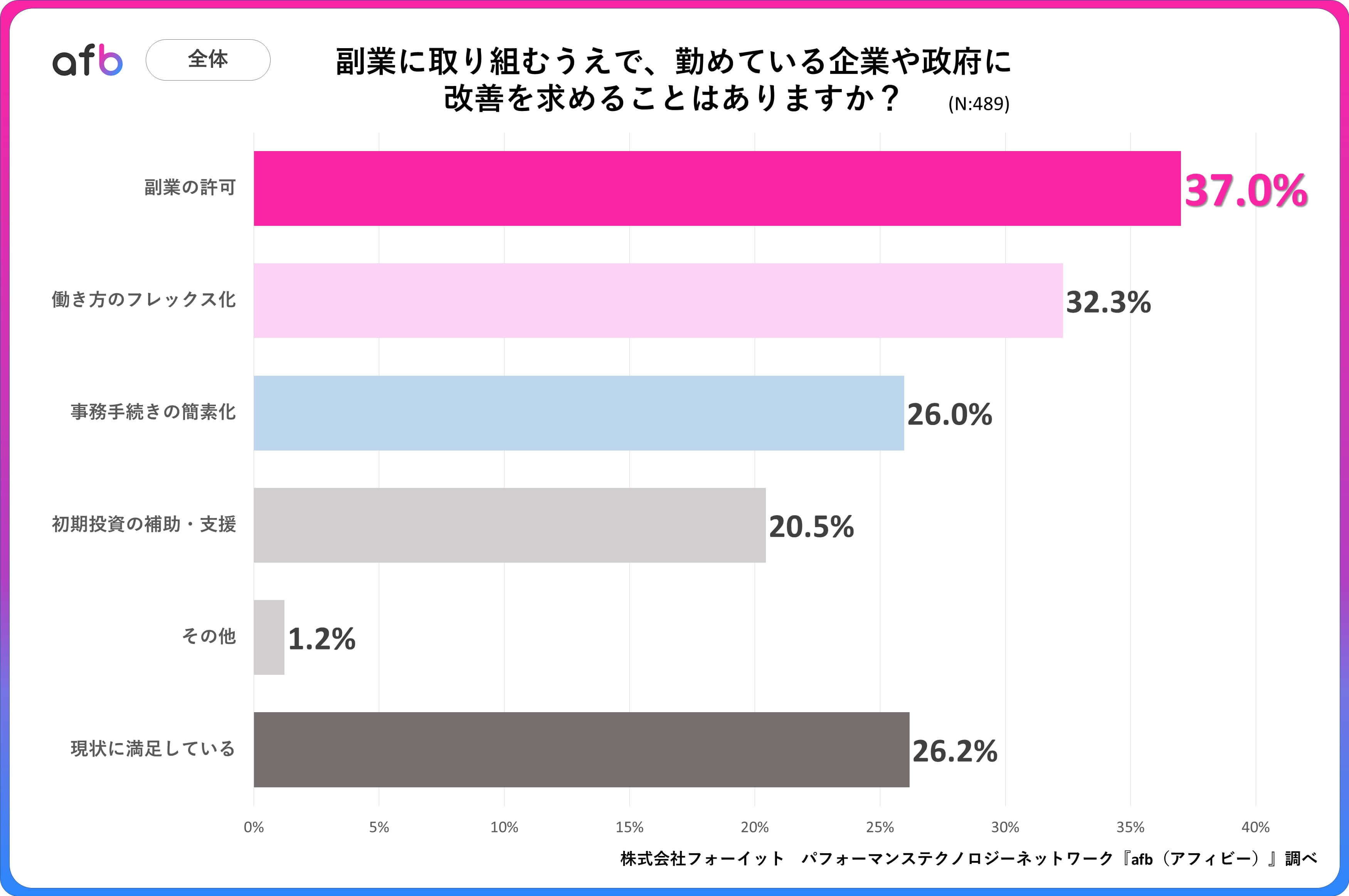 パフォーマンステクノロジーネットワーク「afb(アフィビー)」の開発運用をおこなう株式会社フォーイットは、全国の10代~60代までの男女500人を対象に副業に関するアンケートを実施し、年代別・男女別等の特徴についてまとめました。