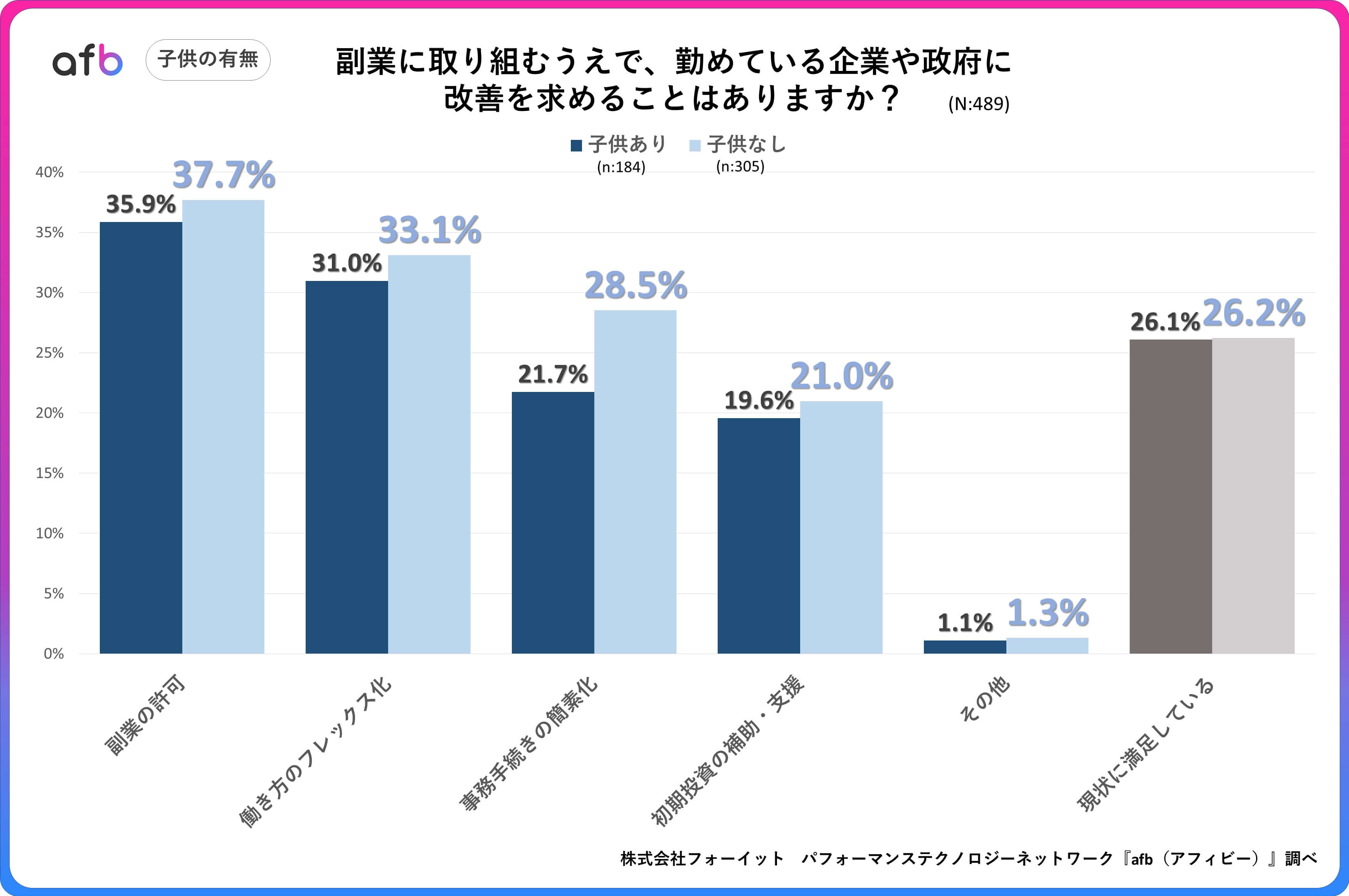 子供の有無で見ると、ほとんどの項目で大きな差はありませんでしたが、「事務手続きの簡素化」に関しては「子供あり」が21.7%だったのに対して、「子供なし」では28.5%で6.8%の差となりました。この項目のみ一定の差が生まれた理由として、出産に伴って煩雑な事務手続きが必要であることが考えられます。出産を経験した方は、出生届・健康保険・児童手当をはじめとした出産後に必要となるさまざまな事務手続きをこなしており、副業に取り組む際に事務手続きが必要だったとしても、耐性がついているため特に面倒だとは思わない方が多いのかもしれません。