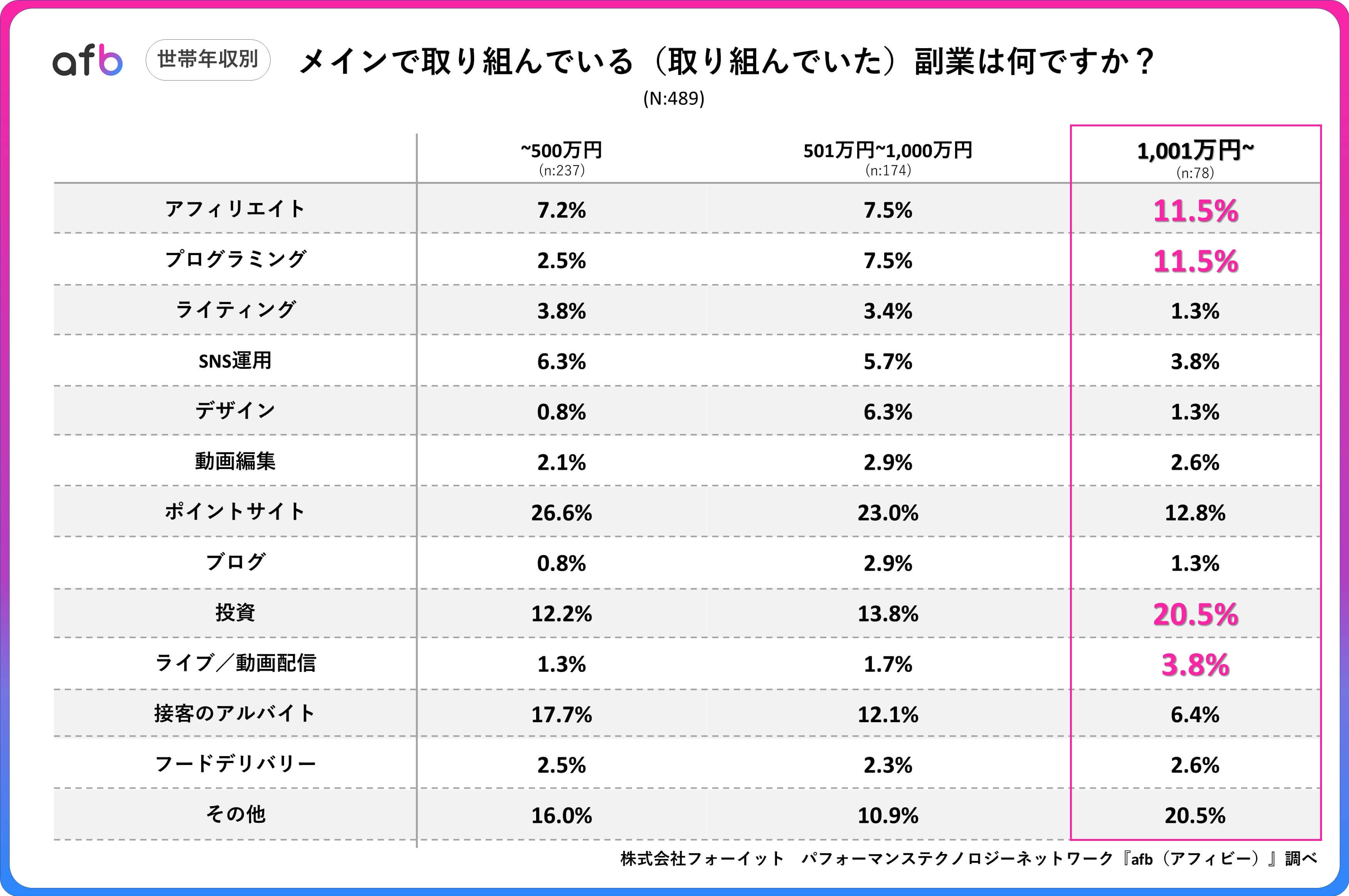 「世帯年収1,001万円~」では、上図の通り、「アフィリエイト」「プログラミング」「投資」「ライブ/動画配信」などに取り組んでいる方が他と比較して多くなりました。