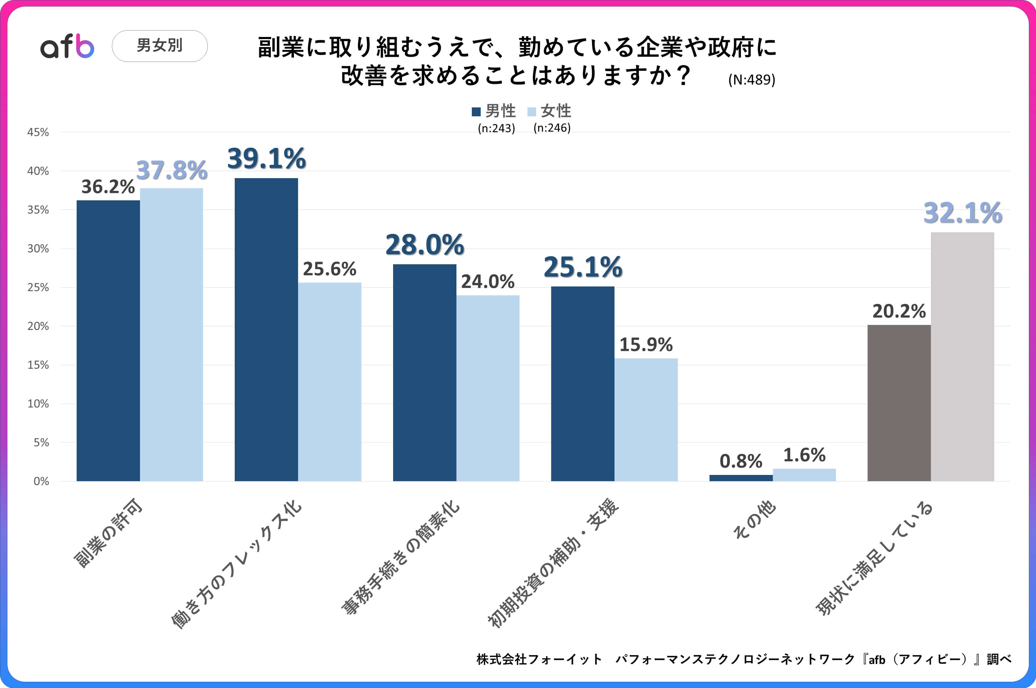 その他、「事務手続きの簡素化」、「初期投資の補助・支援」では男性の回答率が高くなりました。その一方で、「副業の許可」、「現状に満足している」は女性の回答率が高く、特に「現状に満足している」では約12%の差が生まれるという結果でした。