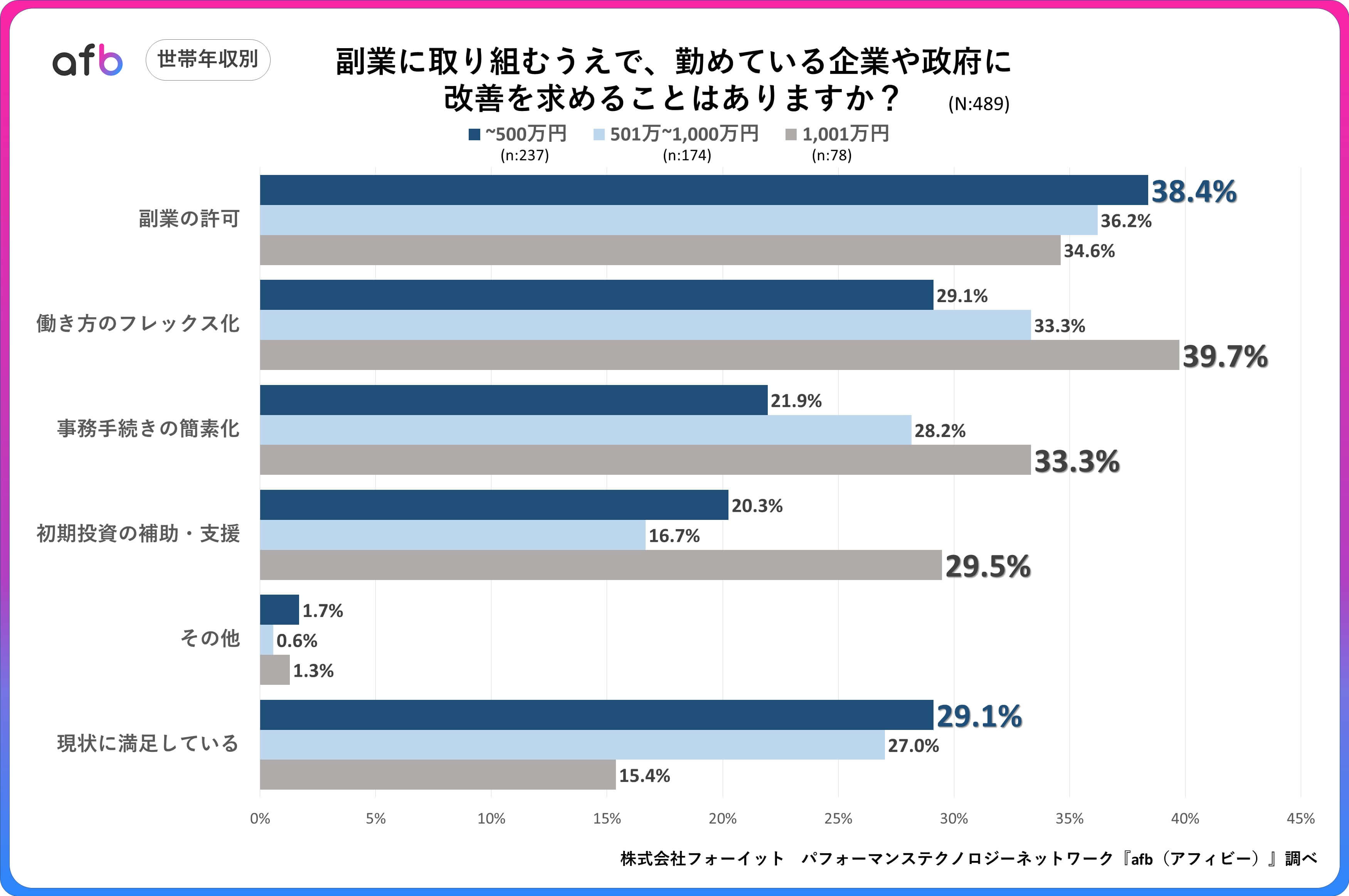 また、企業や政府に改善を求めることとして、他の年収層と最も差がついた項目は「初期投資の補助・支援」で約10%の差が出る結果となりましたが、学習を要する副業をしているため、そのスキル習得までの教材費や講義代、パソコンなどの機器などが必要になり、初期投資の補助や支援への関心が高まったことが推察されます。