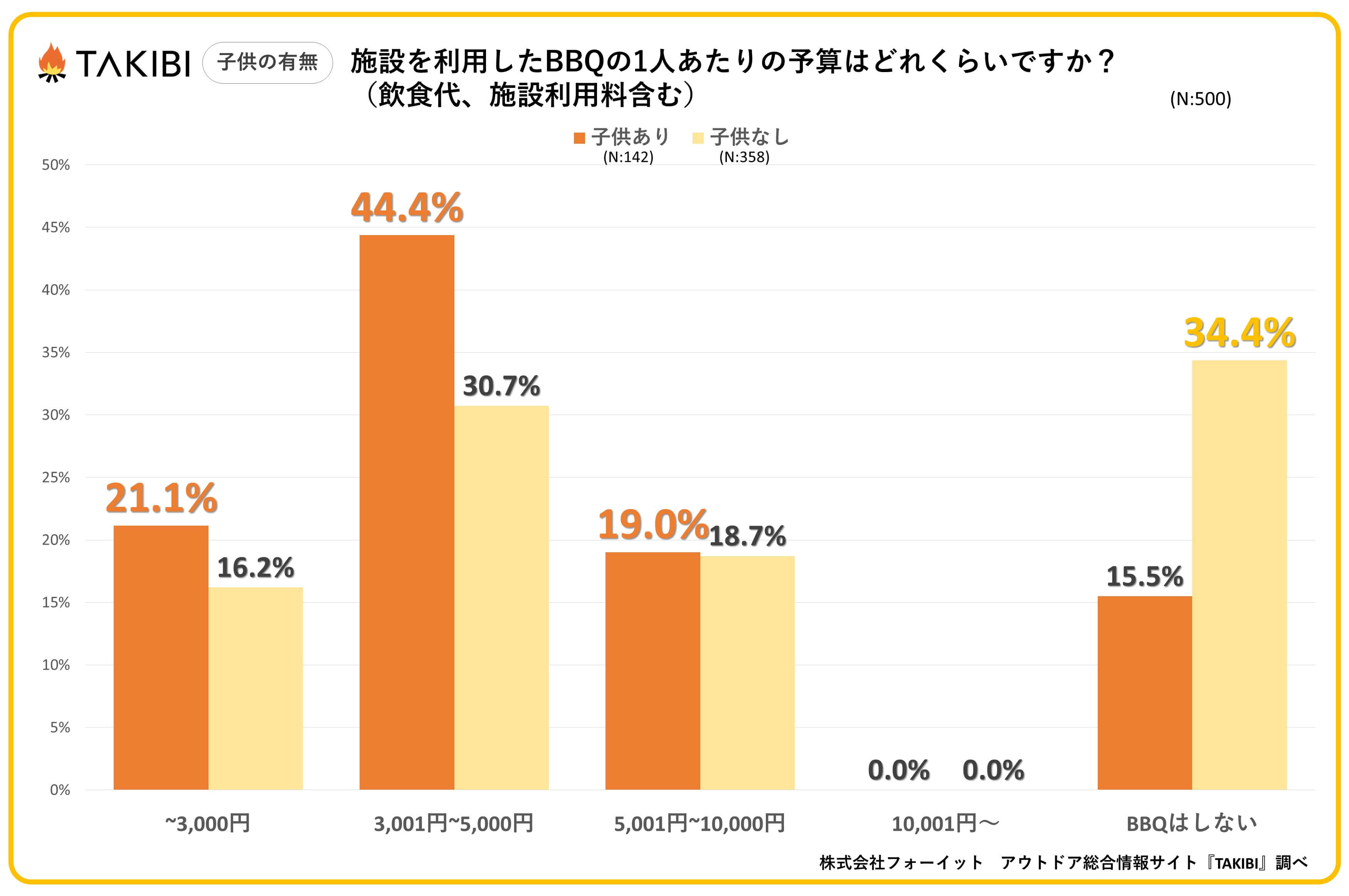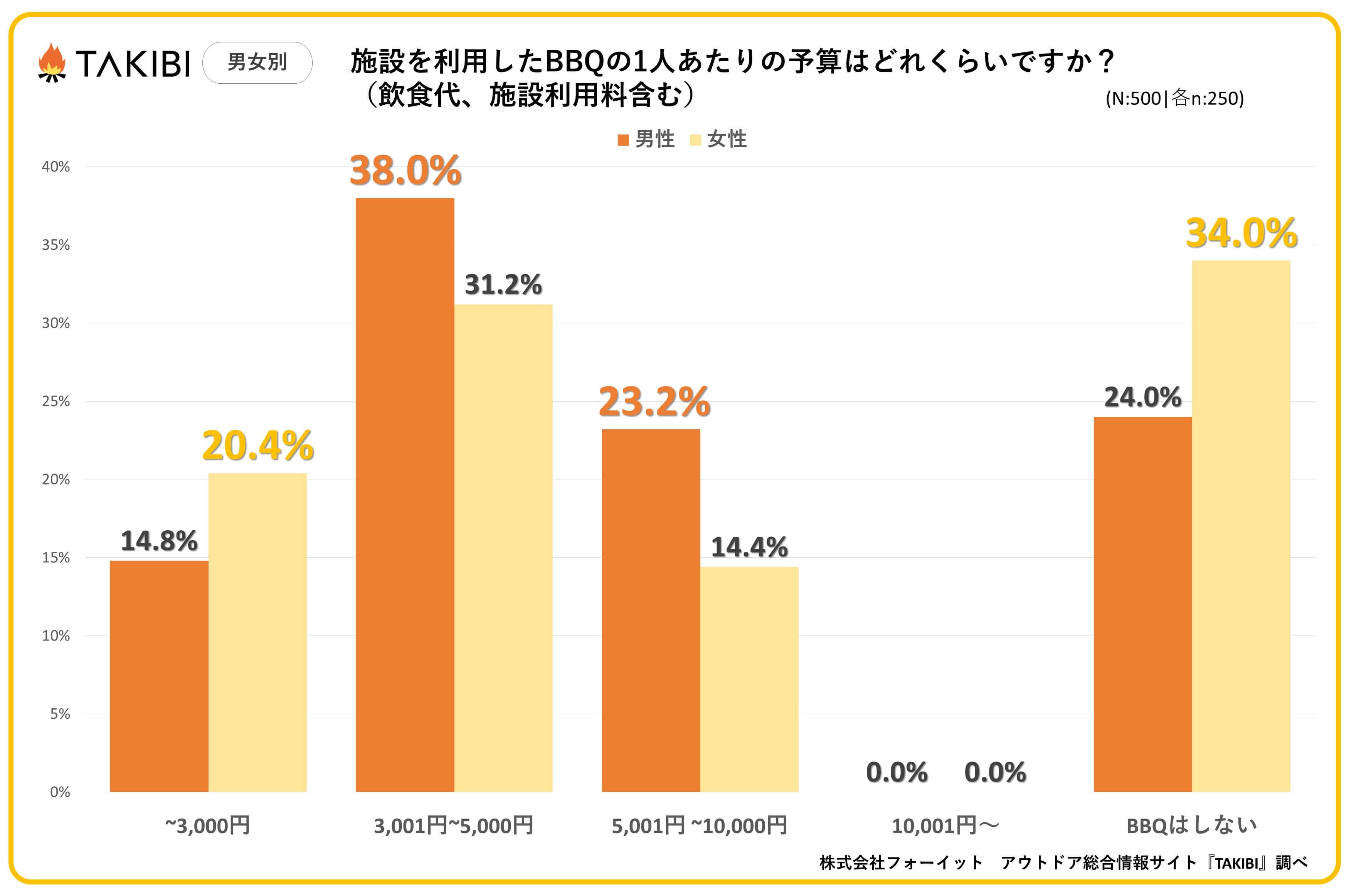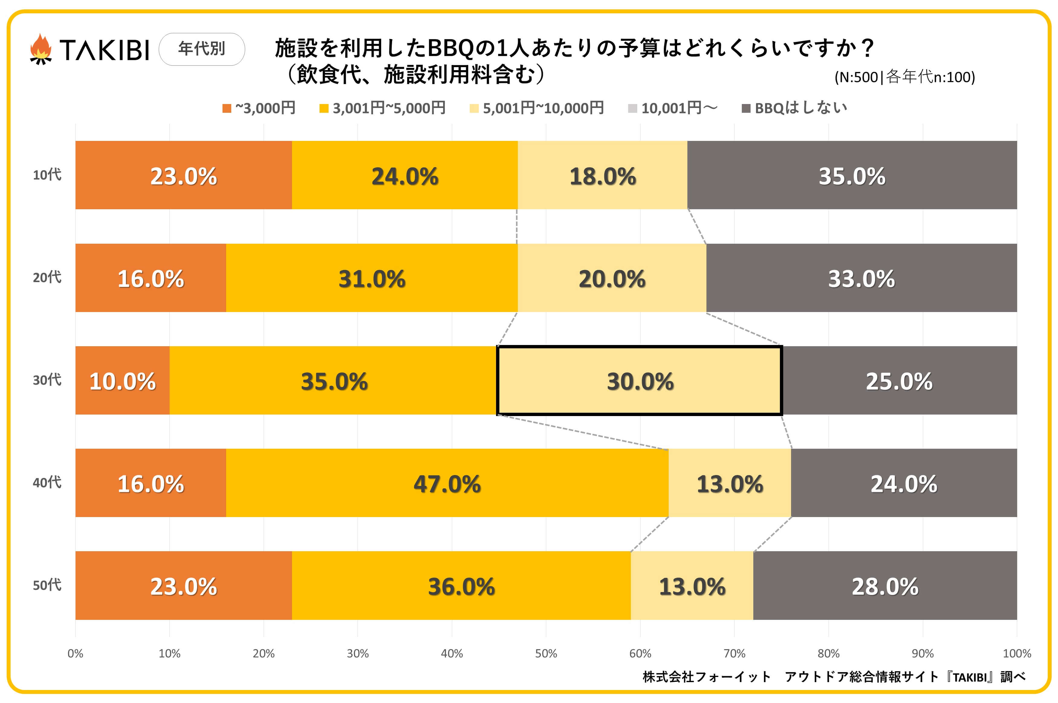 キャンプやグランピングを中心としたアウトドア総合情報サイト「TAKIBI」の運営をおこなう株式会社フォーイットは、全国の10代~50代までの男女500人を対象にバーベキューの予算に関するアンケートを実施し、男女別・年代別等の特徴についてまとめました。