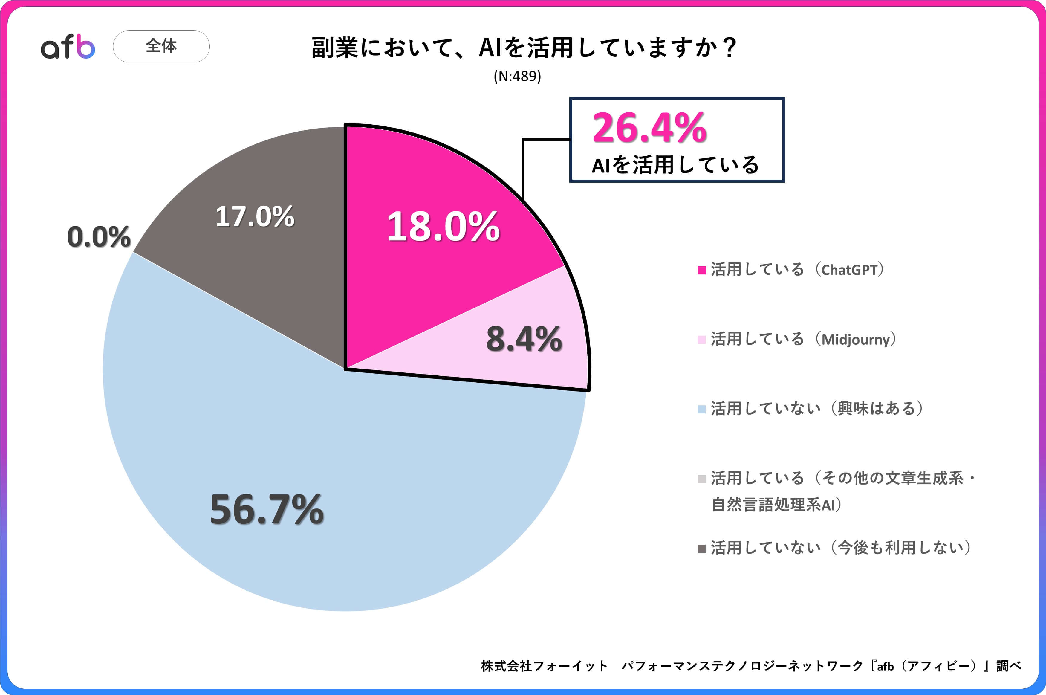 事前調査で「副業をしたことがある」と回答した10代~60代の男女を対象に、「副業において、AIを活用していますか?」というアンケートを実施したところ、「活用している」と回答した方は全体の26.4%でした。その内訳は、「ChatGPT」が18.0%、「Midjourney」が8.4%となりました。また、最も多かった回答は「活用していない(興味はある)」の56.7%で、「活用していない(今後も利用しない)」の17.0%と比較して大きな差が生まれました。全体的に見ると、副業にAIを活用することにポジティブな回答が約8割にのぼるという結果になりました。