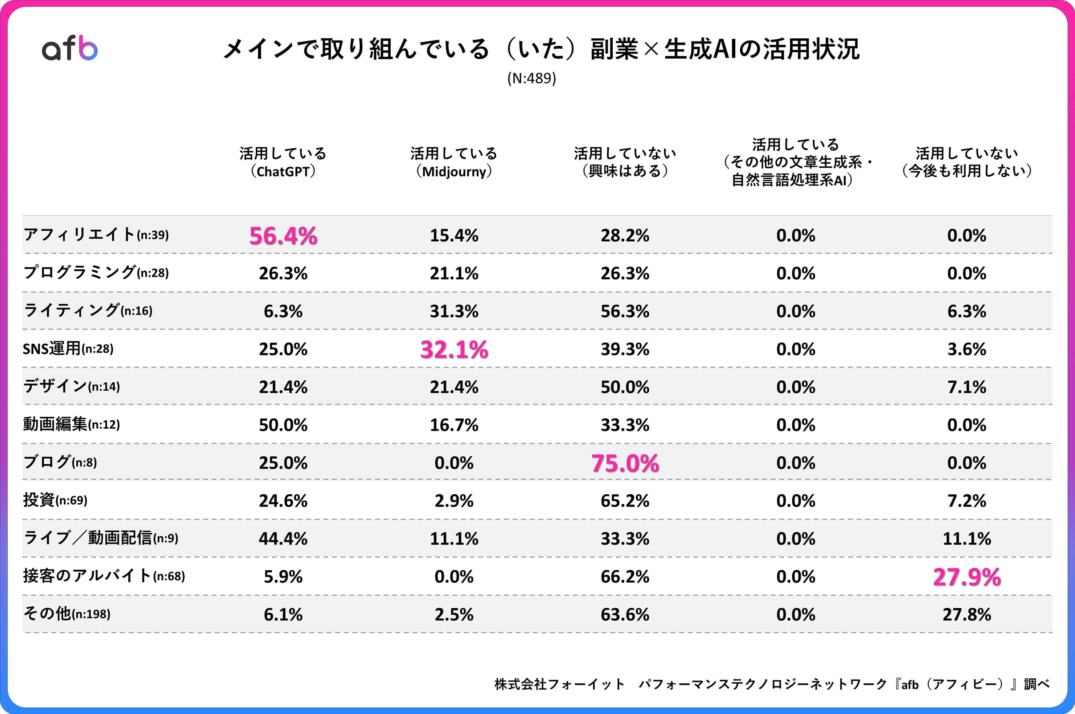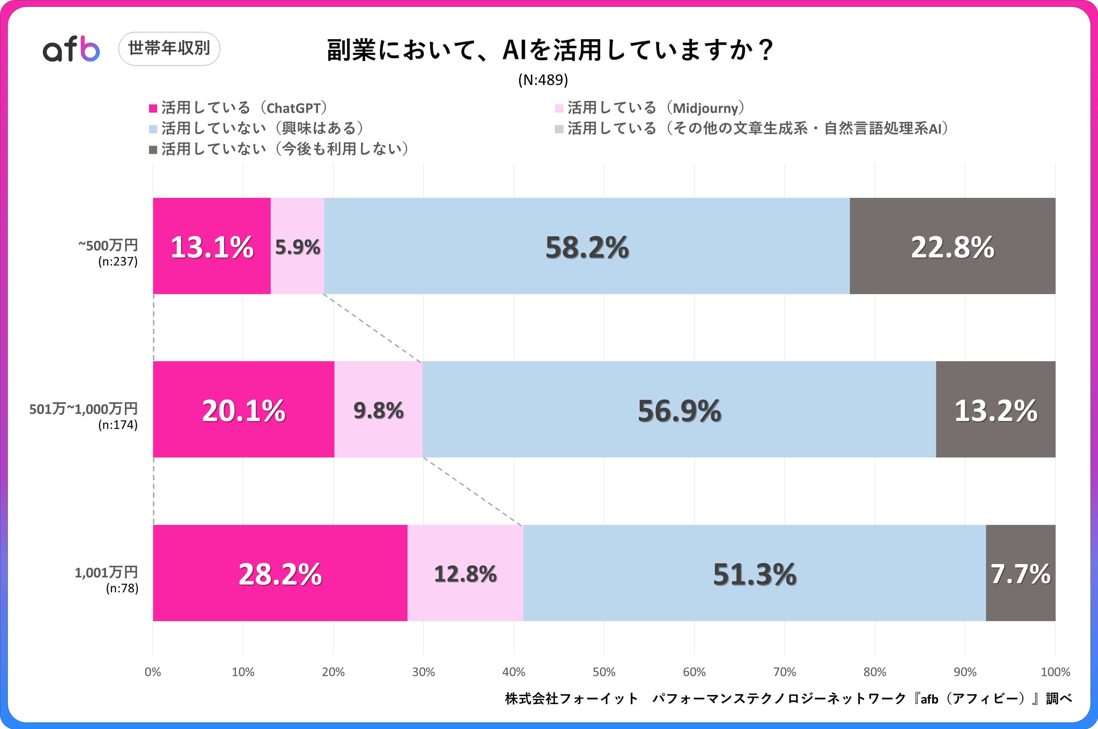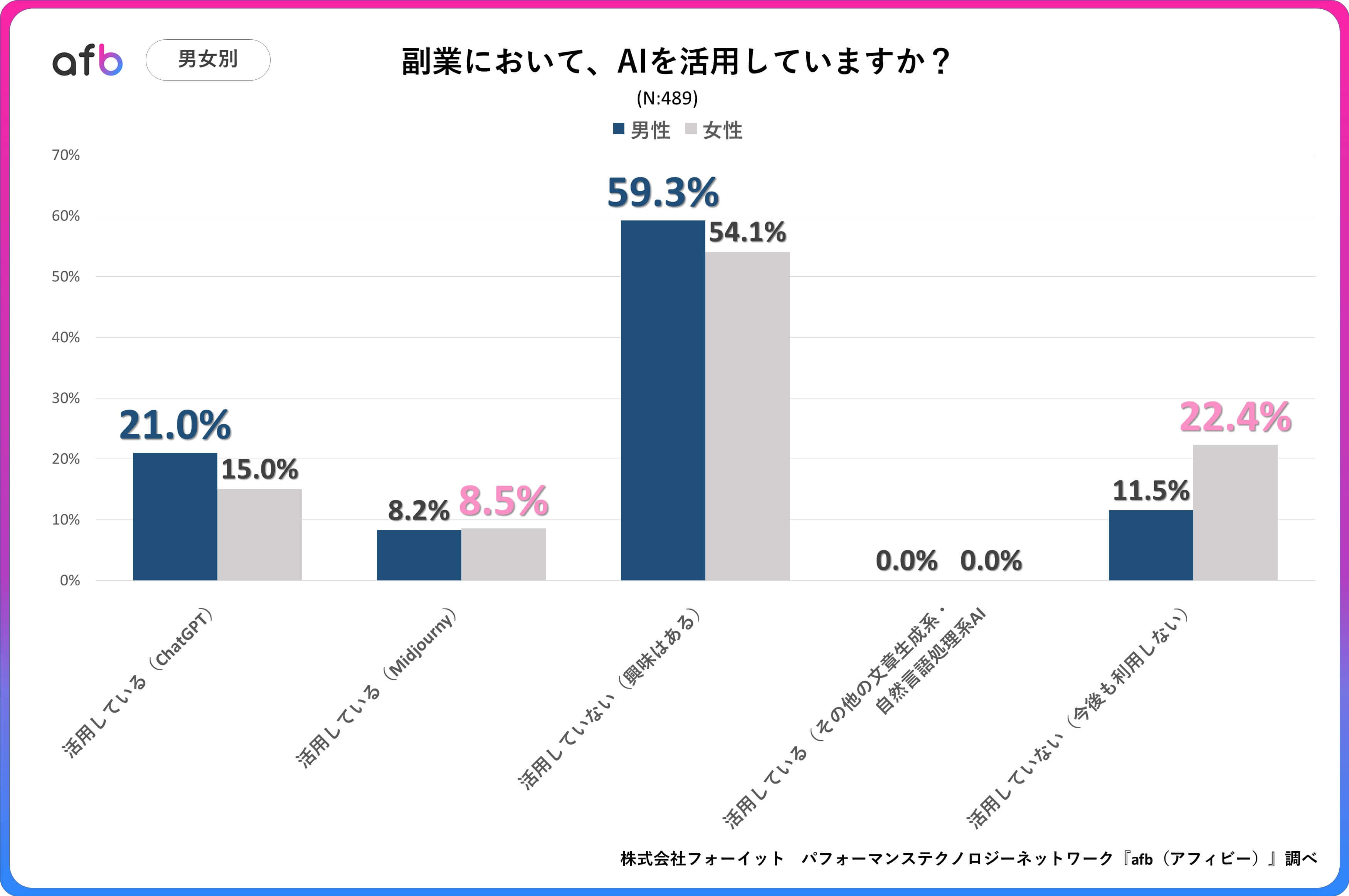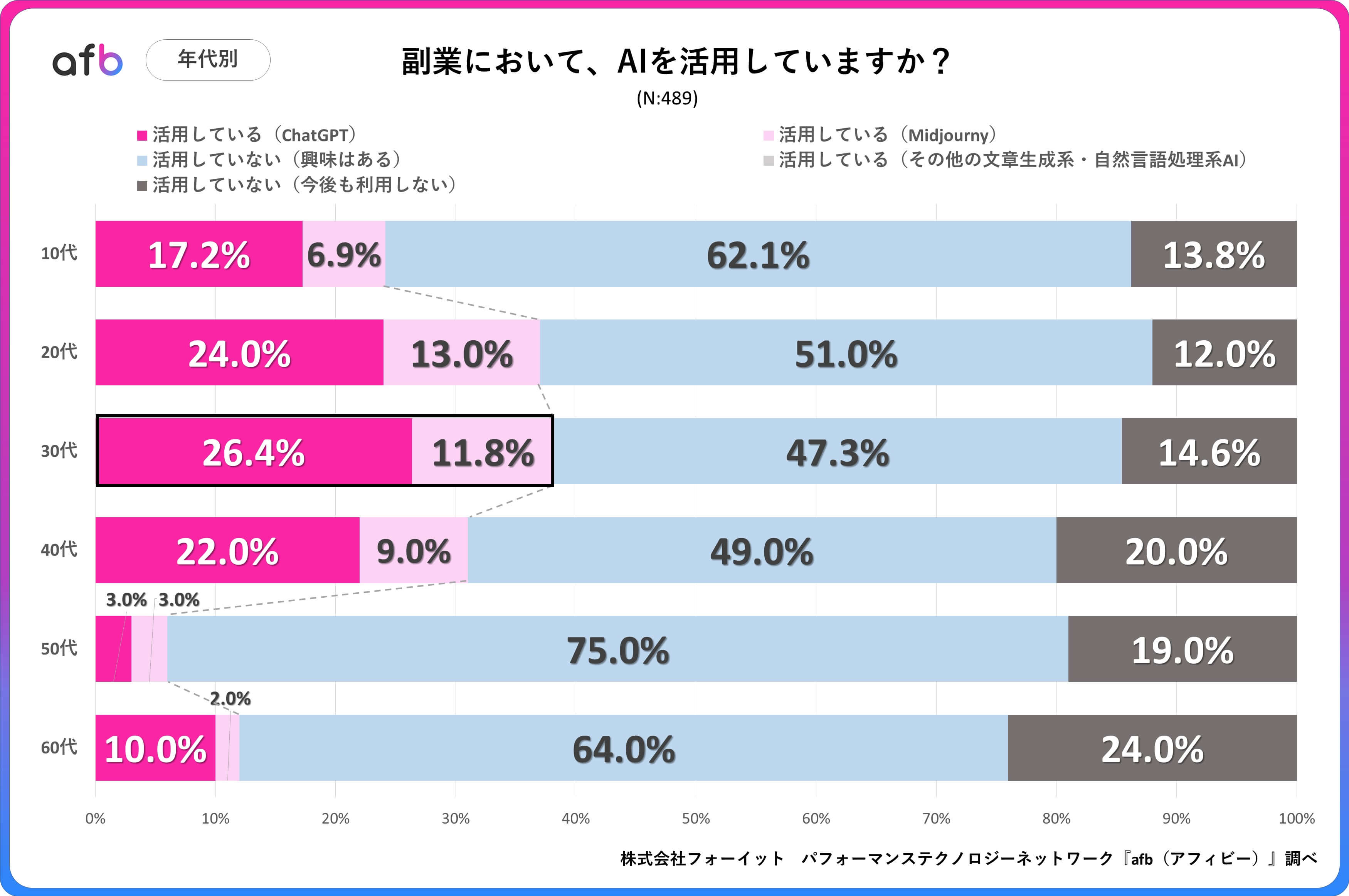 パフォーマンステクノロジーネットワーク「afb(アフィビー)」の開発運用をおこなう株式会社フォーイットは、全国の10代~60代までの男女500人を対象に副業に関するアンケートを実施し、年代別・男女別等の特徴についてまとめました。