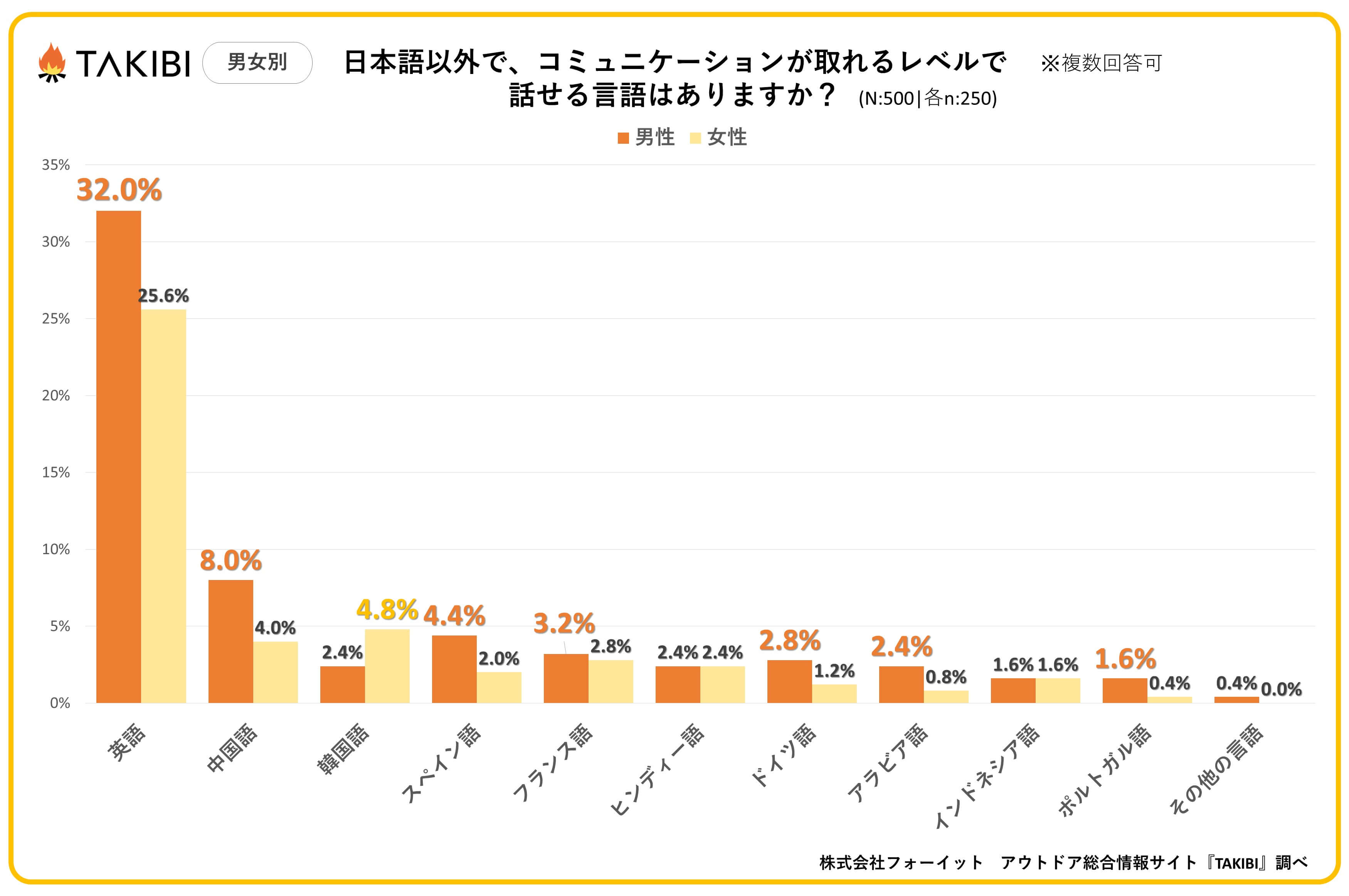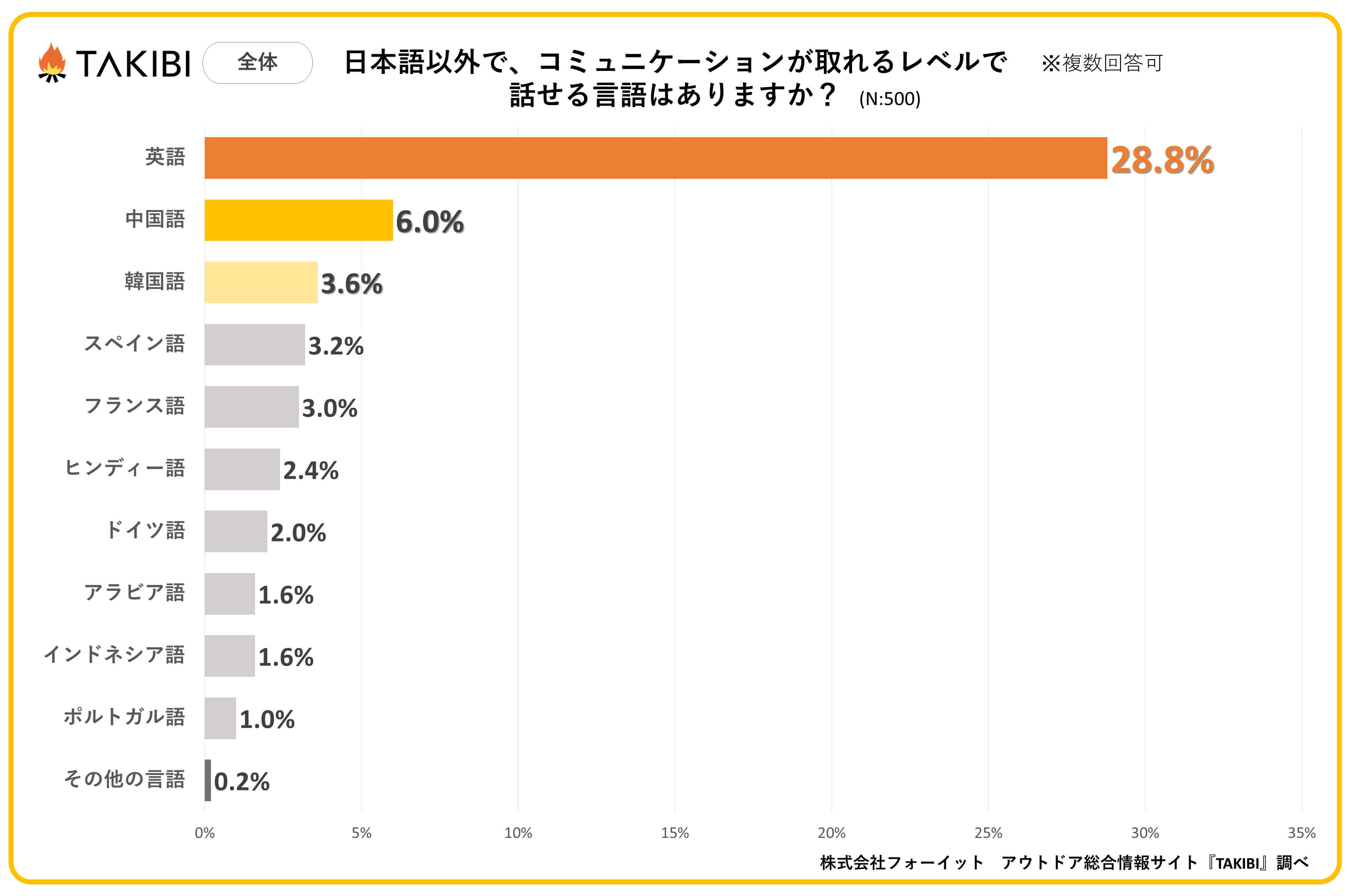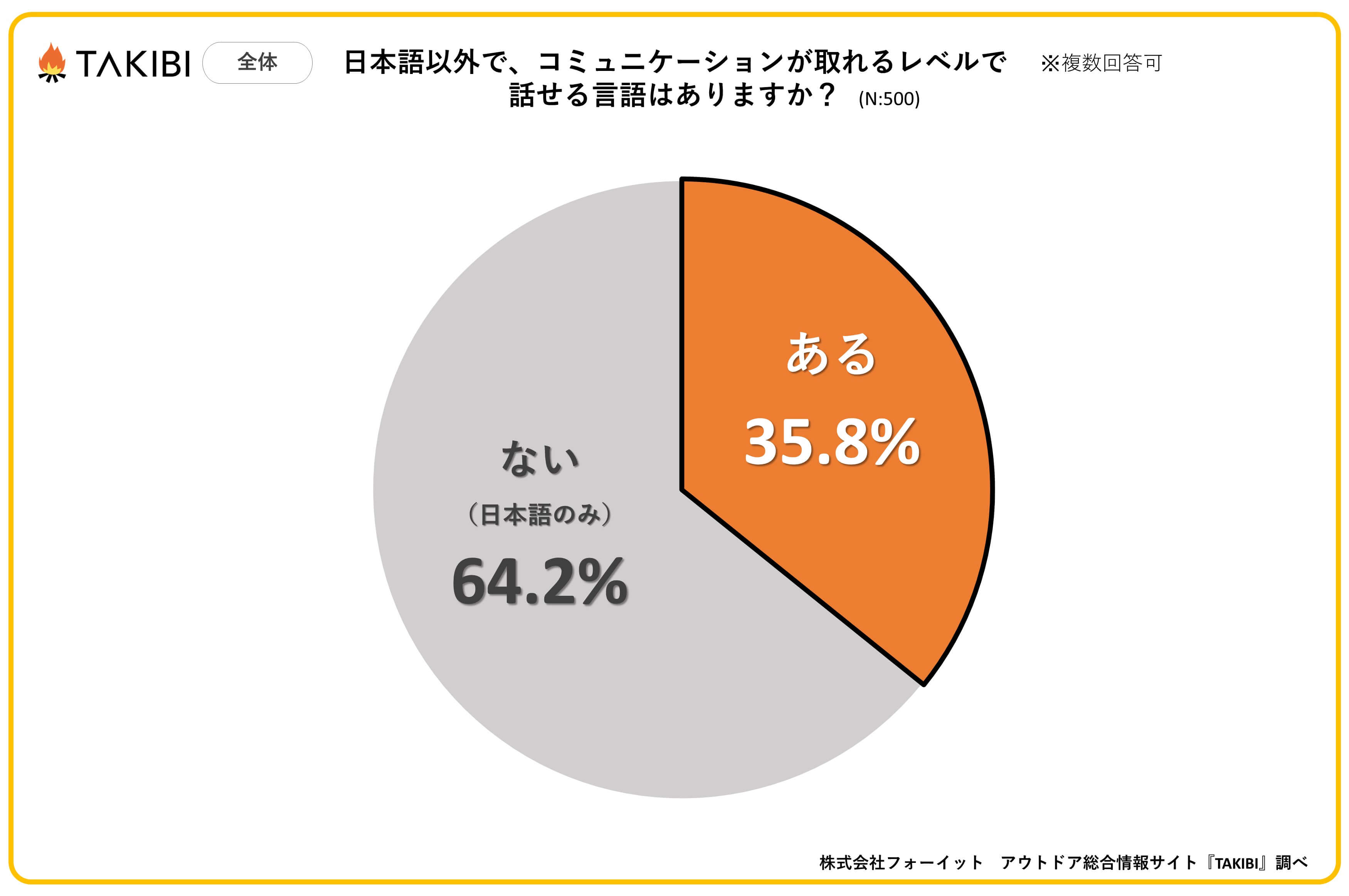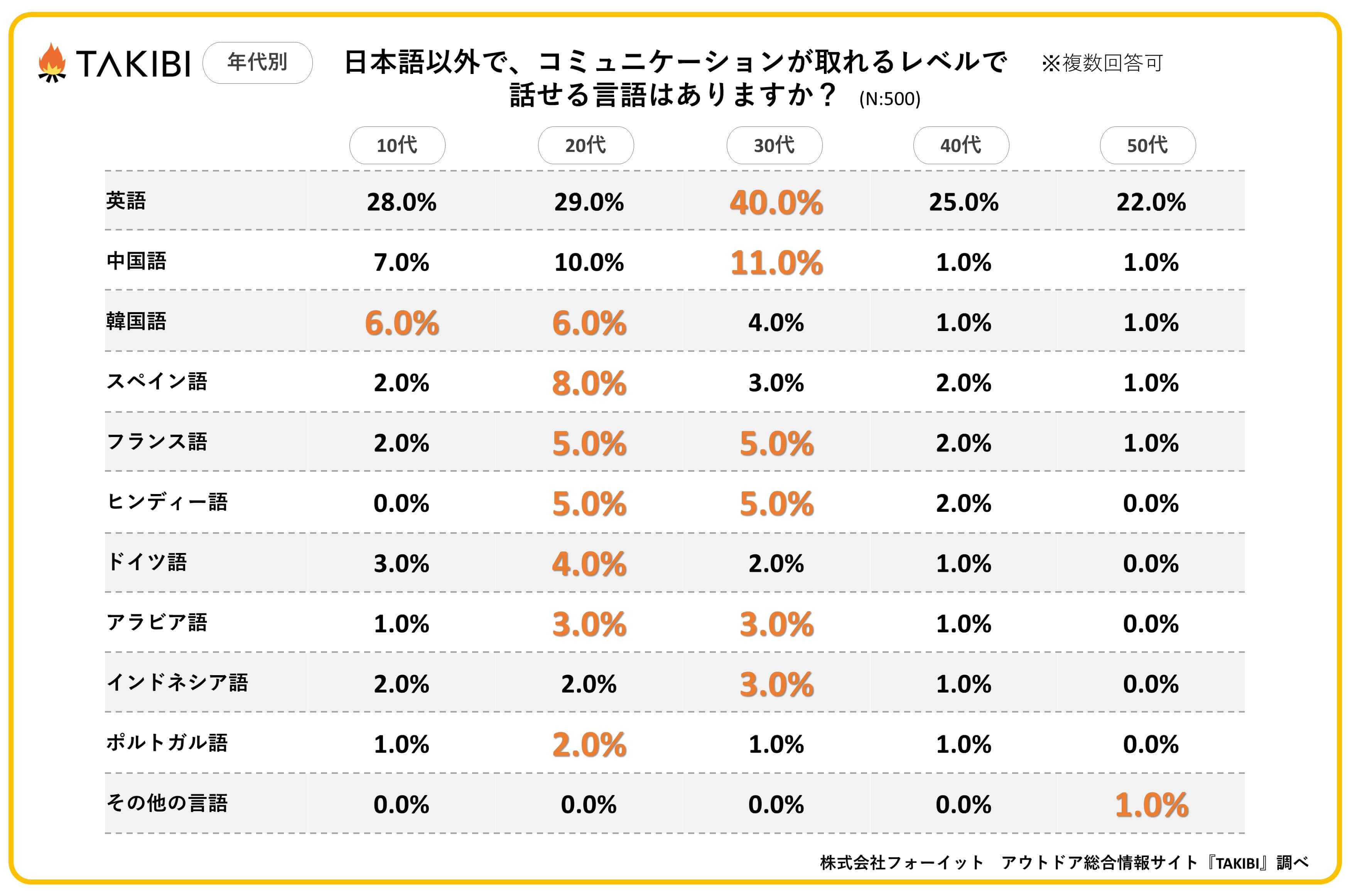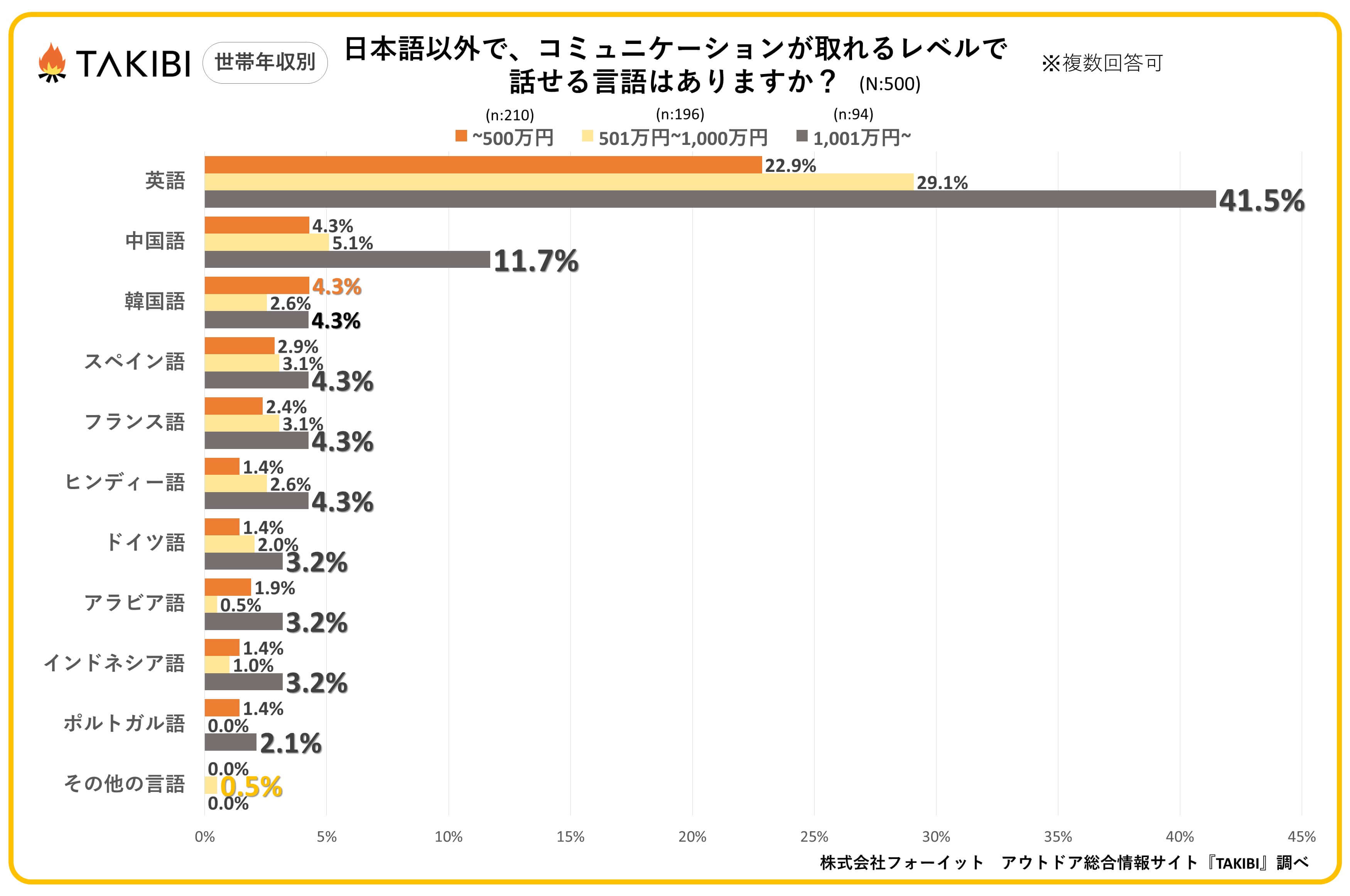 キャンプやグランピングを中心としたアウトドア総合情報サイト「TAKIBI」の運営をおこなう株式会社フォーイットは、全国の10代~50代までの男女500人を対象に言語に関するアンケートを実施し、年代別・世帯年収別等の特徴についてまとめました。
