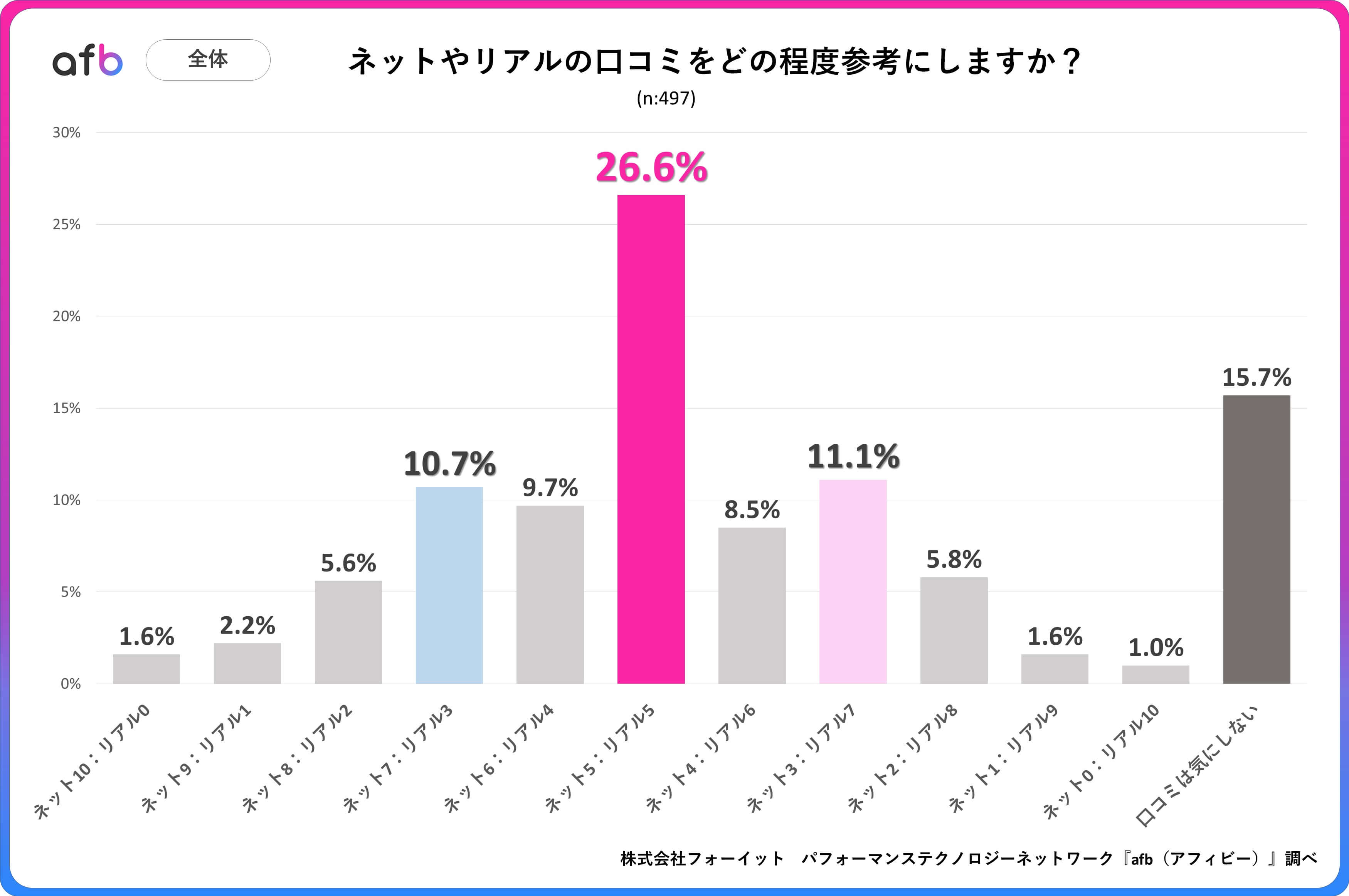 全国の10代~60代の男女を対象に、「ネットやリアルの口コミをどの程度参考にしますか?」というアンケートを実施したところ、気にしないと回答した方を除き、最も多かった回答は「ネット5:リアル5」で26.6%でした。次いで、「ネット3:リアル7」が11.1%、「ネット7:リアル3」が10.7%で続くという結果になりました。