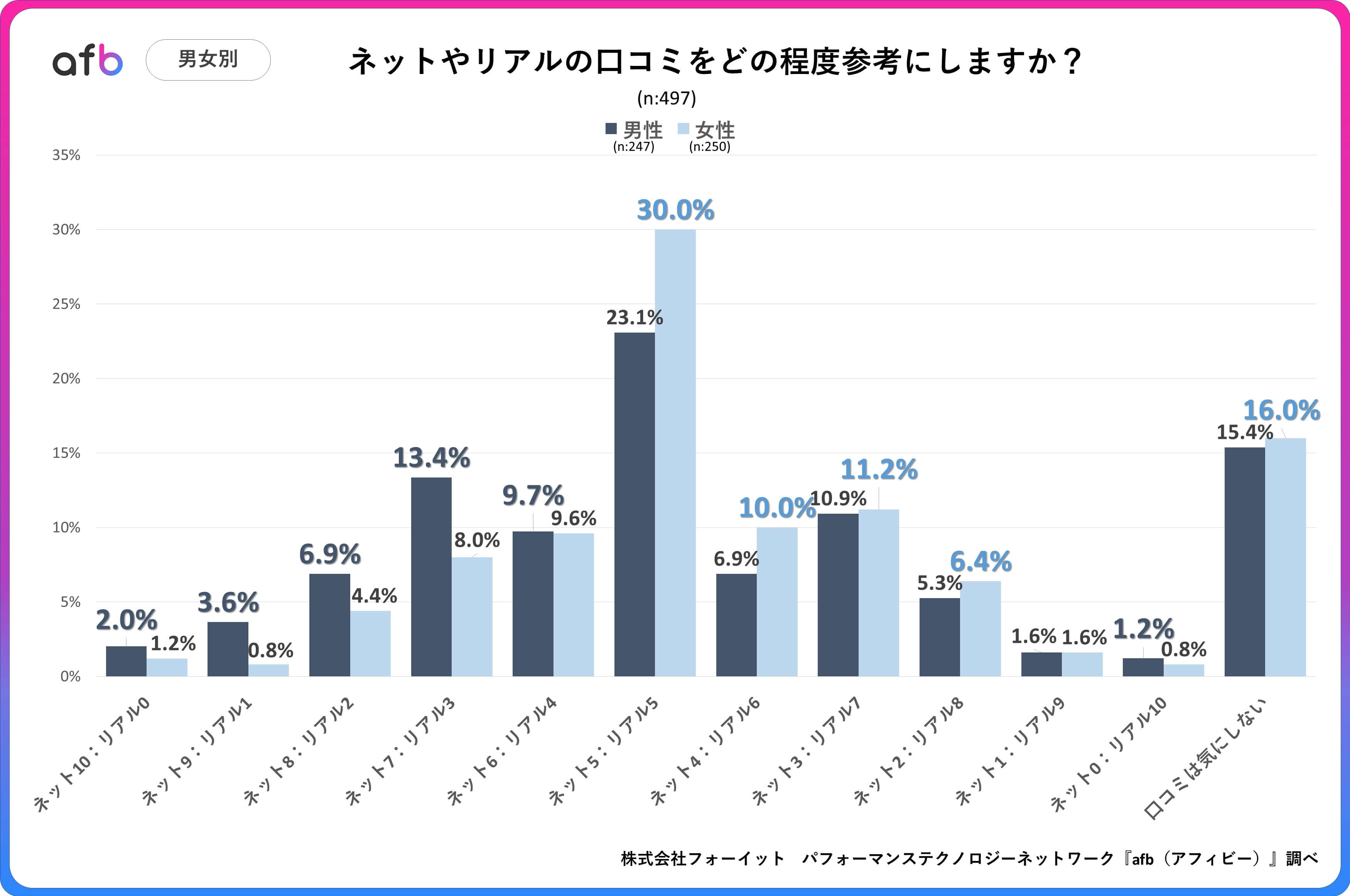 パフォーマンステクノロジーネットワーク「afb(アフィビー)」の開発運用をおこなう株式会社フォーイットは、全国の10代~60代までの男女500人を対象に口コミに関するアンケートを実施し、年代別・男女別等の特徴についてまとめました。