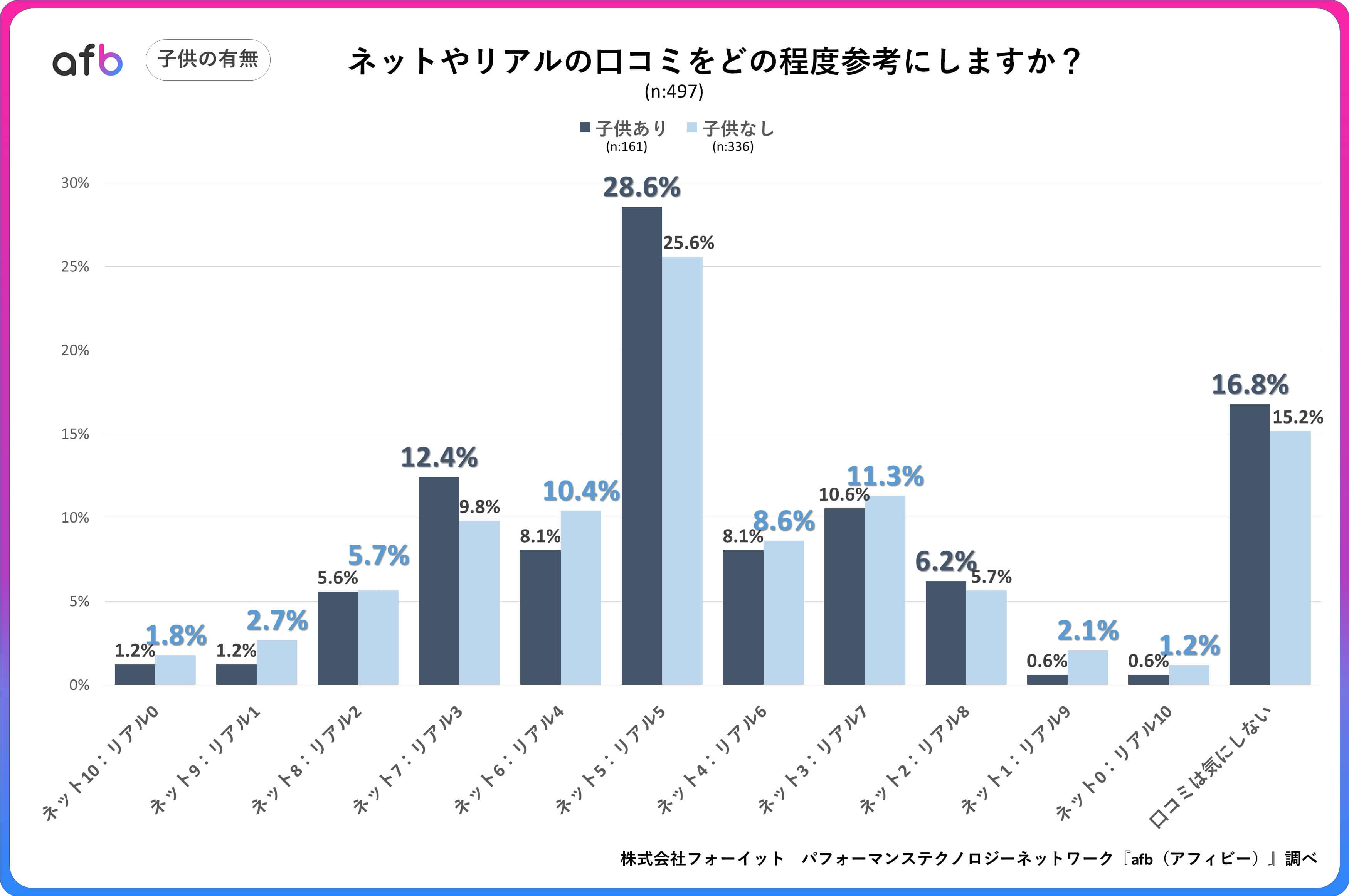 ネット上かリアルの口コミどちらを参考にするかに関して、子供の有無はそこまで影響を及ぼしておらず、購入する商品や居住スタイルが影響していることが推察される結果となりました。
