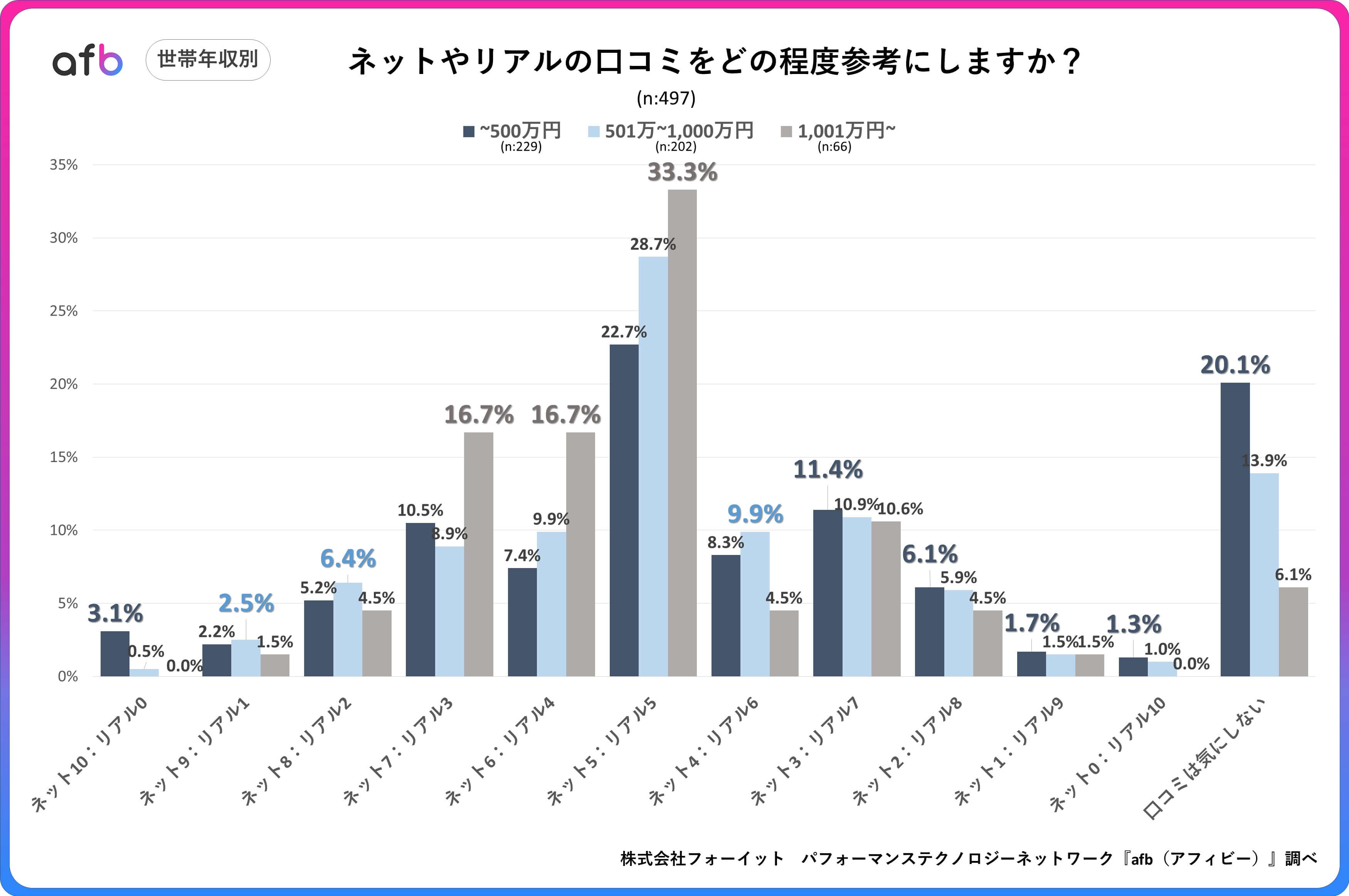 世帯年収別で見ると、どの層でも回答率が最も高かったのは「ネット5:リアル5」という結果でした。収入にかかわらず、口コミを参考にする際はネットとリアルを同じくらい重視する方が多いようです。また「ネット7:リアル3」、「ネット6:リアル4」に注目すると、世帯年収1,001万円〜の層の回答が高くなりました。