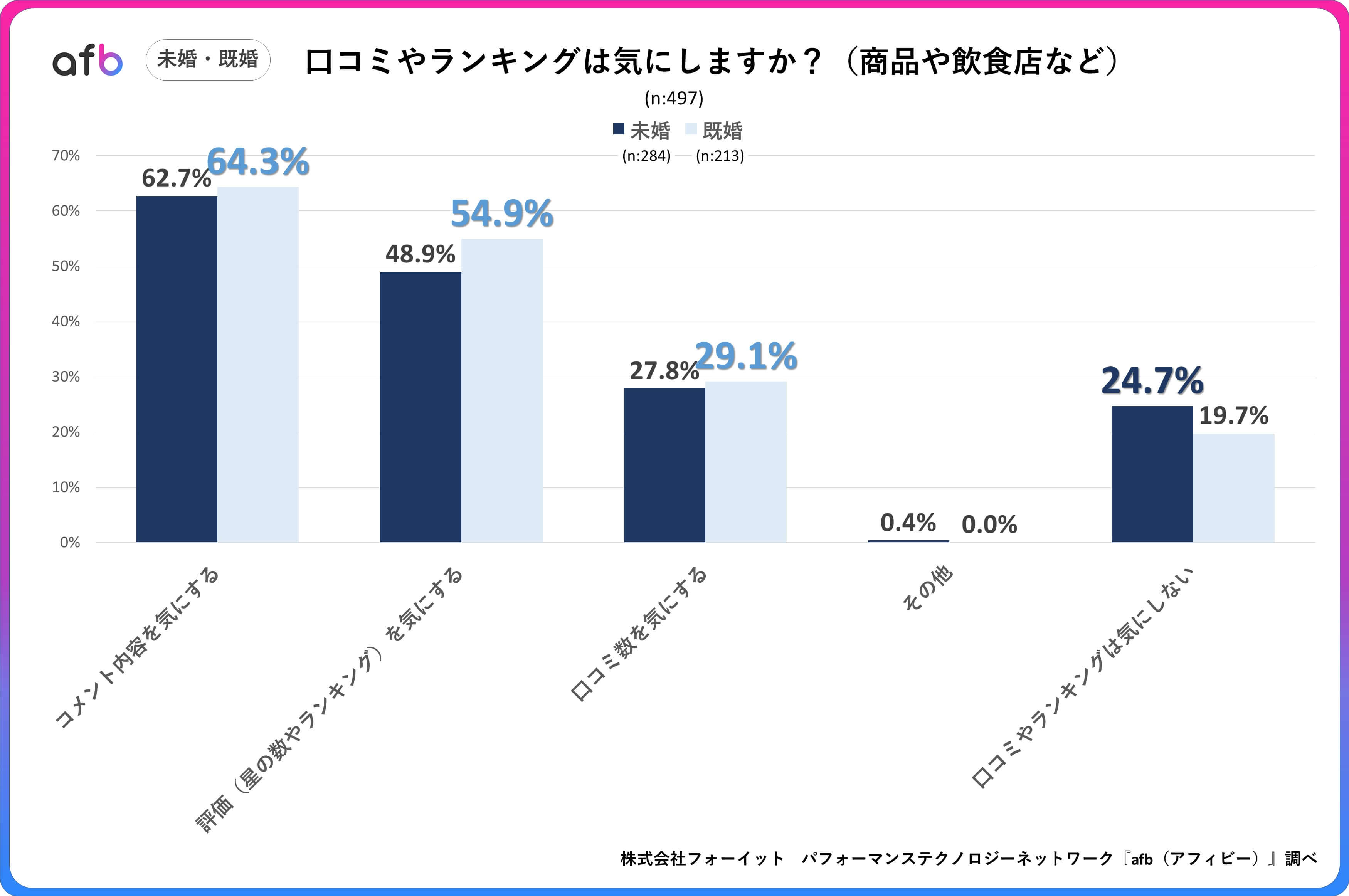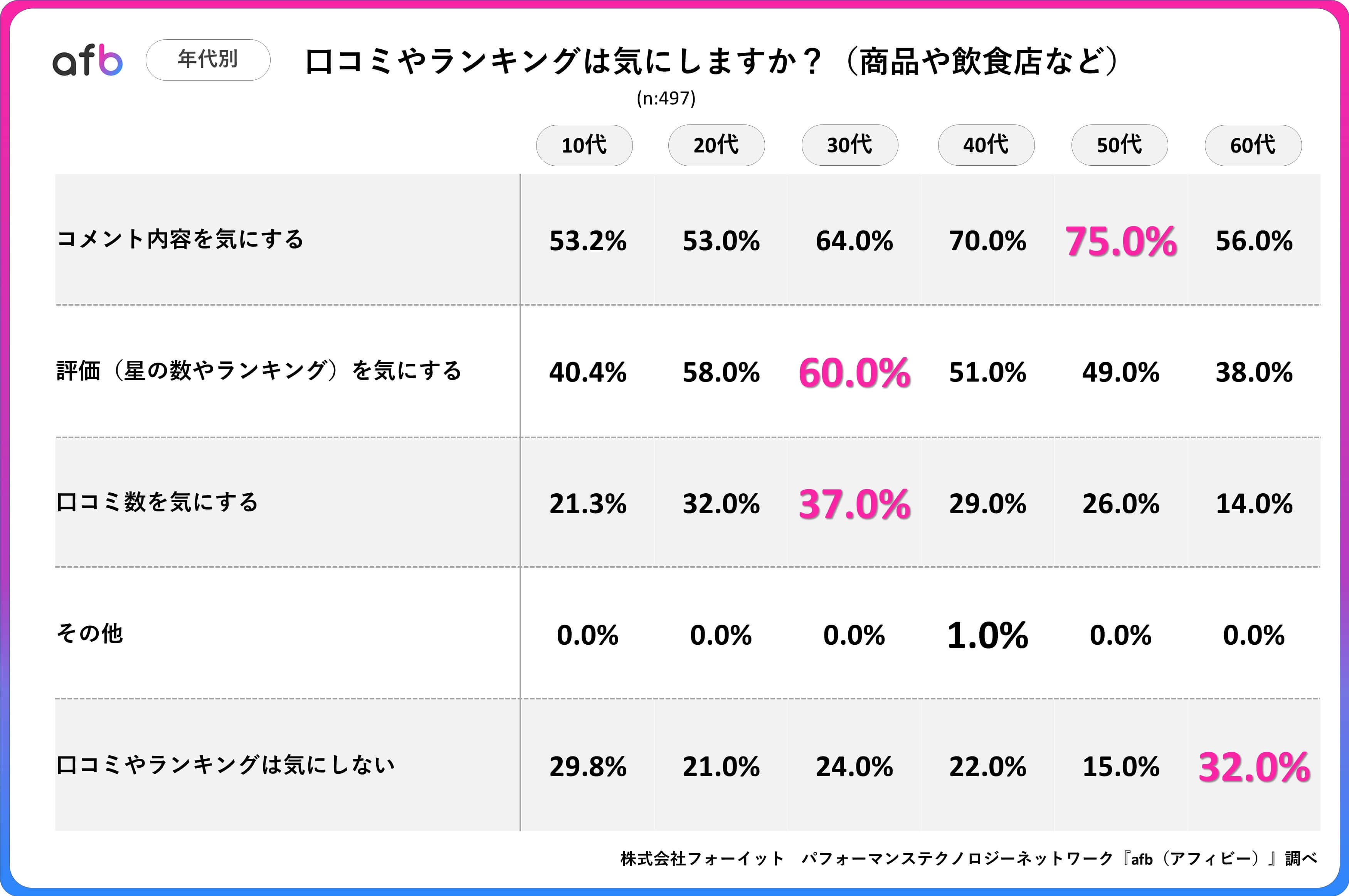 パフォーマンステクノロジーネットワーク「afb(アフィビー)」の開発運用をおこなう株式会社フォーイットは、全国の10代~60代までの男女500人を対象に口コミやランキングに関するアンケートを実施し、年代別・男女別等の特徴についてまとめました。