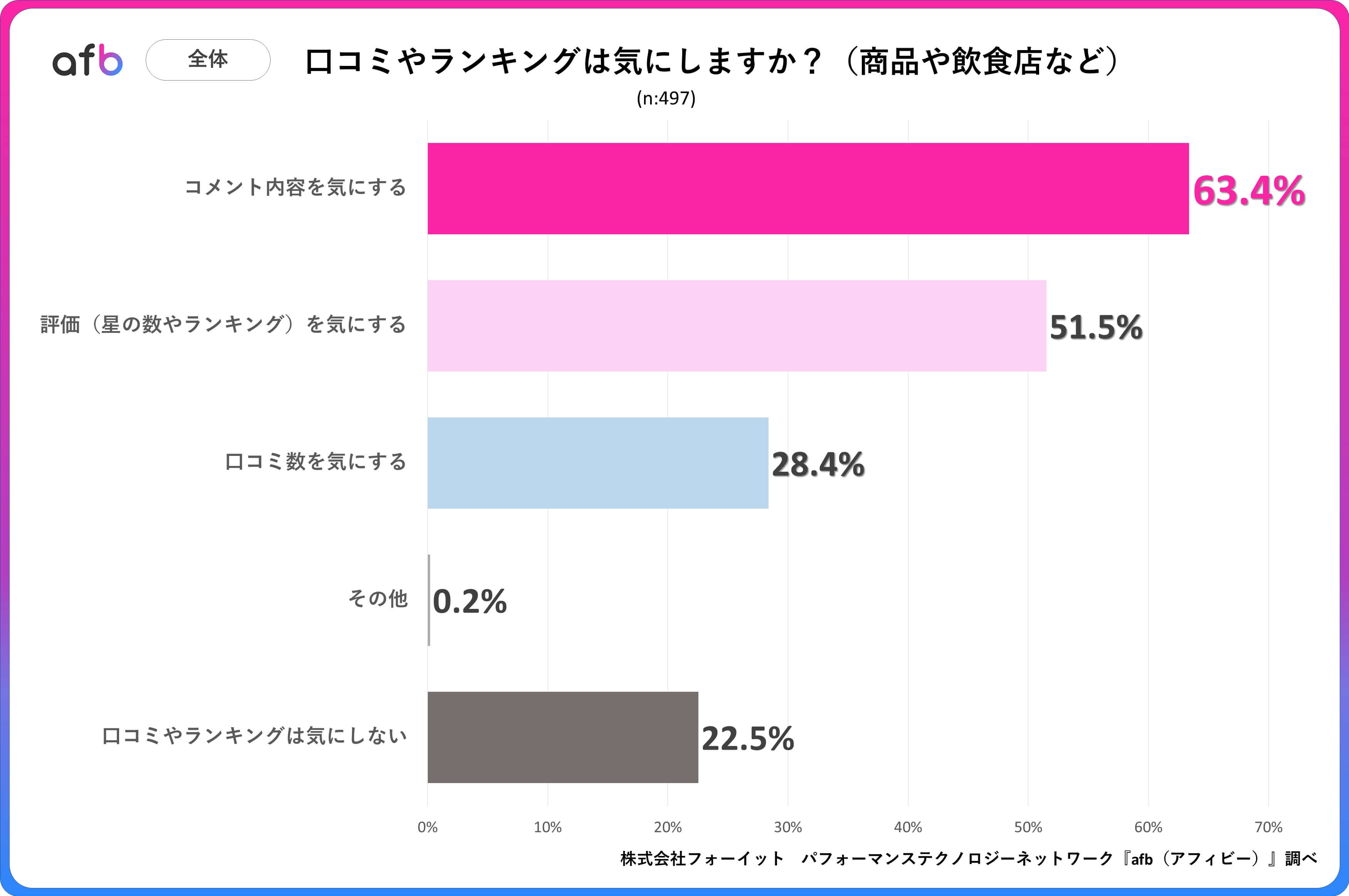 10代~60代の男女を対象に、「口コミやランキングは気にしますか?(商品や飲食店など)」というアンケートを実施したところ、約80%の方が気にすると回答しました。その内最も多かったのは、「コメント内容を気にする」で63.4%、次いで「評価(星の数やランキング)を気にする」が51.5%、「口コミ数を気にする」が28.4%で続くという結果になりました。一方で、「口コミやランキングは気にしない」と回答した方は22.5%にとどまっています。