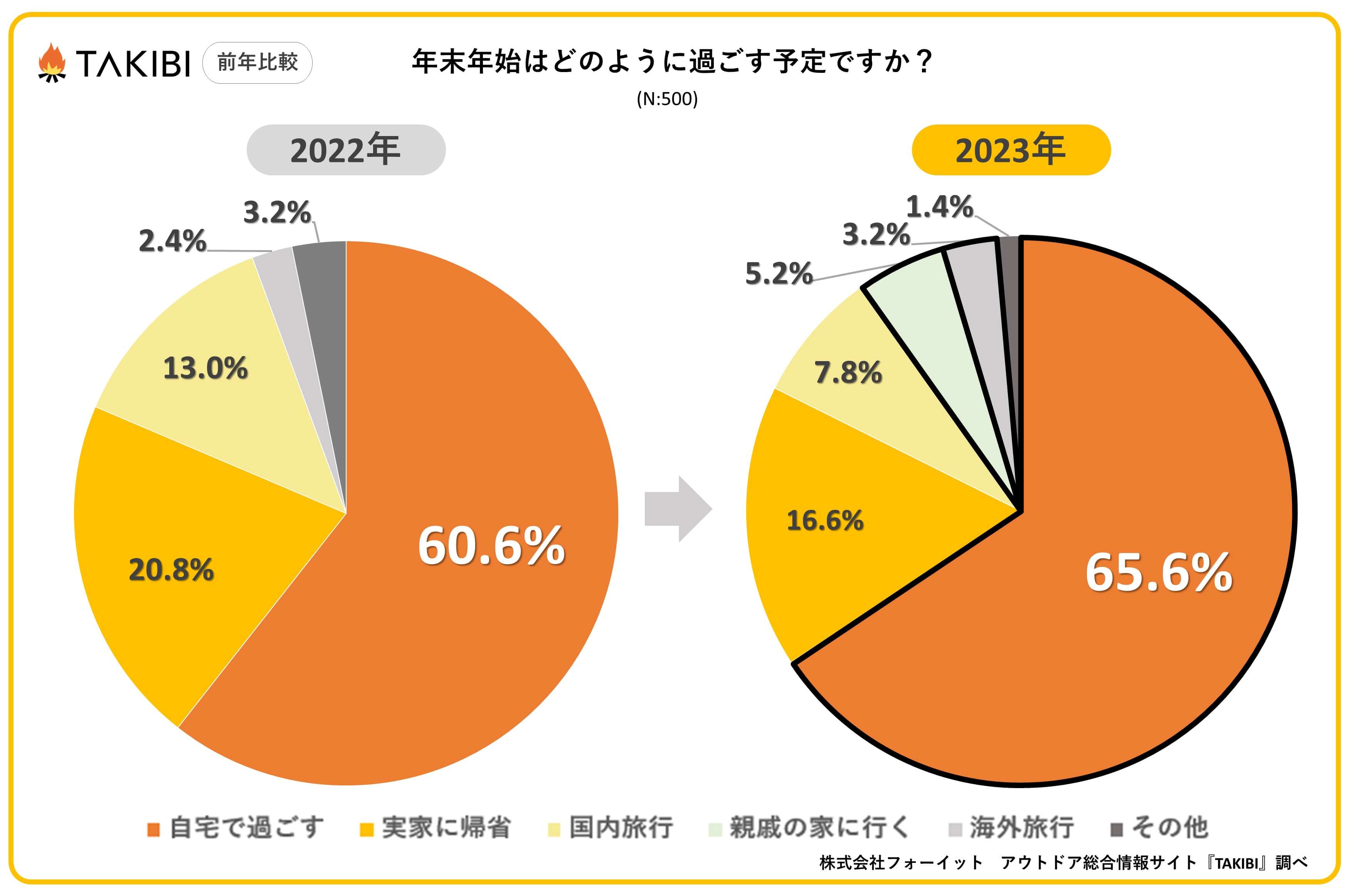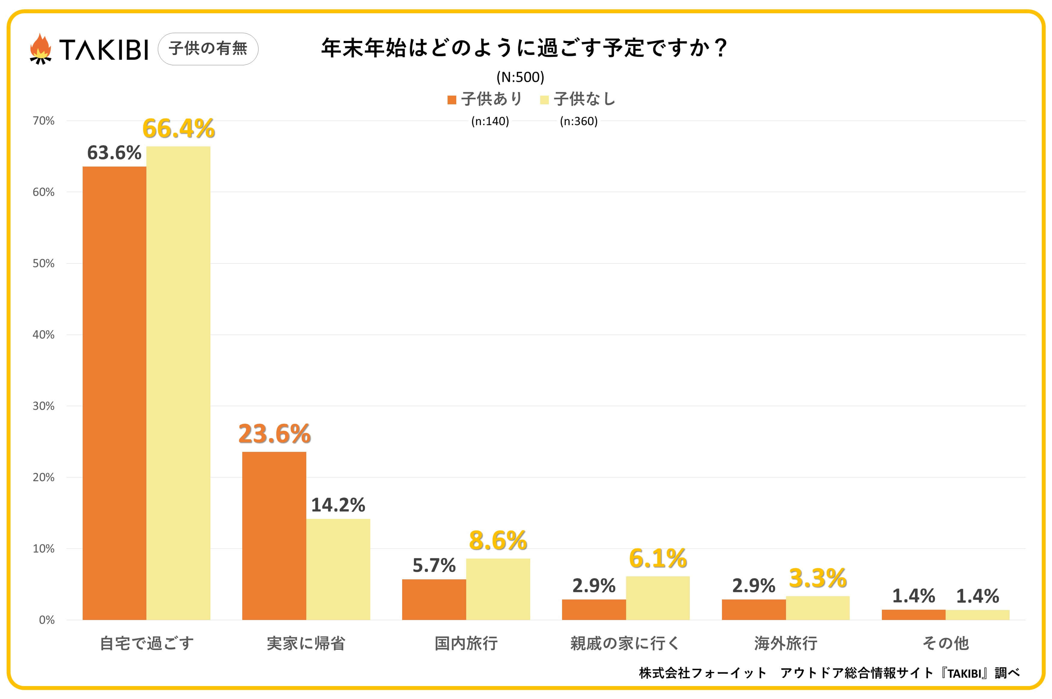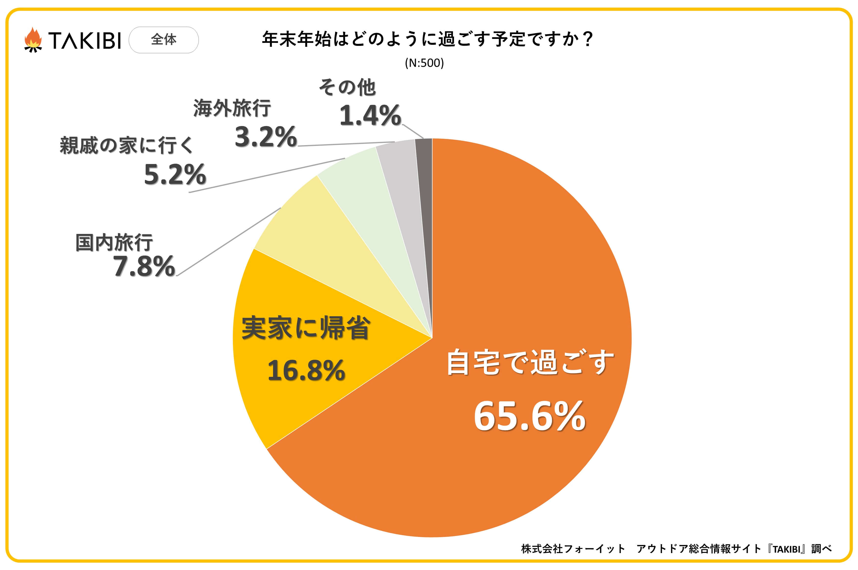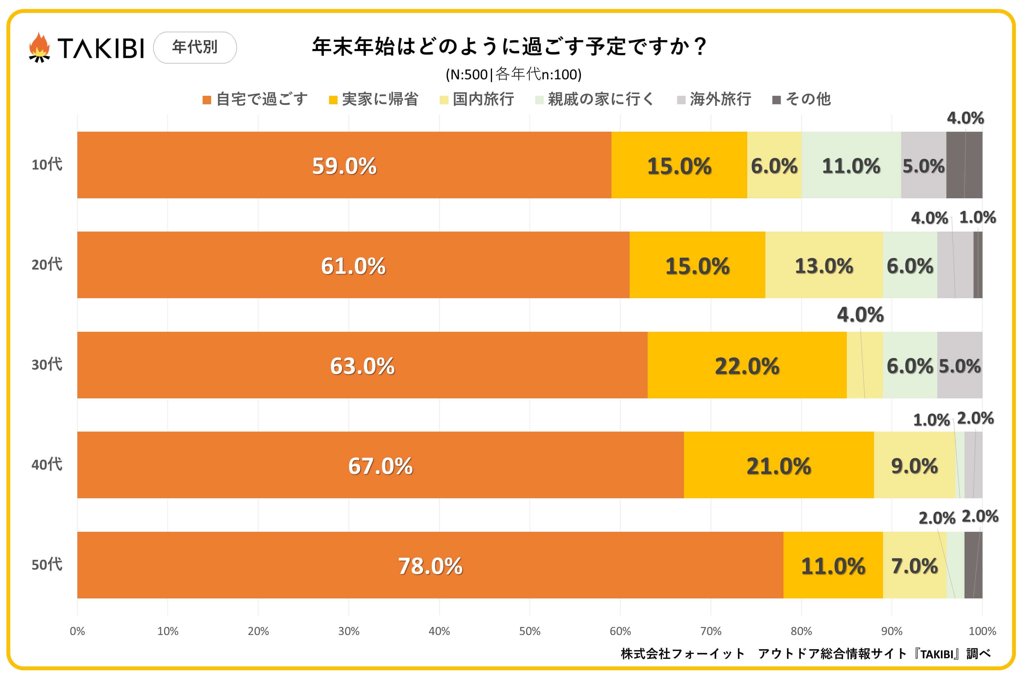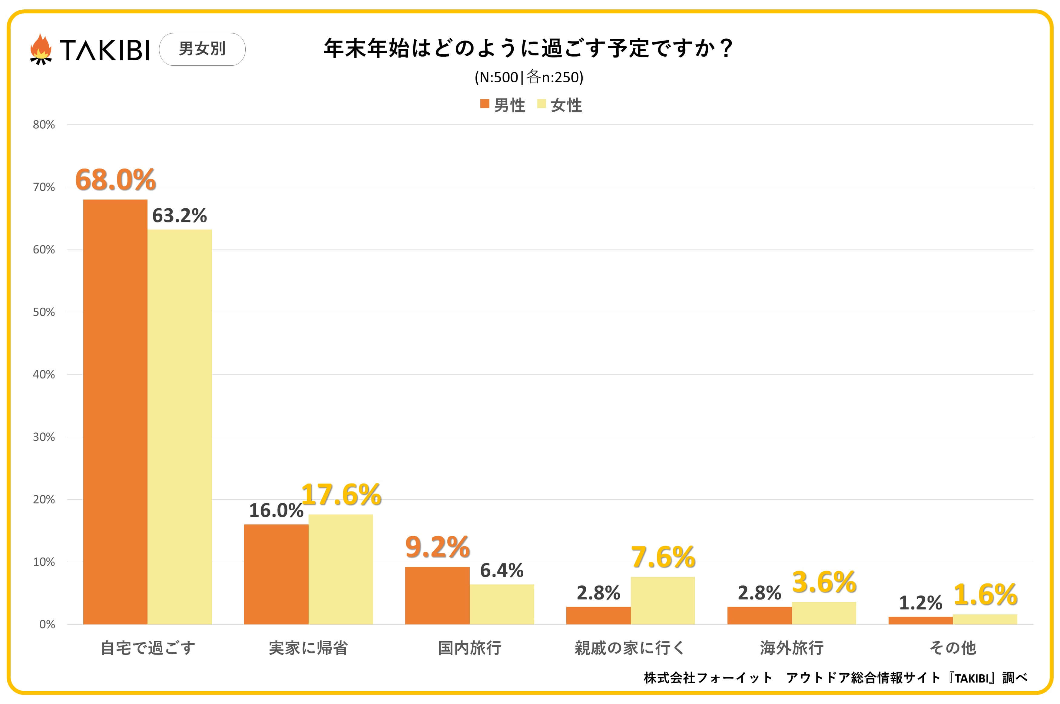 キャンプやグランピングを中心としたアウトドア総合情報サイト「TAKIBI」の運営をおこなう株式会社フォーイットは、全国の10代~50代までの男女500人を対象に年末年始の過ごし方に関するアンケートを実施し、男女別・年代別等の特徴についてまとめました。