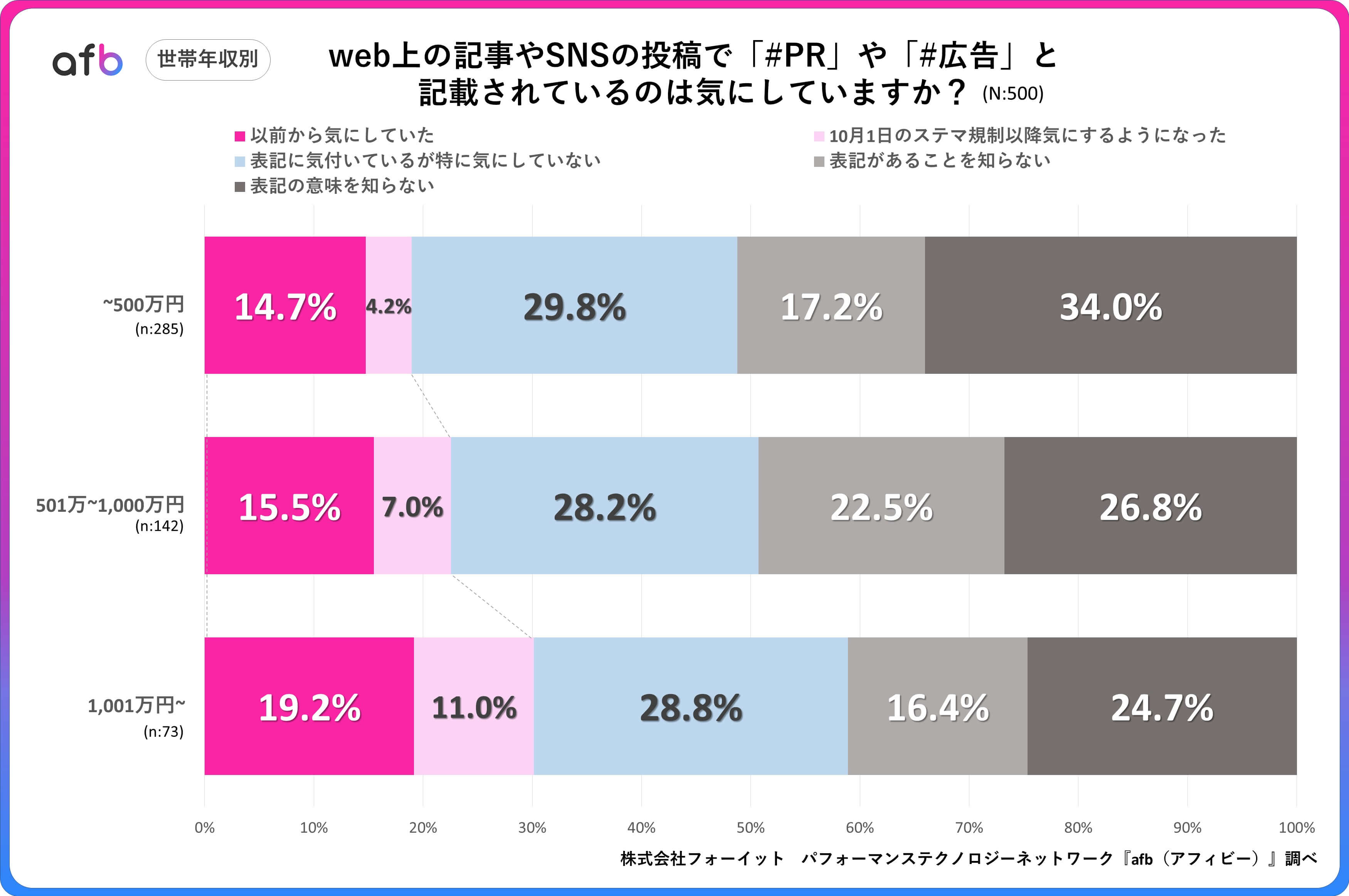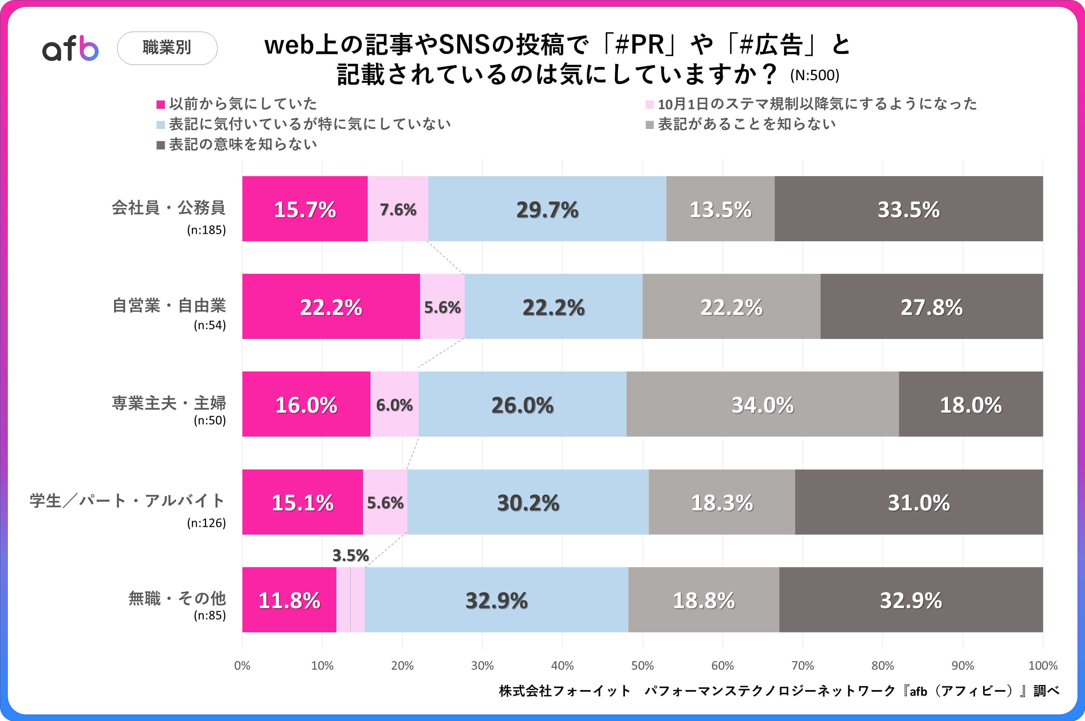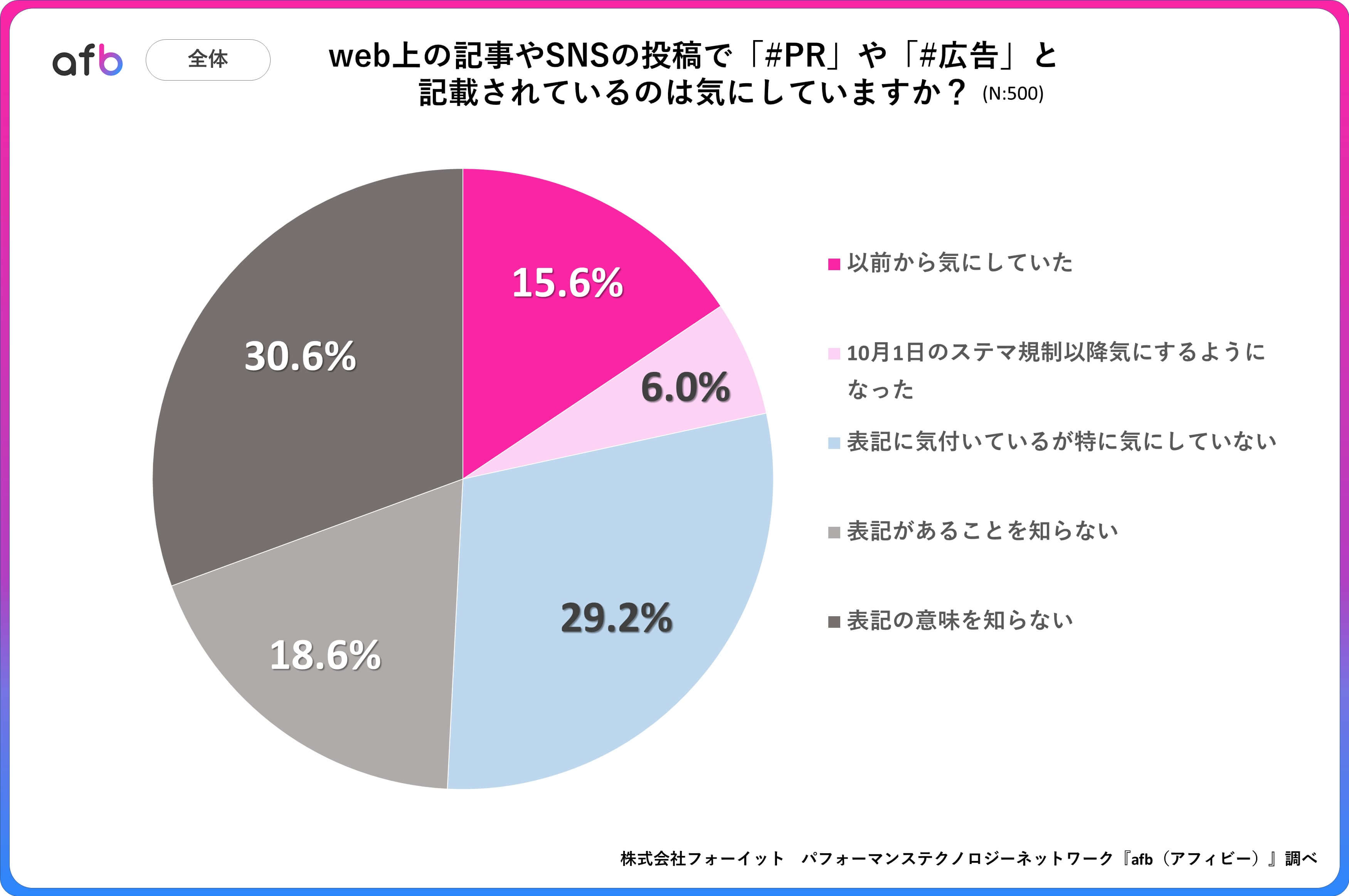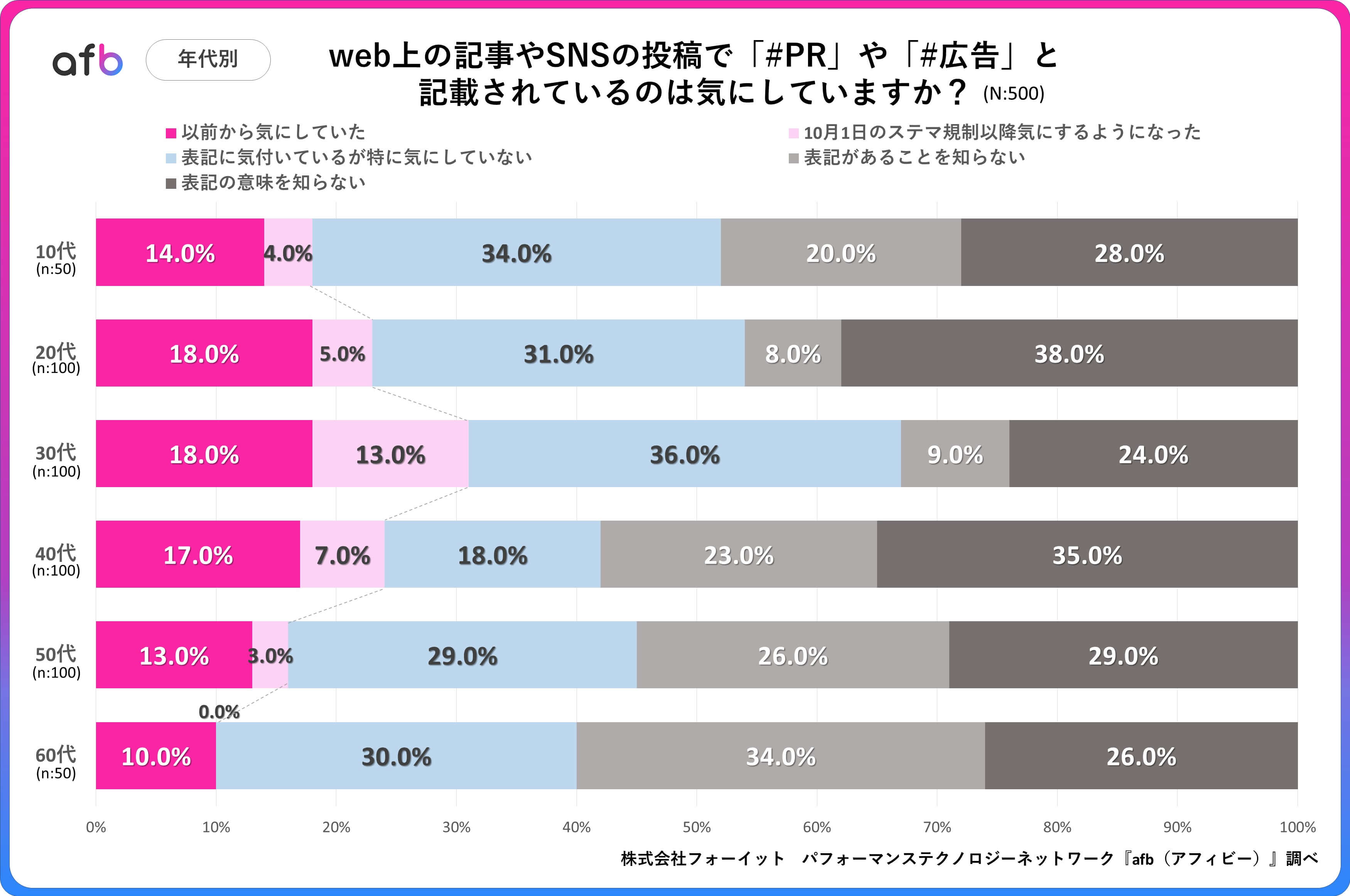 パフォーマンステクノロジーネットワーク「afb(アフィビー)」の開発運用をおこなう株式会社フォーイットは、全国の10代~60代までの男女500人を対象にPR表記に関するアンケートを実施し、年代別・職業別等の特徴についてまとめました。