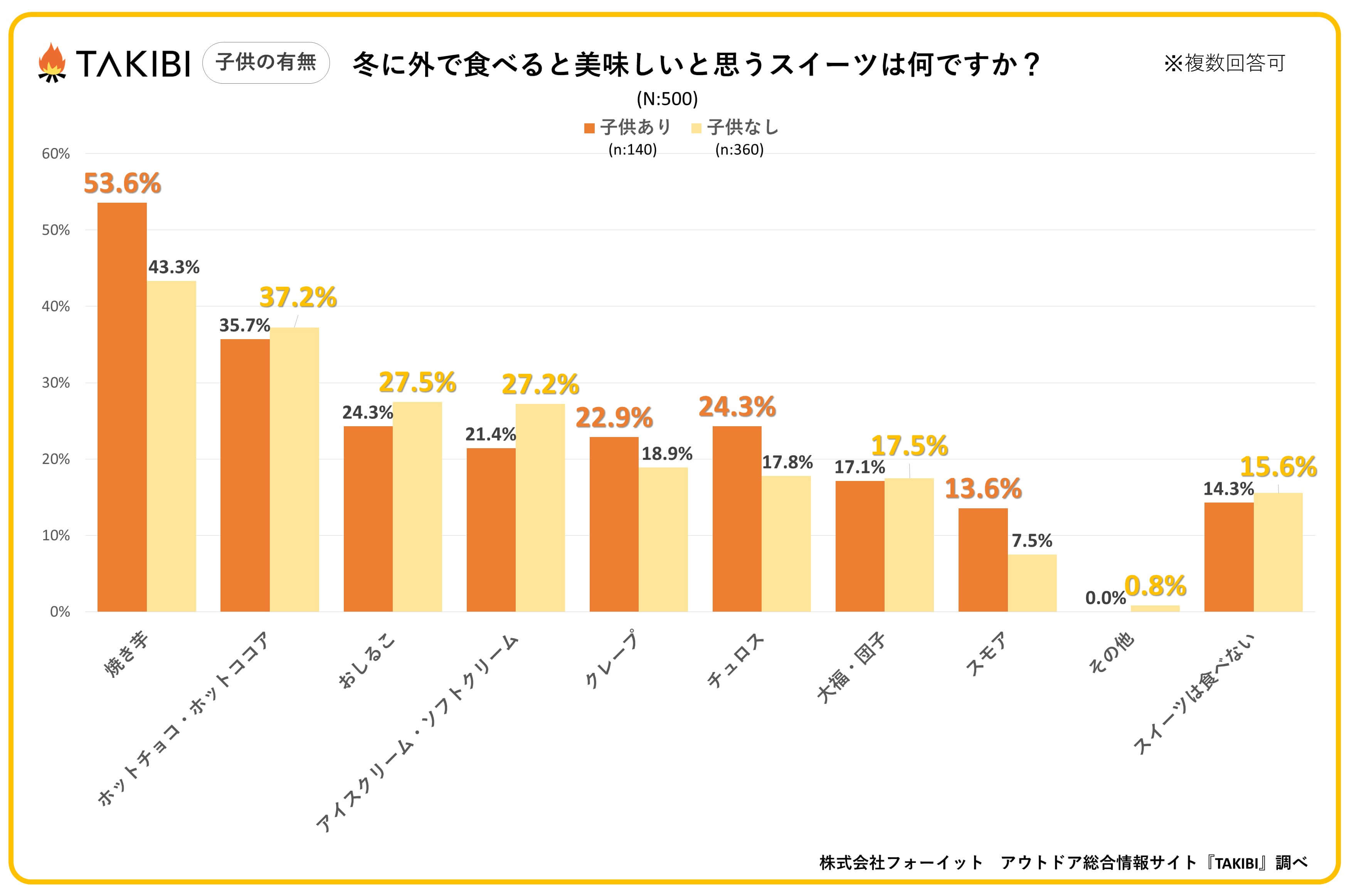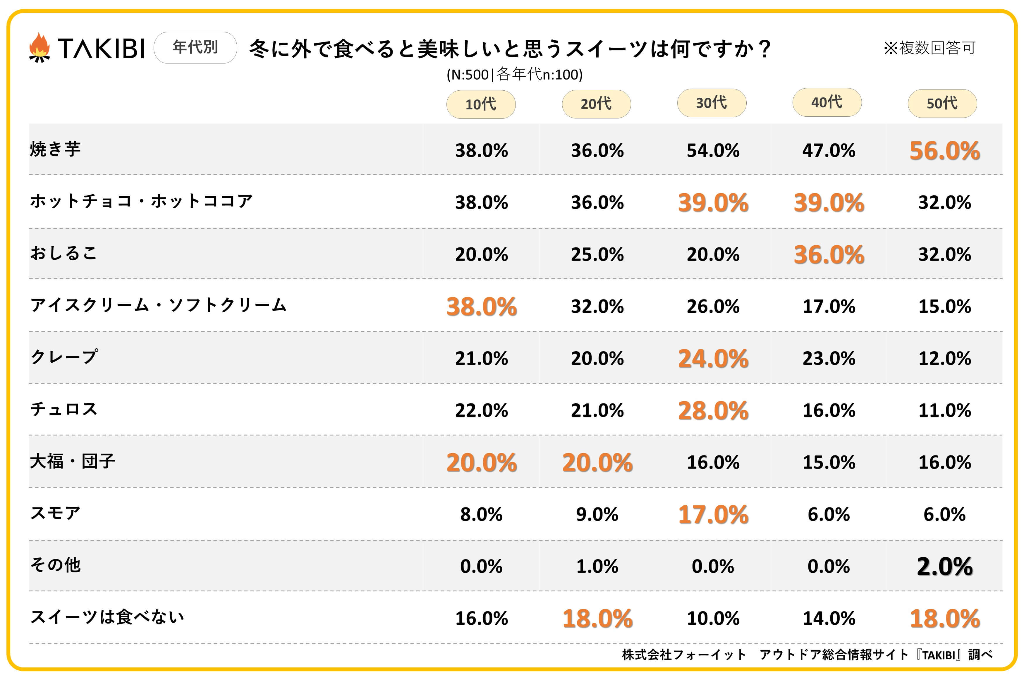 キャンプやグランピングを中心としたアウトドア総合情報サイト「TAKIBI」の運営をおこなう株式会社フォーイットは、全国の10代~50代までの男女500人を対象に冬のスイーツに関するアンケートを実施し、男女別・年代別等の特徴についてまとめました。