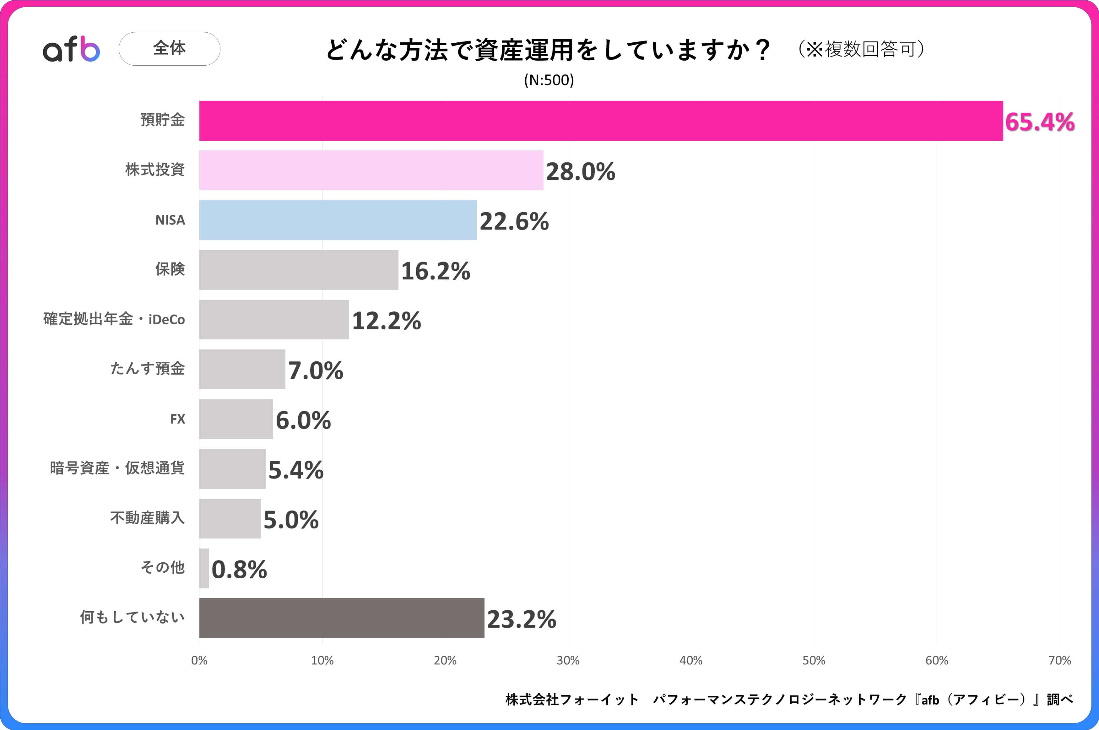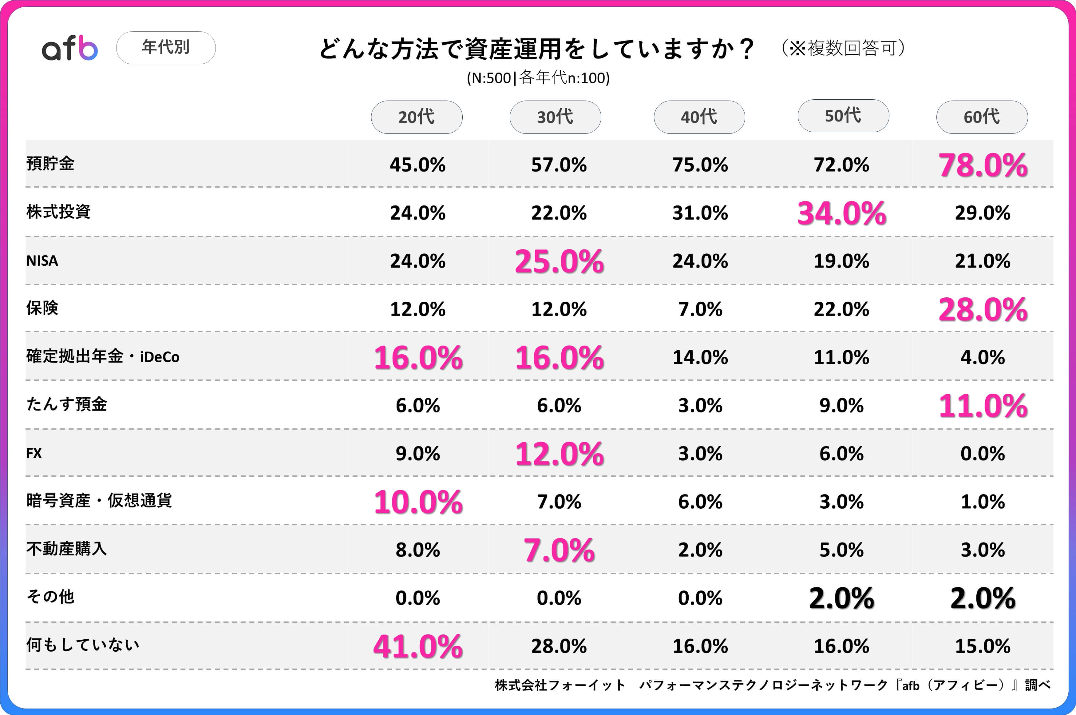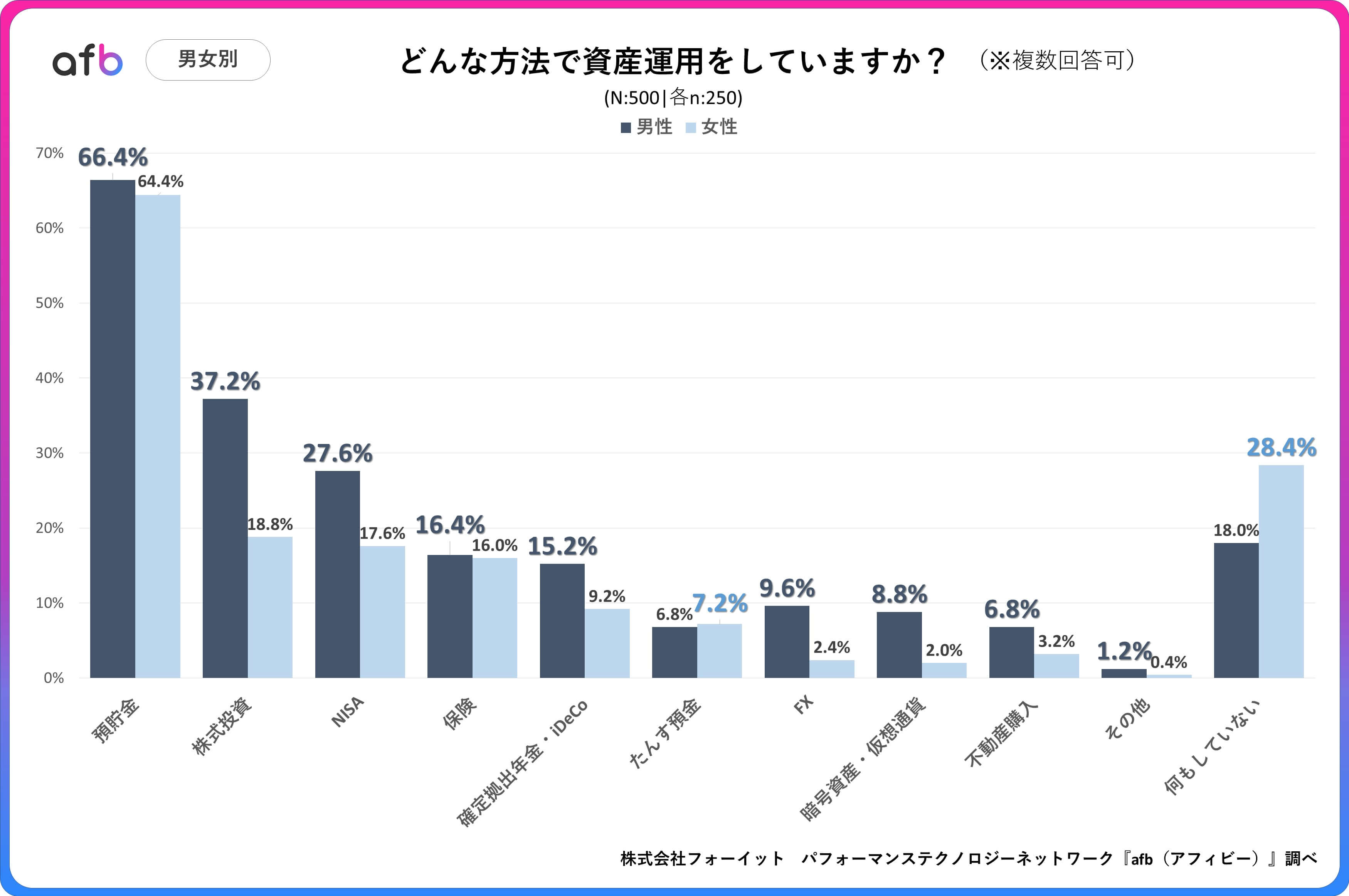 パフォーマンステクノロジーネットワーク「afb(アフィビー)」の開発運用をおこなう株式会社フォーイットは、全国の20代~60代までの男女500人を対象に資産運用の方法に関するアンケートを実施し、年代別・男女別等の特徴についてまとめました。