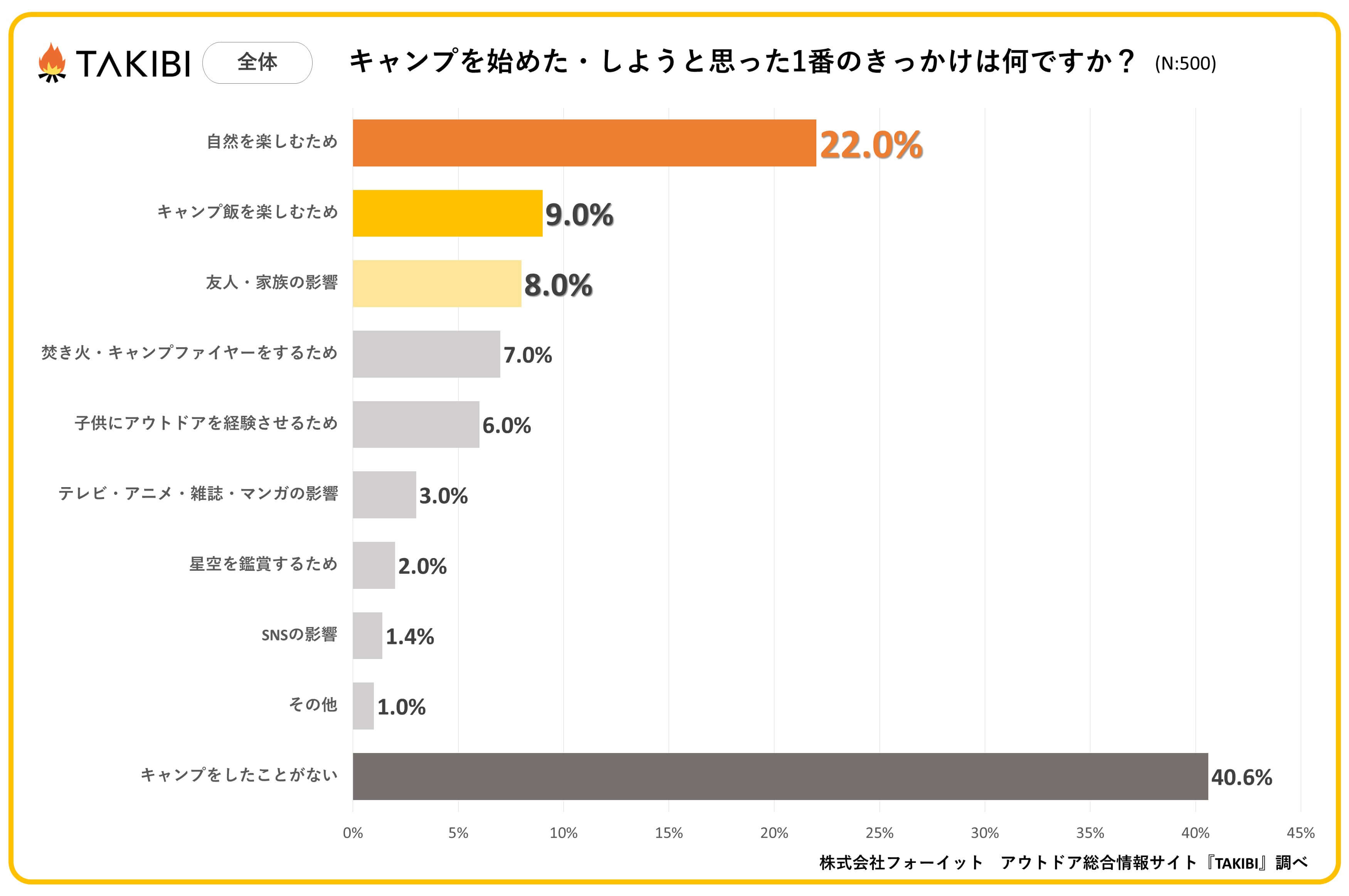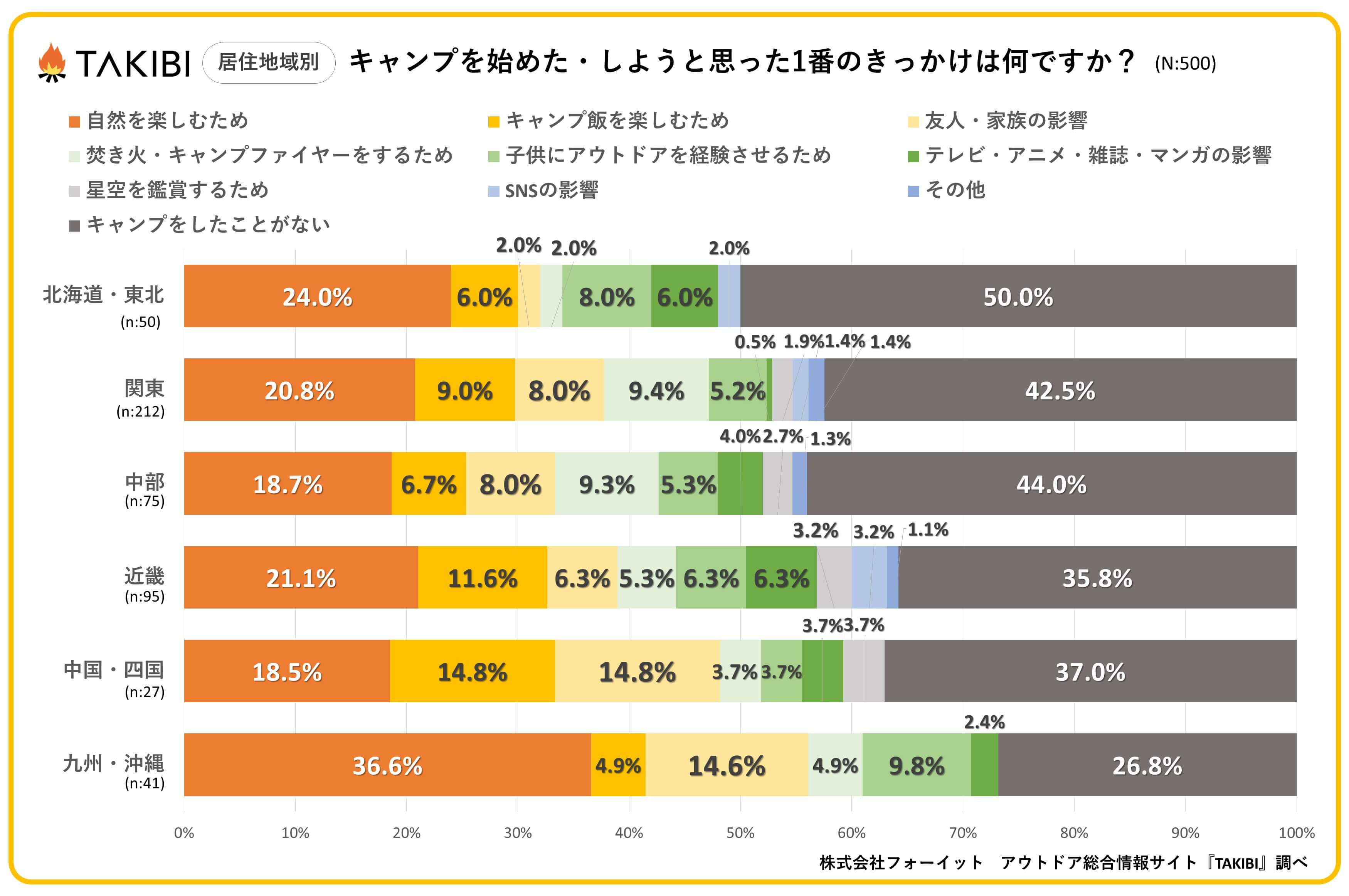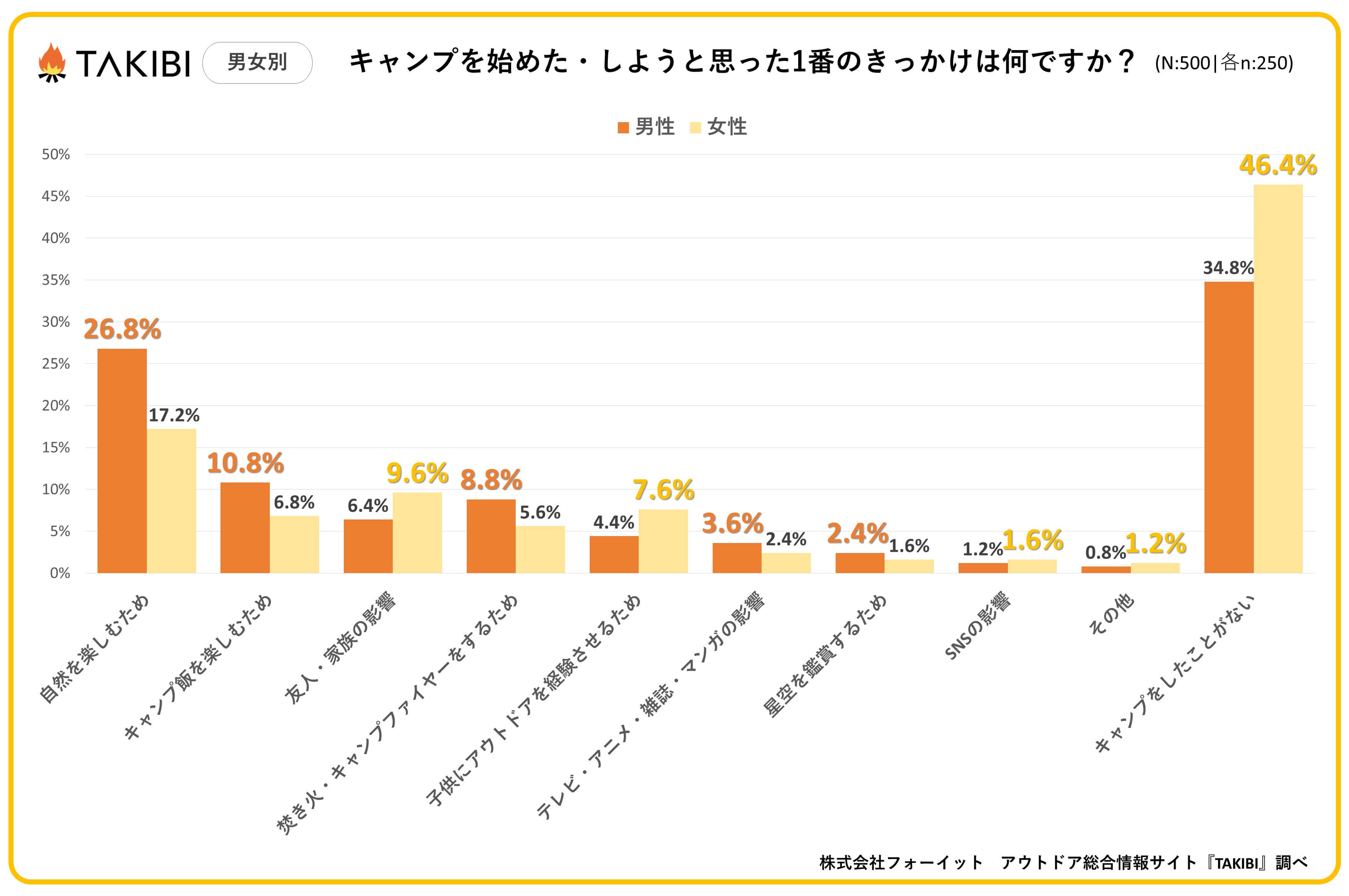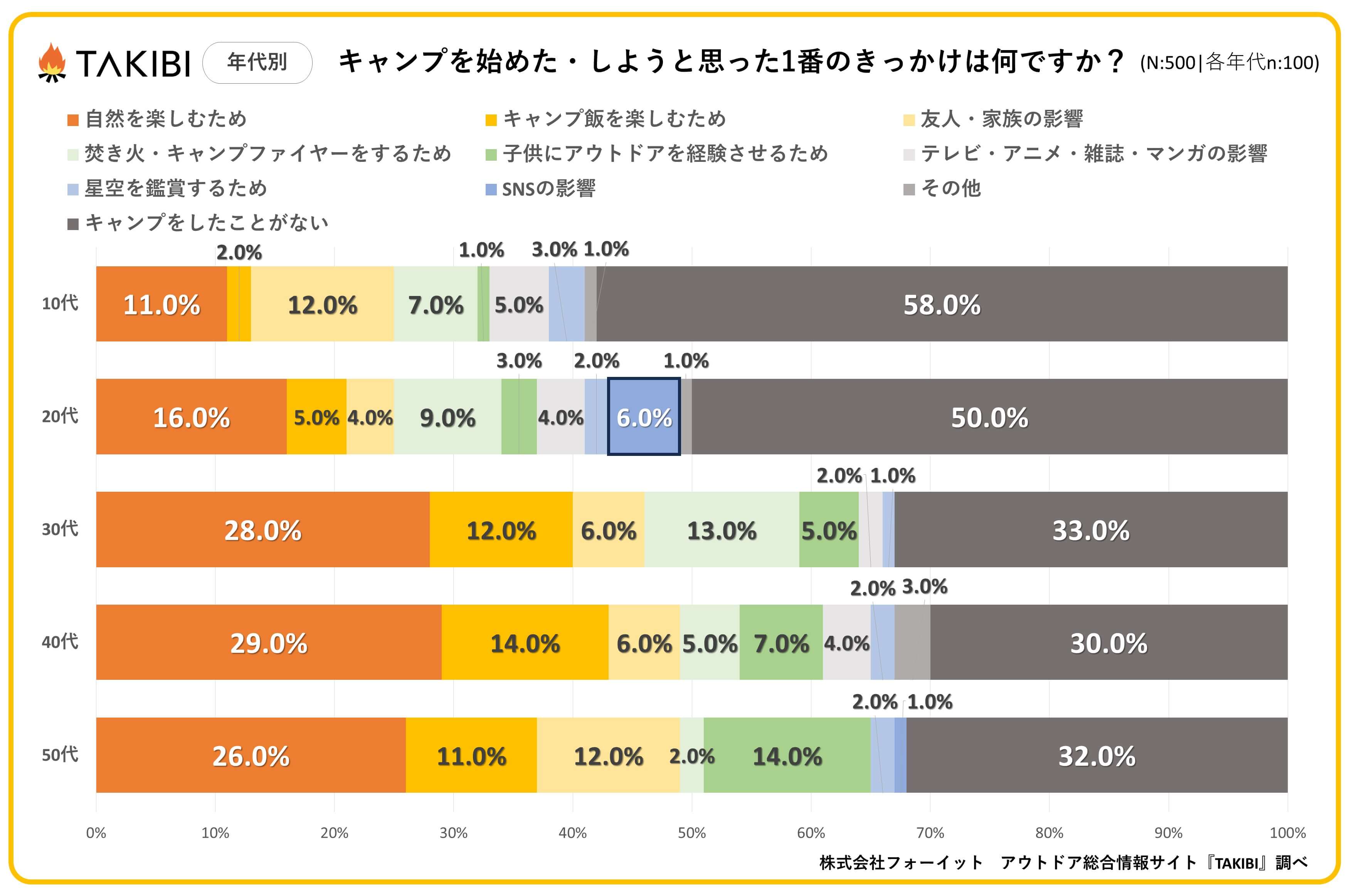 キャンプやグランピングを中心としたアウトドア総合情報サイト「TAKIBI」の運営をおこなう株式会社フォーイットは、全国の10代~50代までの男女500人を対象にキャンプのきっかけに関するアンケートを実施し、男女別・年代別等の特徴についてまとめました。