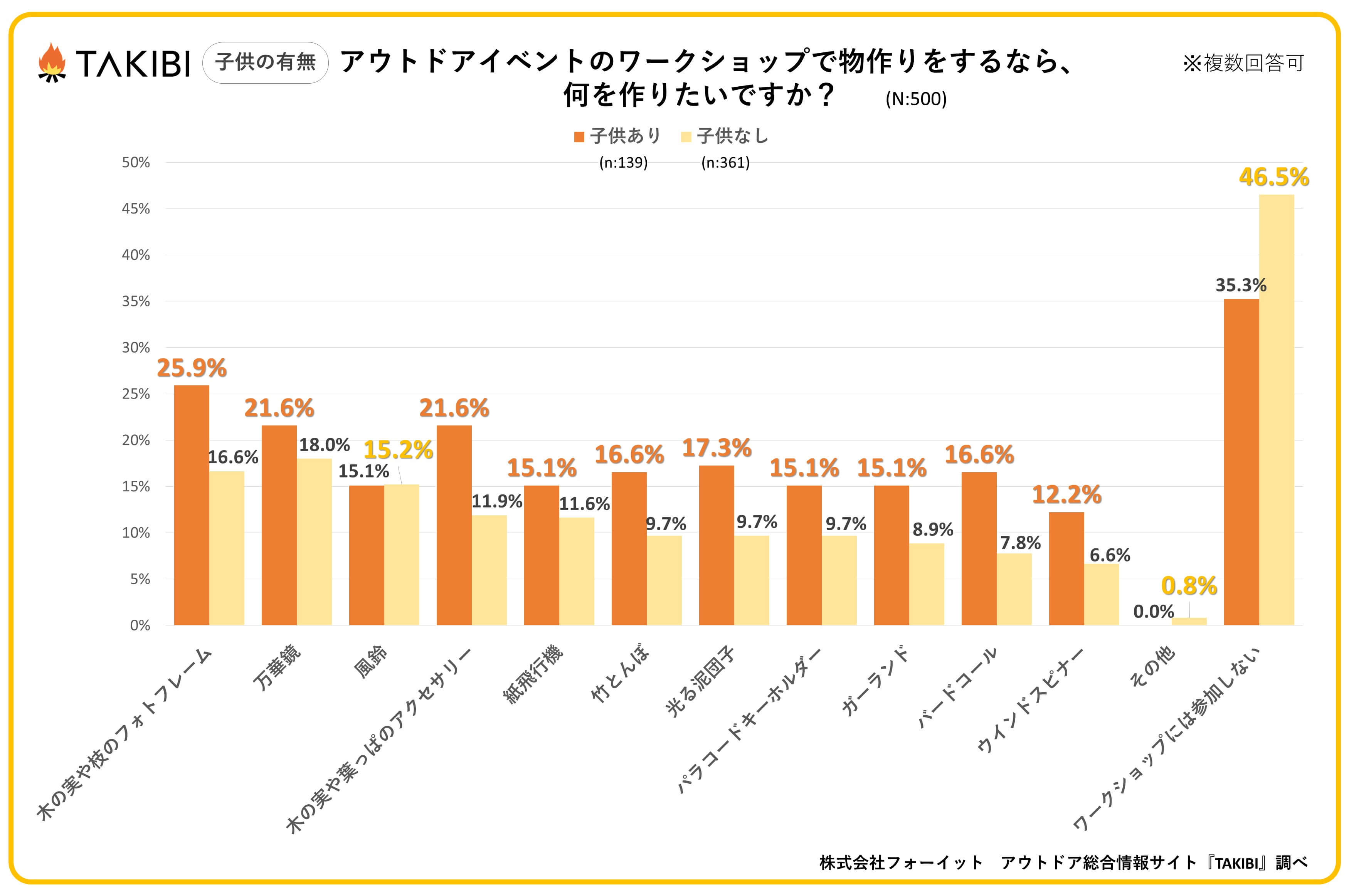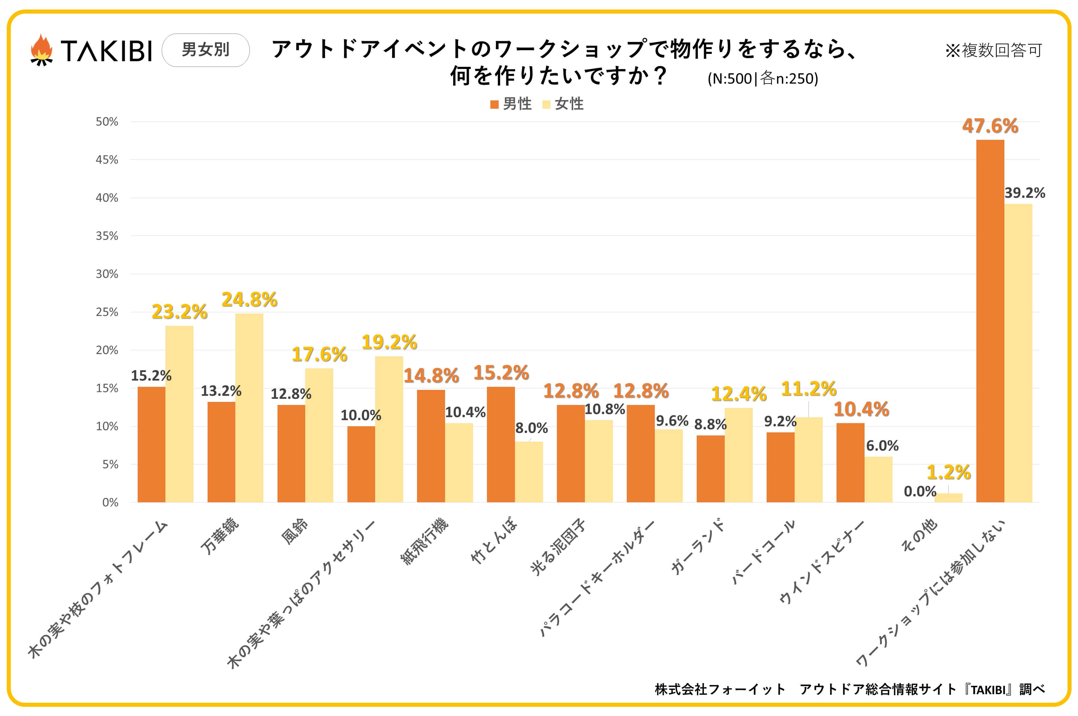 キャンプやグランピングを中心としたアウトドア総合情報サイト「TAKIBI」の運営をおこなう株式会社フォーイットは、全国の10代~50代までの男女500人を対象にアウトドアイベントでのワークショップに関するアンケートを実施し、男女別・年代別等の特徴についてまとめました。